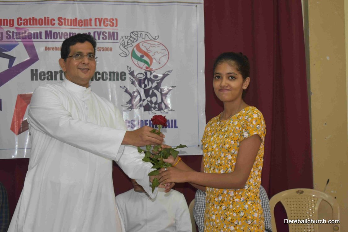 Later a formal function was organized for the youth and their parents. On the dais were Fr Austin Peres – Parish Priest, Fr Gratian – Residential Priest, Mr. Lanwin Lobo – Resource Person, Mr. Prajwal Sequeira – YCS Diocesan Animator and Shawn Pinto – YCS President, Derebail Unit. The programme started with a prayer song followed by a Welcome speech by Prince Serrao – YCS Vice President. A short message was shared by both the Priest. The distinction holders were also honored. Mr. Lanwin Lobo the resource person for the day addressed the parents and the youth regarding YCS by conducting a few activities and emphasizing the role of youth as an individual.