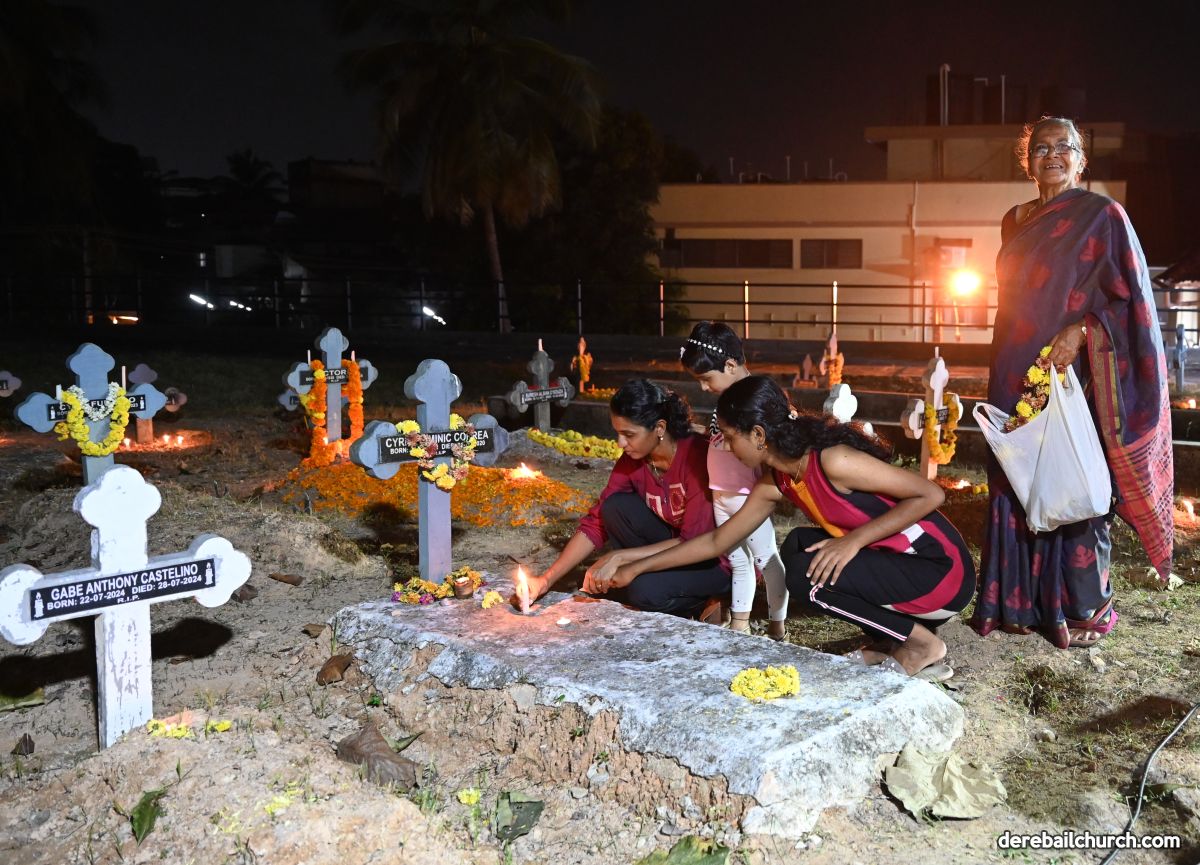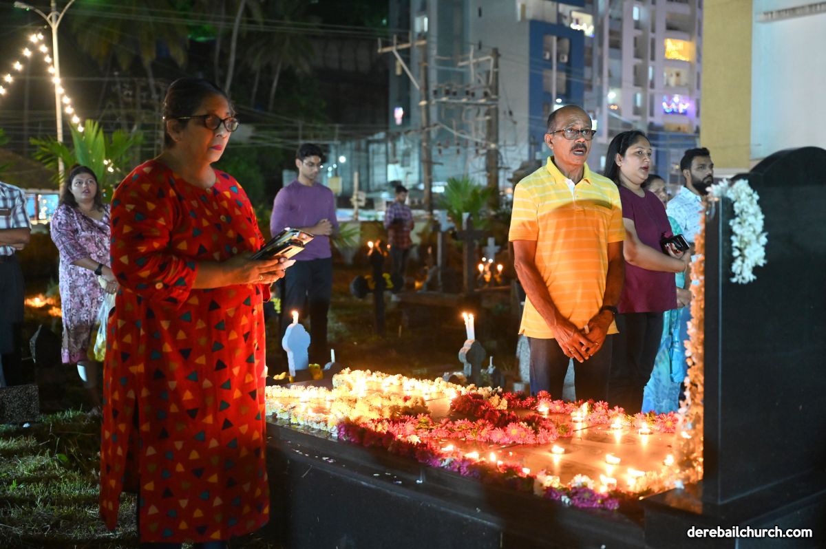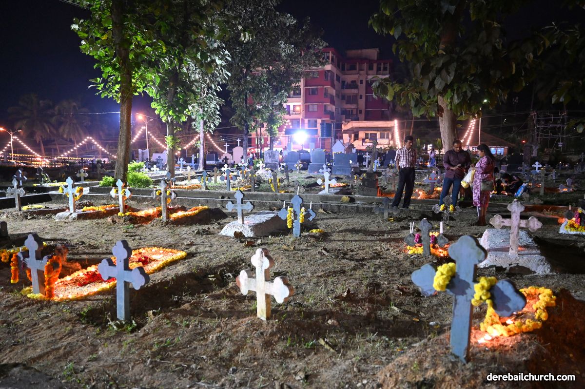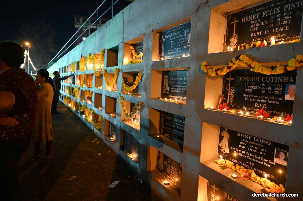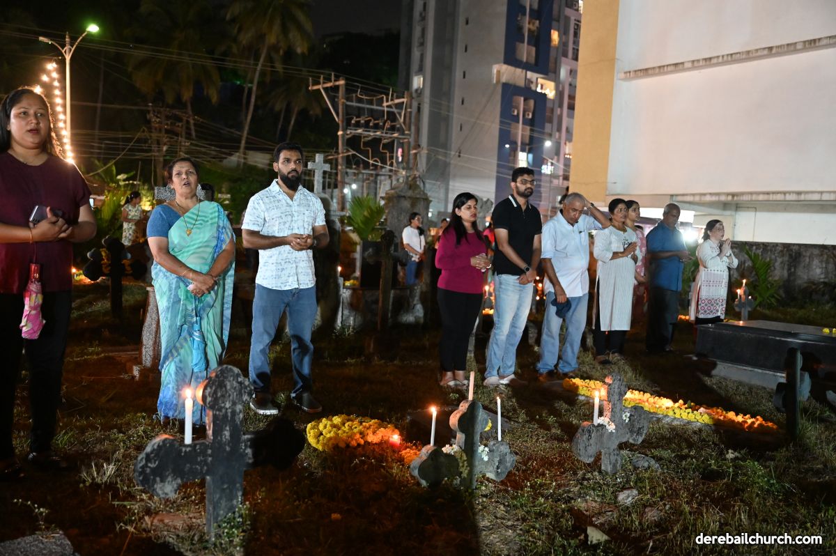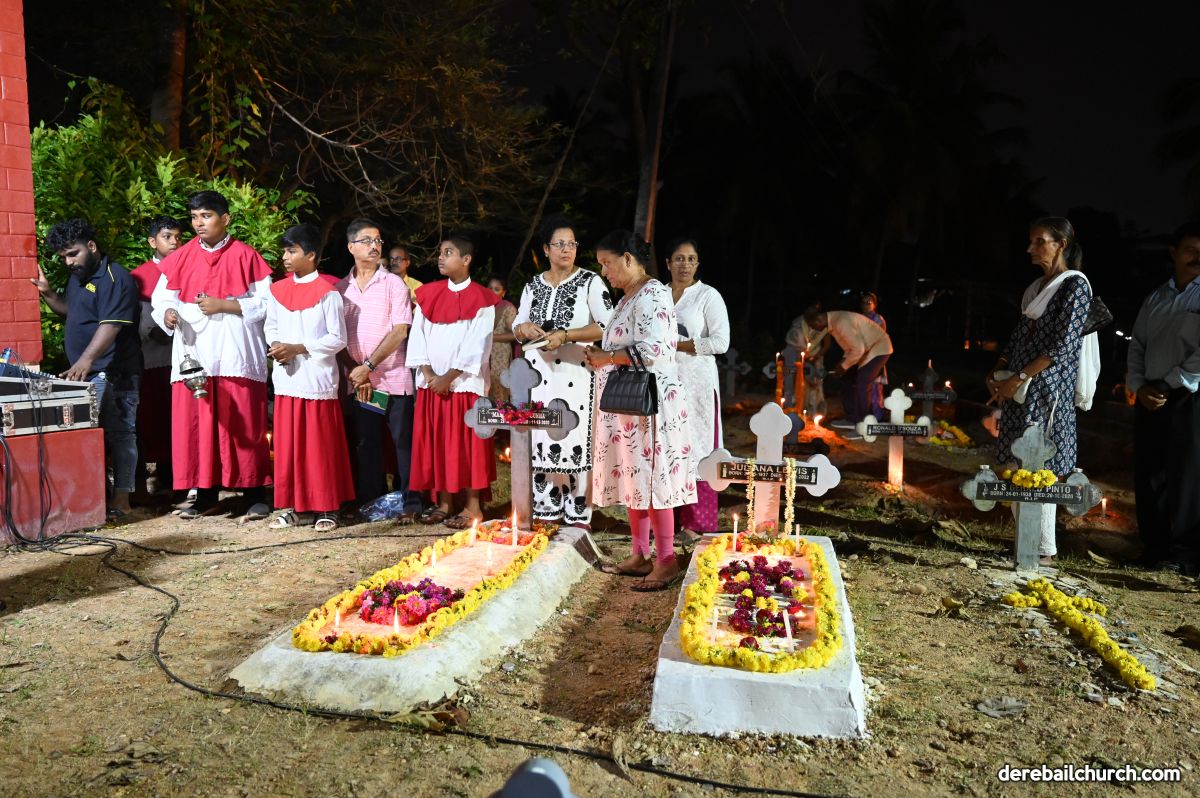 The solemn masses for All Saints Day on 1st November were held at 6.15 am and 5.30 pm at Most Holy Redeemer Church Derebail. On the same day, after the 5.30 pm mass a short prayer was held at the Church Cemetery on the account of All Souls Day. Following the prayer, the Parish Priest Rev. Fr. Joseph Martis and the Associate Parish Priest Rev. Fr. Kevin Dsouza sprinkled Holy Water on all the graves in the cemetery. Parishioners stood beside the tombstones of their dearly departed family members and took part in the prayer. Despite the dark, the Church Cemetery illuminated with the candles and flowers that were placed on the graves of the parishioners. As All Souls Day is observed on 2nd November, masses were also held at 6.15 and 7.15 am. While All Souls Day acts as a yearly ritual to commemorate their loved ones, it also enables Catholics to reaffirm their faith in Christ.