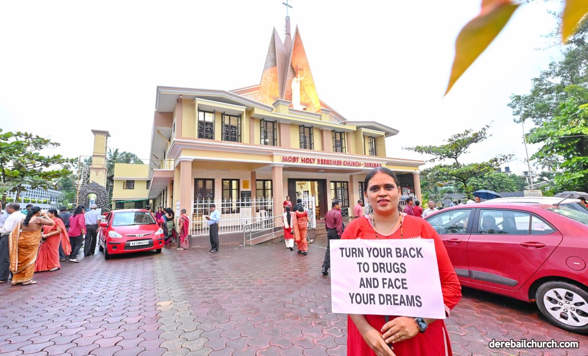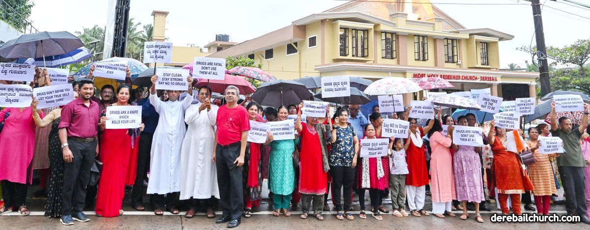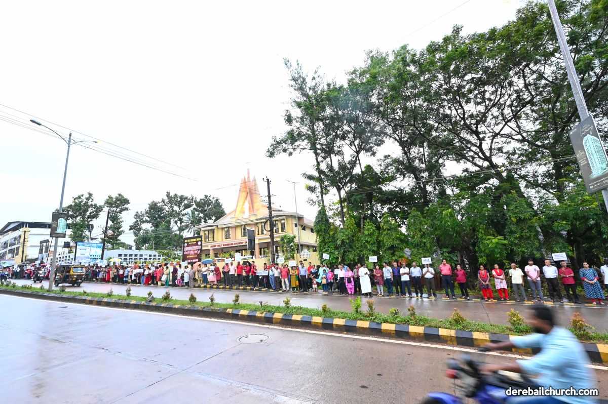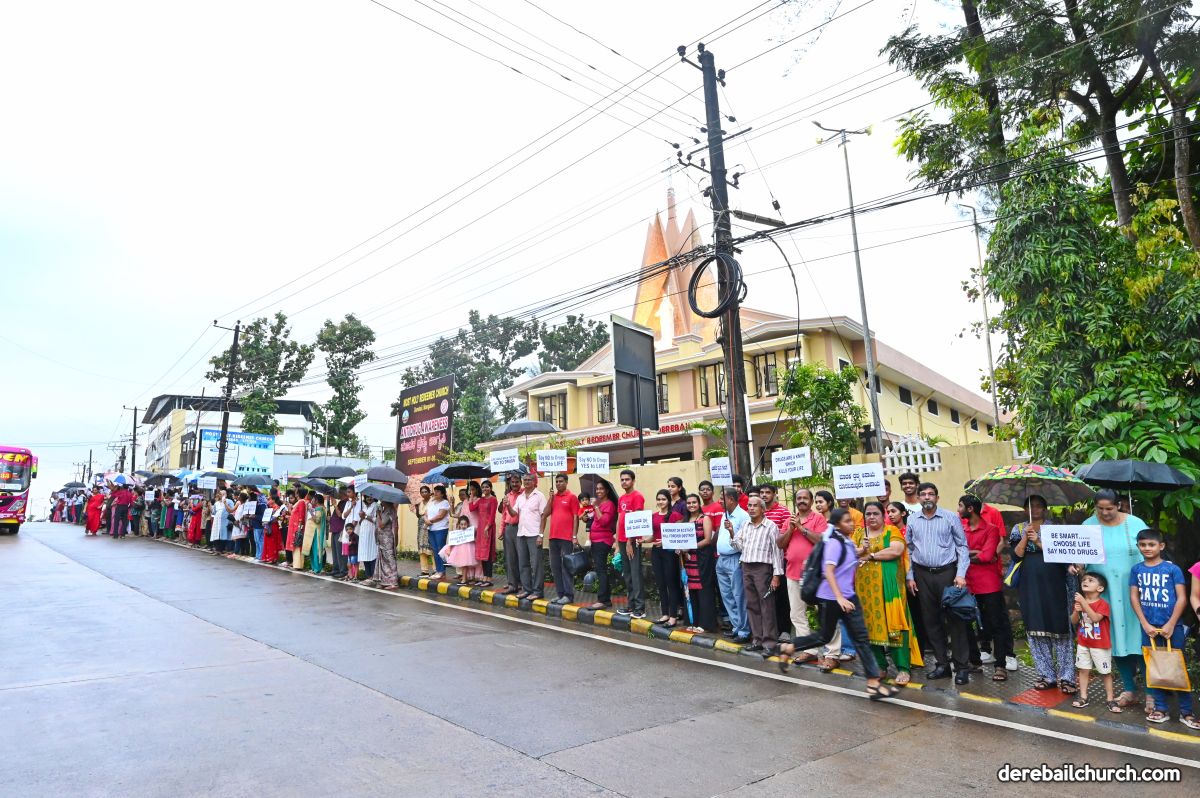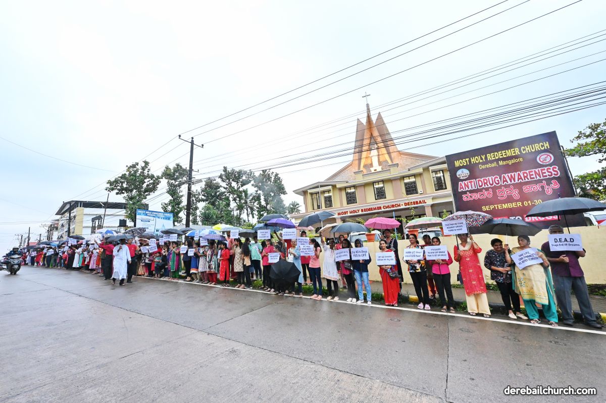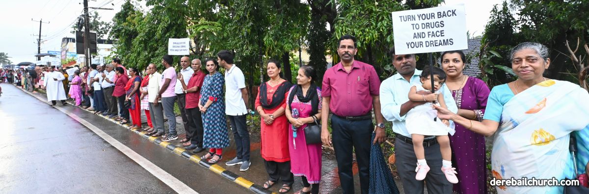 The month long Anti-drug Awareness Campaign reached its zenith at Derebail Church on Saturday 30th September with a public gathering organized by the Parish Community. At 6.00 in the evening, the parishioners stood in line in front of the Church along the foot path holding slogans against drugs and its nefarious effects on the society and family. The commuters slowed down their vehicles and watched the movement with a sense of appreciation and gratefulness. Nearly five hundred people participated in the event. Derebail parish has taken active and vigorous participation in the anti-drug awareness programme launched by the Diocese of Mangalore organizing various awareness competitions, such as skits, reels, selfies, captions and such other. Children, youth and adults have actively participated in all the activities with zest and zeal. Our efforts will continue to make our society drug free. Thanks to all the animators and participants.