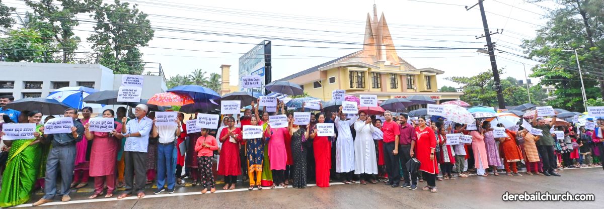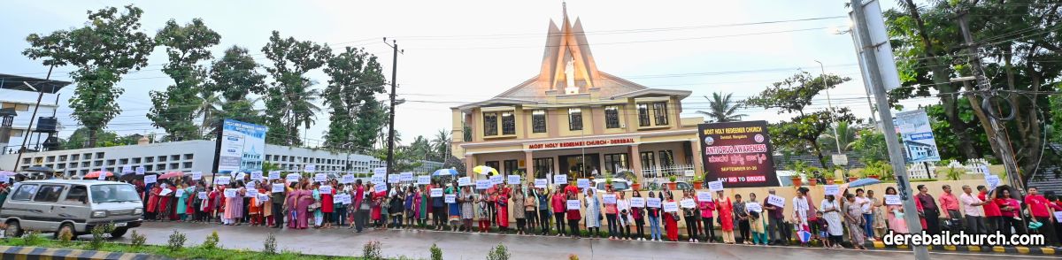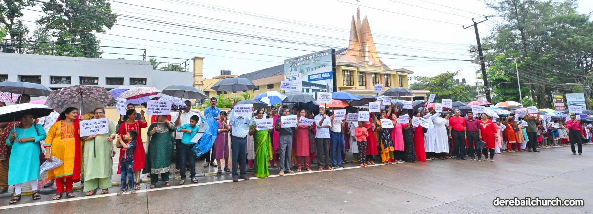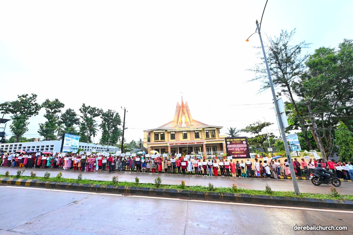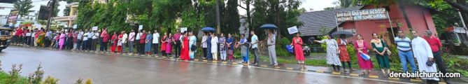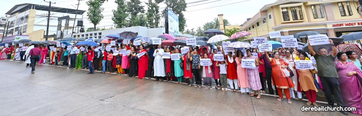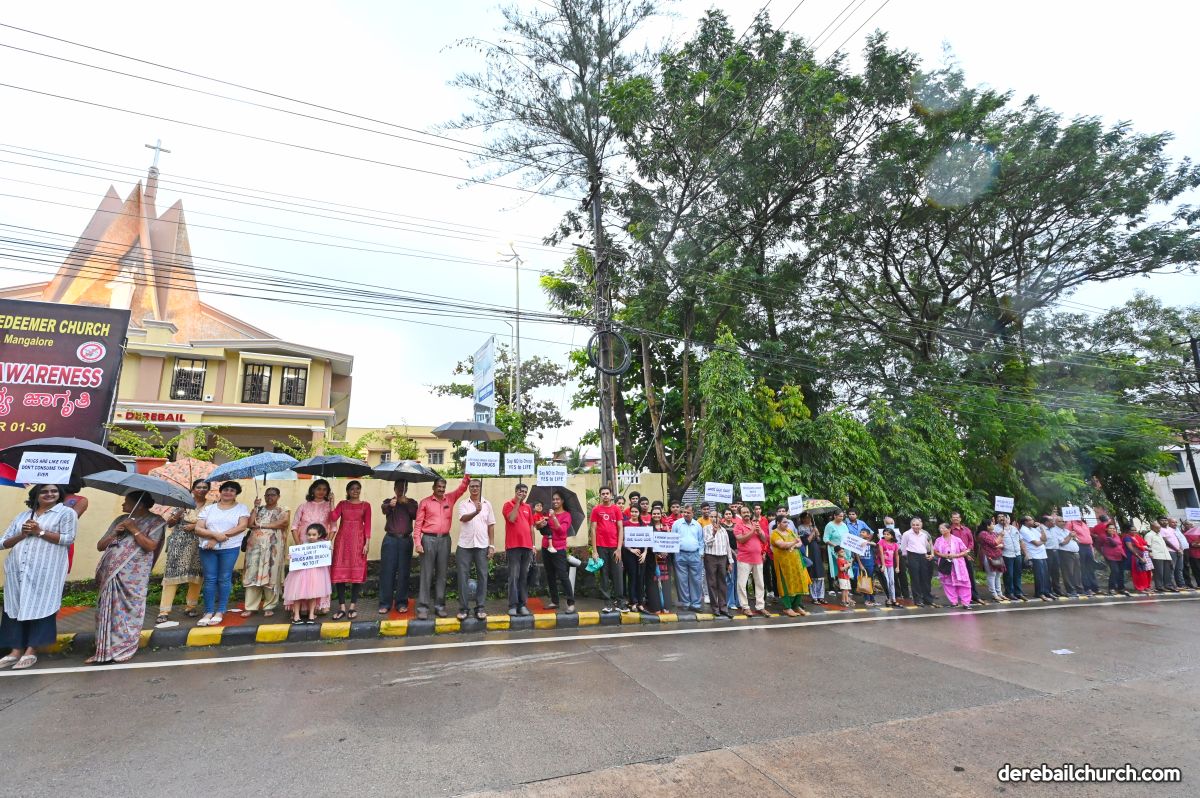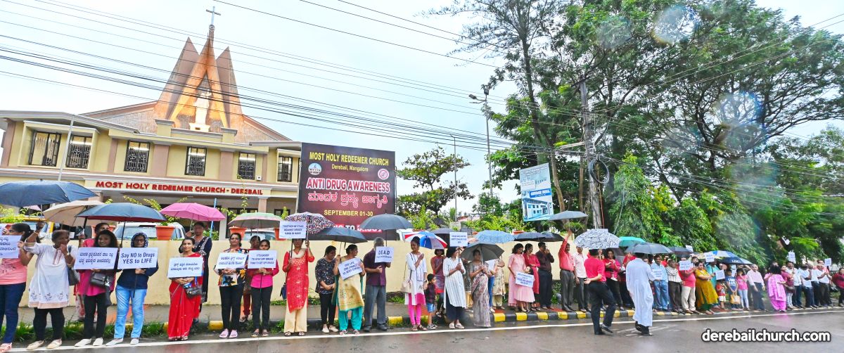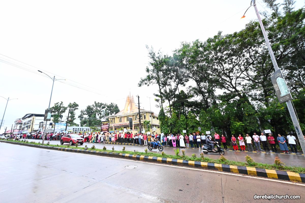 The month long Anti-drug Awareness Campaign reached its zenith at Derebail Church on Saturday 30th September with a public gathering organized by the Parish Community. At 6.00 in the evening, the parishioners stood in line in front of the Church along the foot path holding slogans against drugs and its nefarious effects on the society and family. The commuters slowed down their vehicles and watched the movement with a sense of appreciation and gratefulness. Nearly five hundred people participated in the event. Derebail parish has taken active and vigorous participation in the anti-drug awareness programme launched by the Diocese of Mangalore organizing various awareness competitions, such as skits, reels, selfies, captions and such other. Children, youth and adults have actively participated in all the activities with zest and zeal. Our efforts will continue to make our society drug free. Thanks to all the animators and participants.