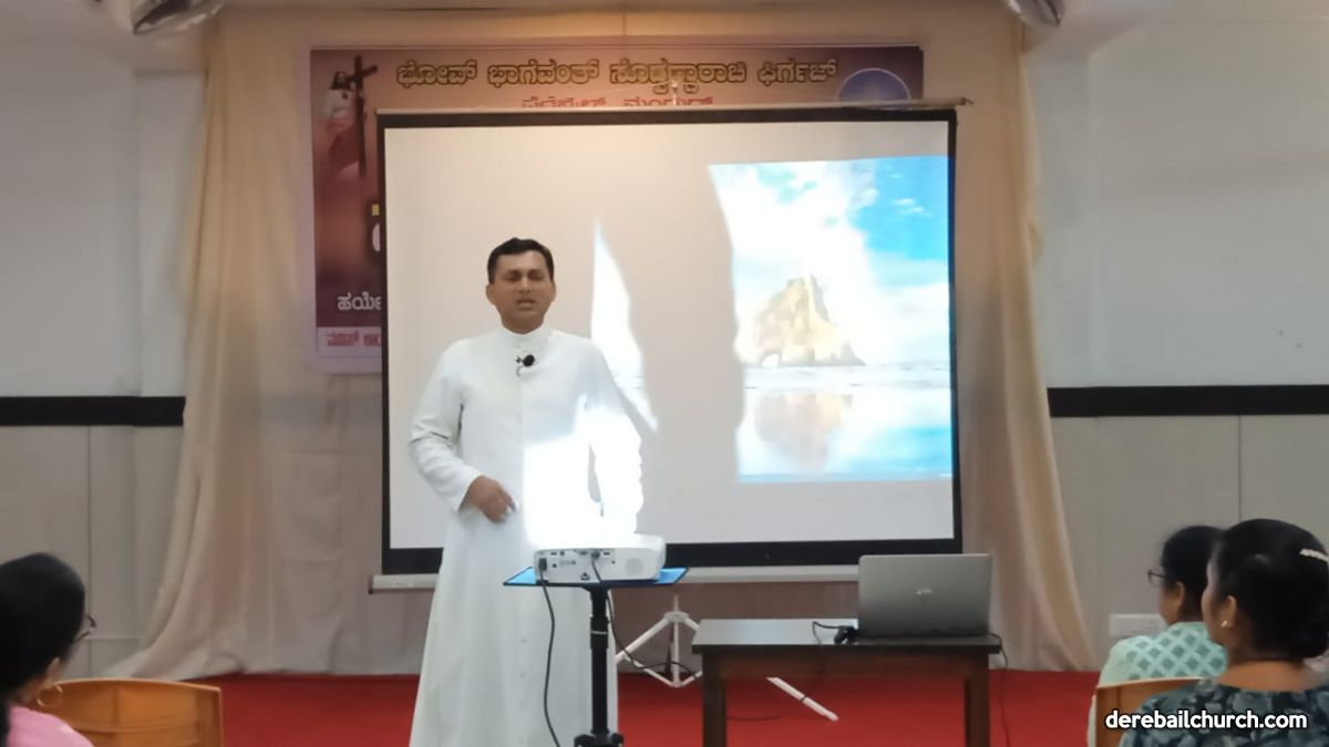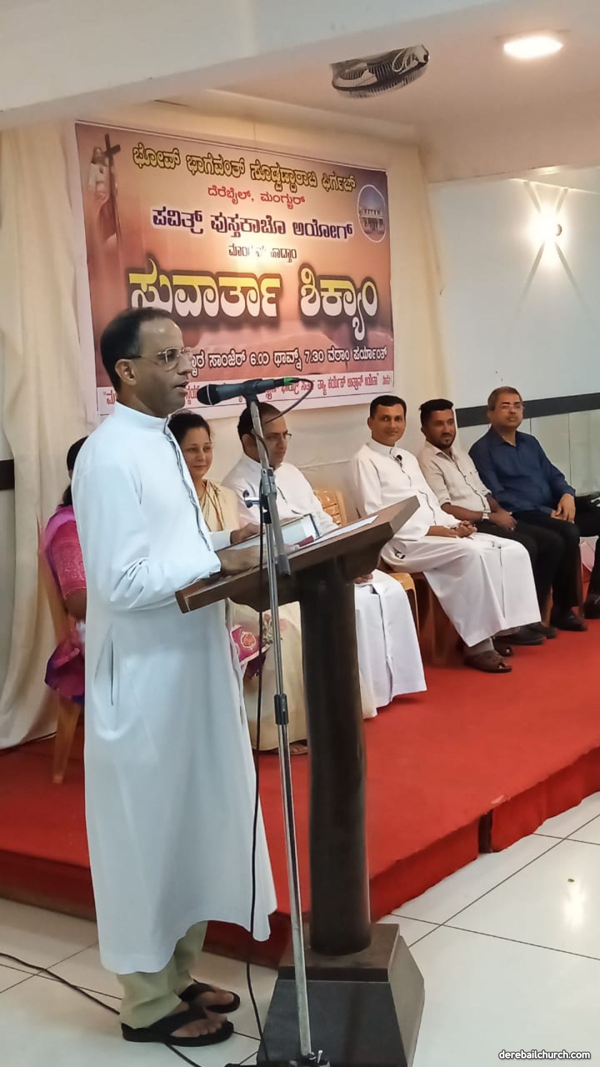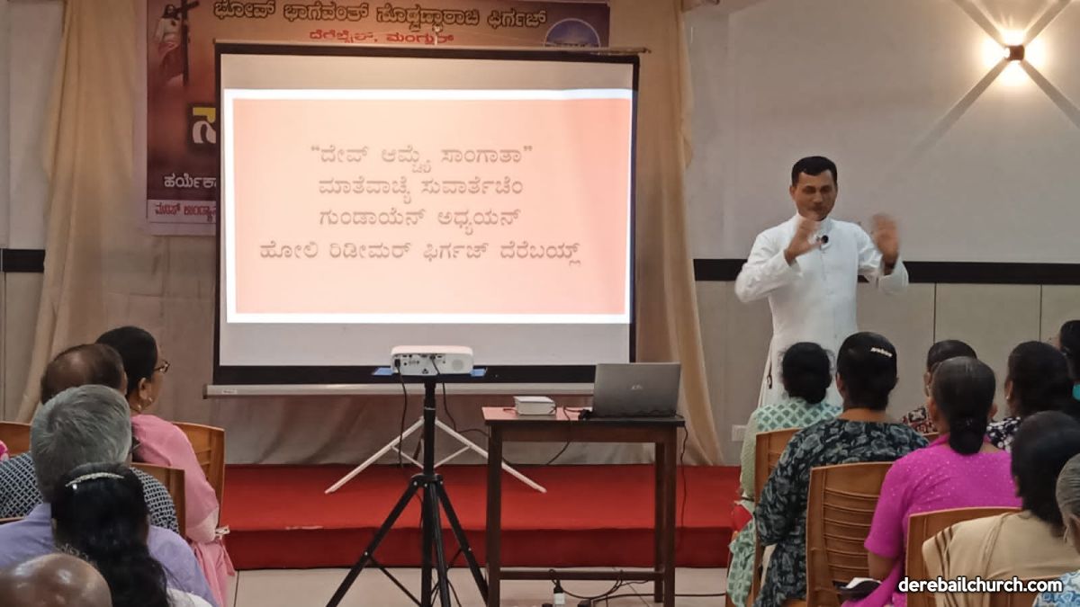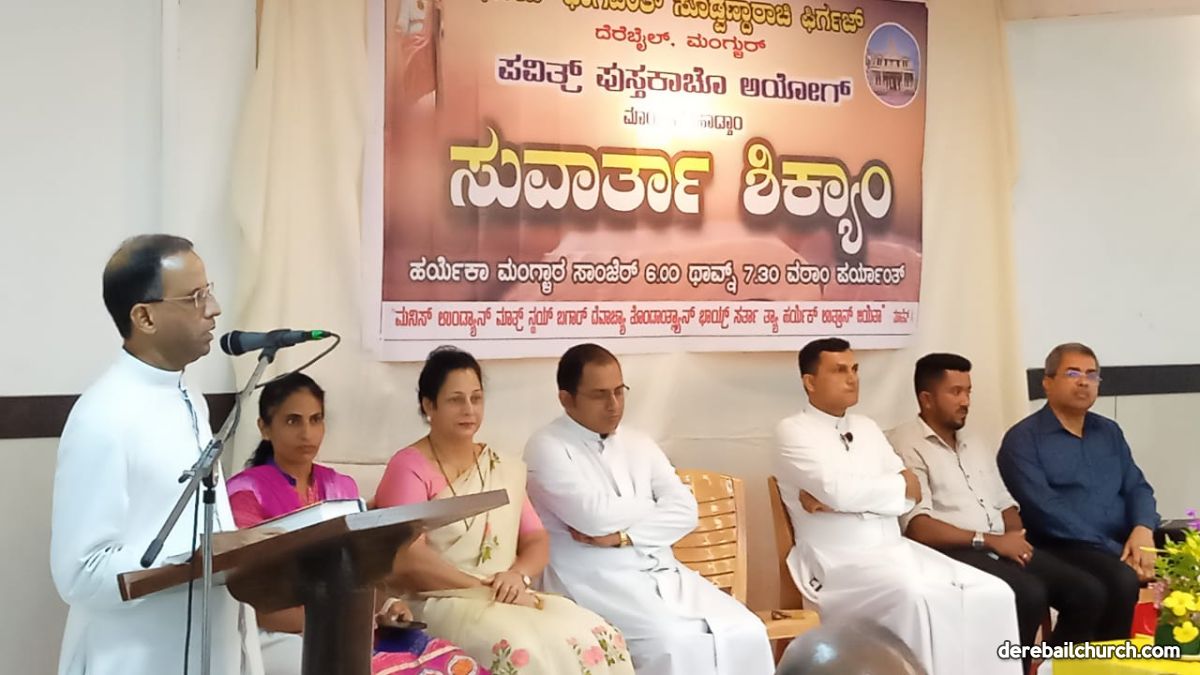 Derebail Parish solemnly inaugurated the Bible classes on Tuesday, 4th June at 6.15 in the evening at the Banquet Hall. The programme began with honoring of the Bible with a garland. Fr Kevin the assistant Parish Priest read a passage from the Bible and made a short prayer. Rev. Fr Joseph Martis, happily welcomed the gathering, very specially the resource person Rev. Dr Vincent Sequeira. In his inaugural address, the Parish Priest, underscored the need to study the Bible. Quoting Pope Francis he said: “The Word of God is a powerful antidote to every closure, abstraction, and ideologization of faith. Understood in the Spirit in which it was written, it increases passion for God and man, ignites charity, and revives apostolic zeal.” He continued saying, the Word of God is alive and active, (Hebrews 4:12); it does not die, nor does it age, but it remains for ever (1 Peter 1:25). It stays young in the presence of all that passes away (Matthew 25:35) and preserves those who put it into practice from inner ageing. Bible is inspired by God. It is not merely a historical document but a living word through which God speaks to humanity. Hence Bible has to be read through the lenses of faith. The Word of God heals, enlightens, encourages, brings joy and hope in our lives. Hence it is a God given opportunity for us parishioners to have Bible classes at our door steps. He concluded saying, we need to be enthused and be regular for the classes.