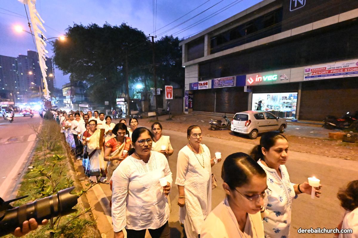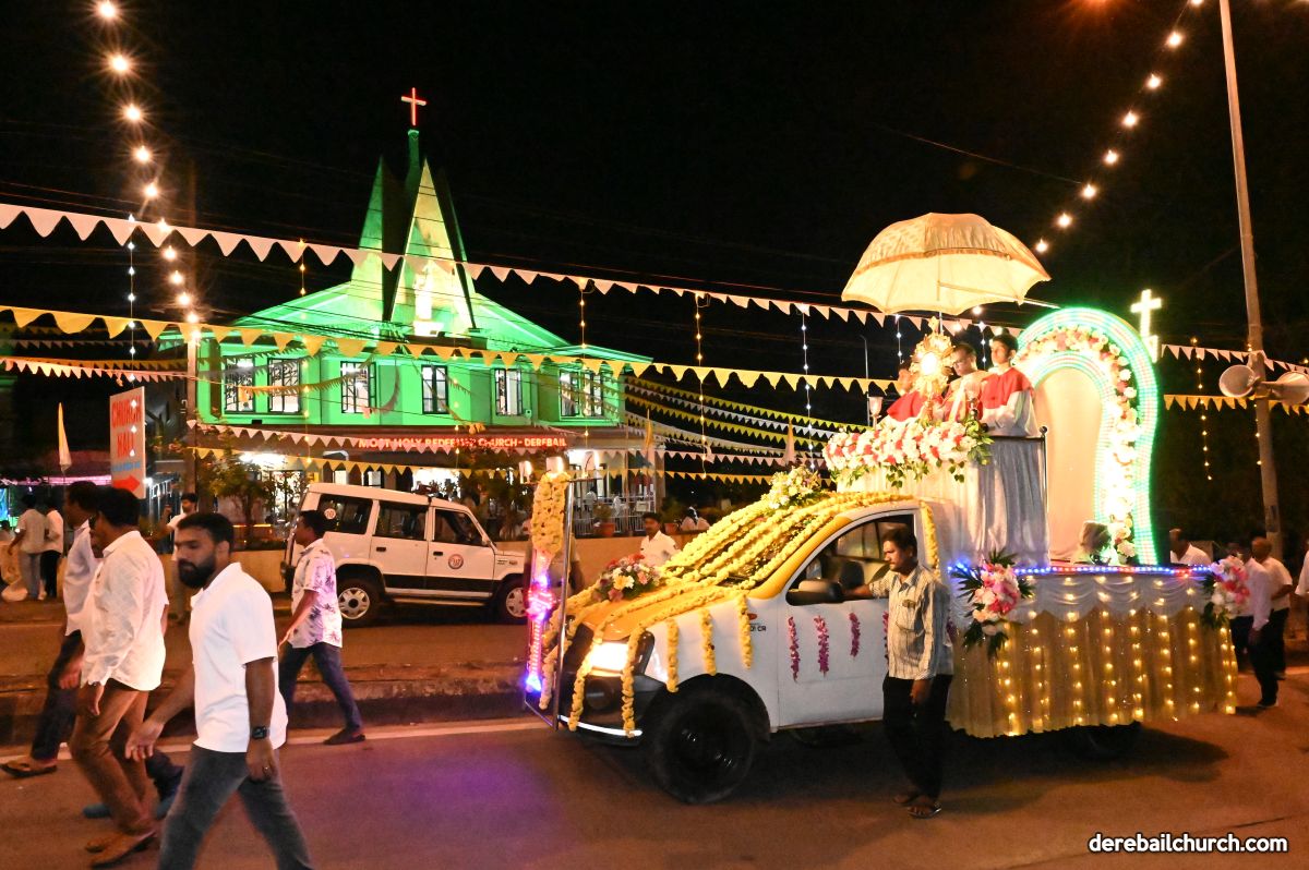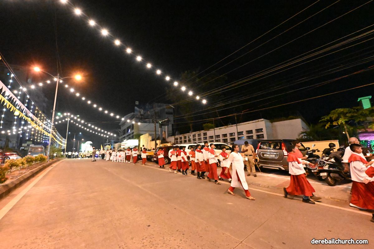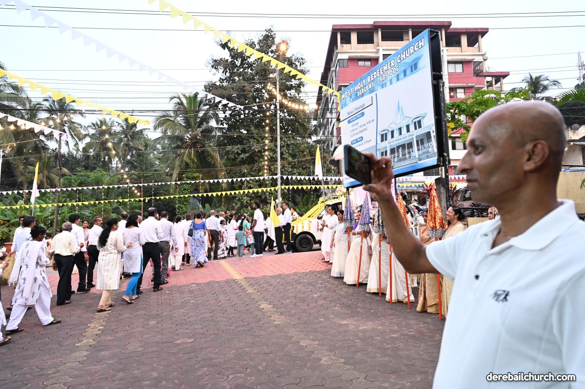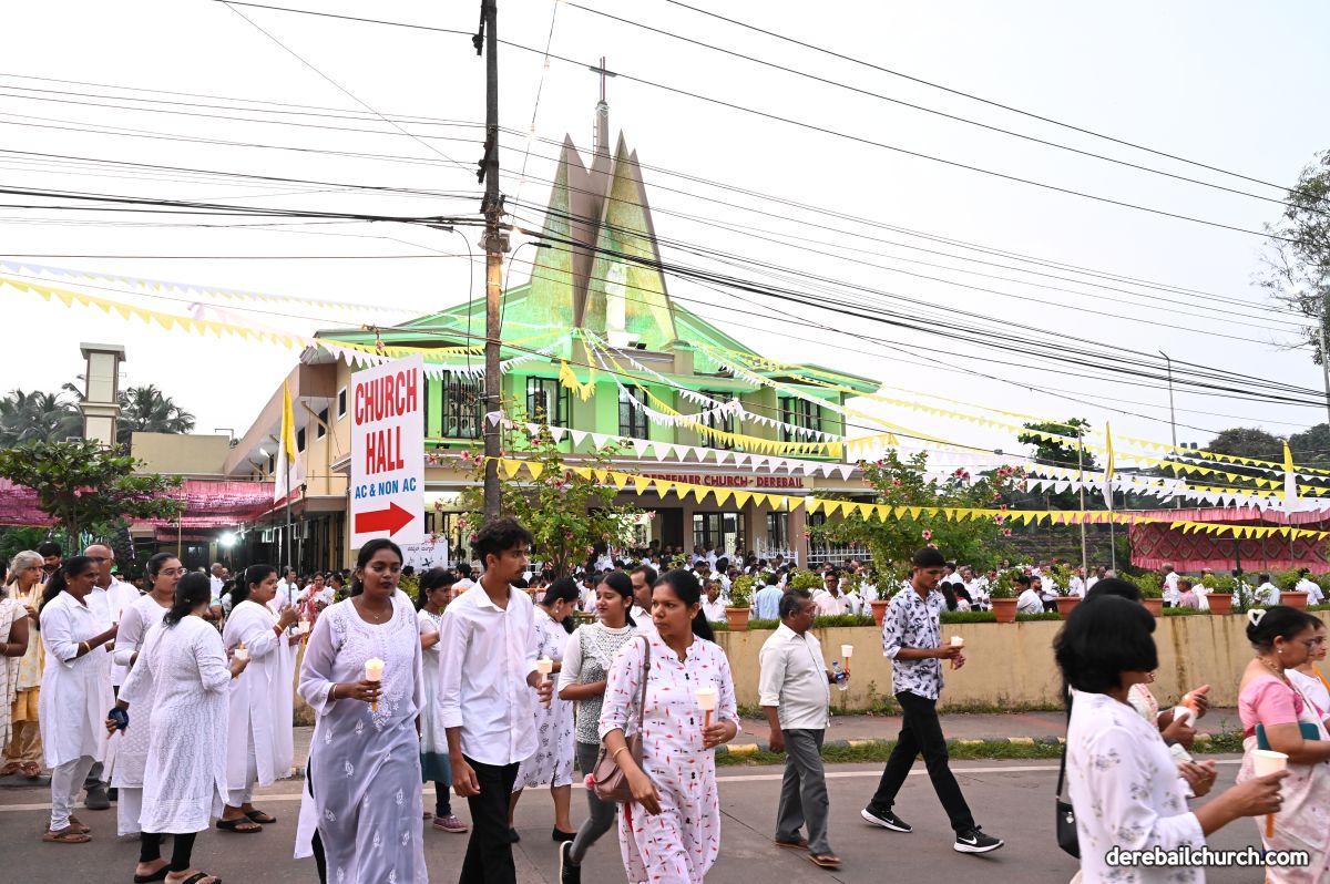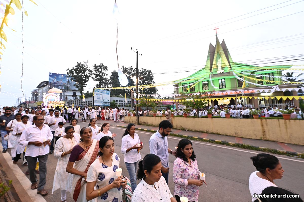 In his closing remarks, Rev. Fr. Joseph Martis thanked Rev. Fr. Denis D'Sa, the parishioners, parish associations, and the youth of Derebail for their enthusiastic participation. The Kannada commentary during the procession was provided Ms. Monti Andrade