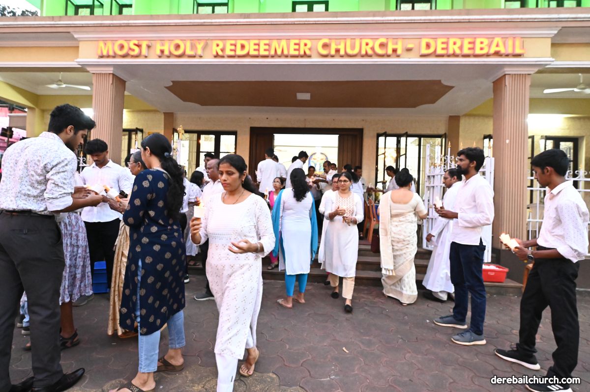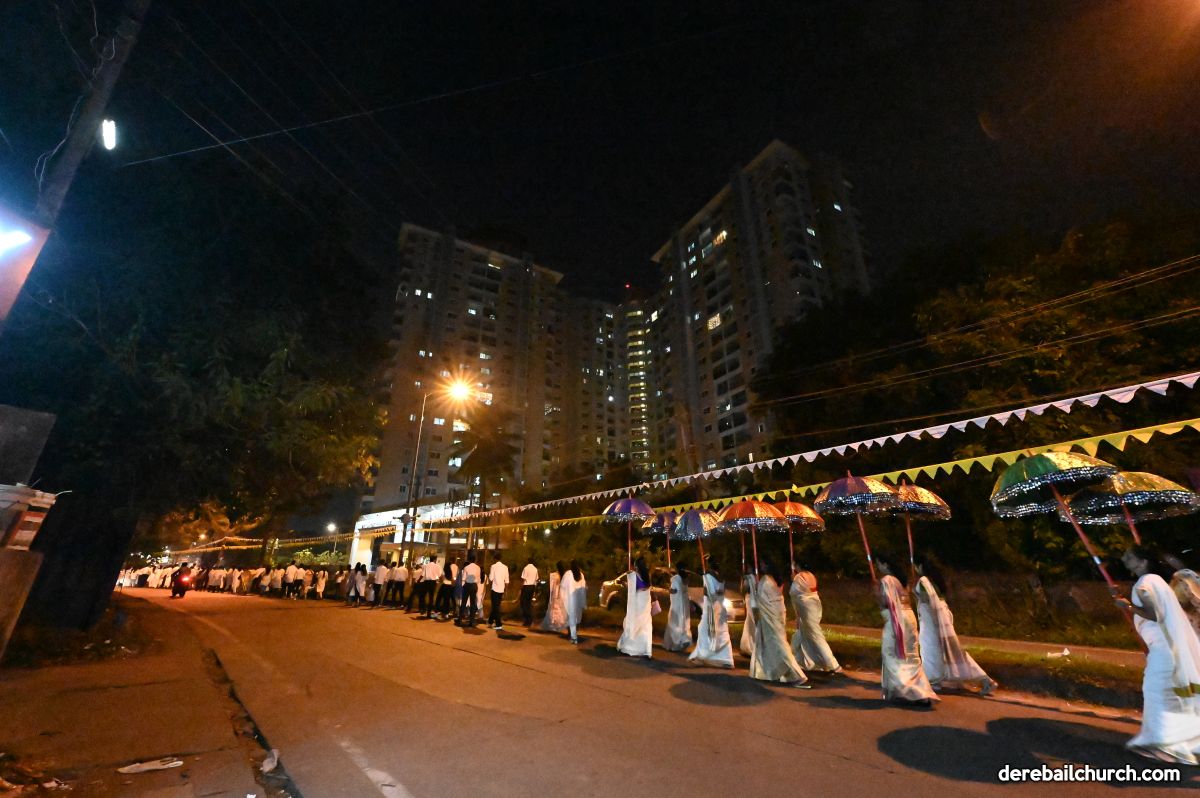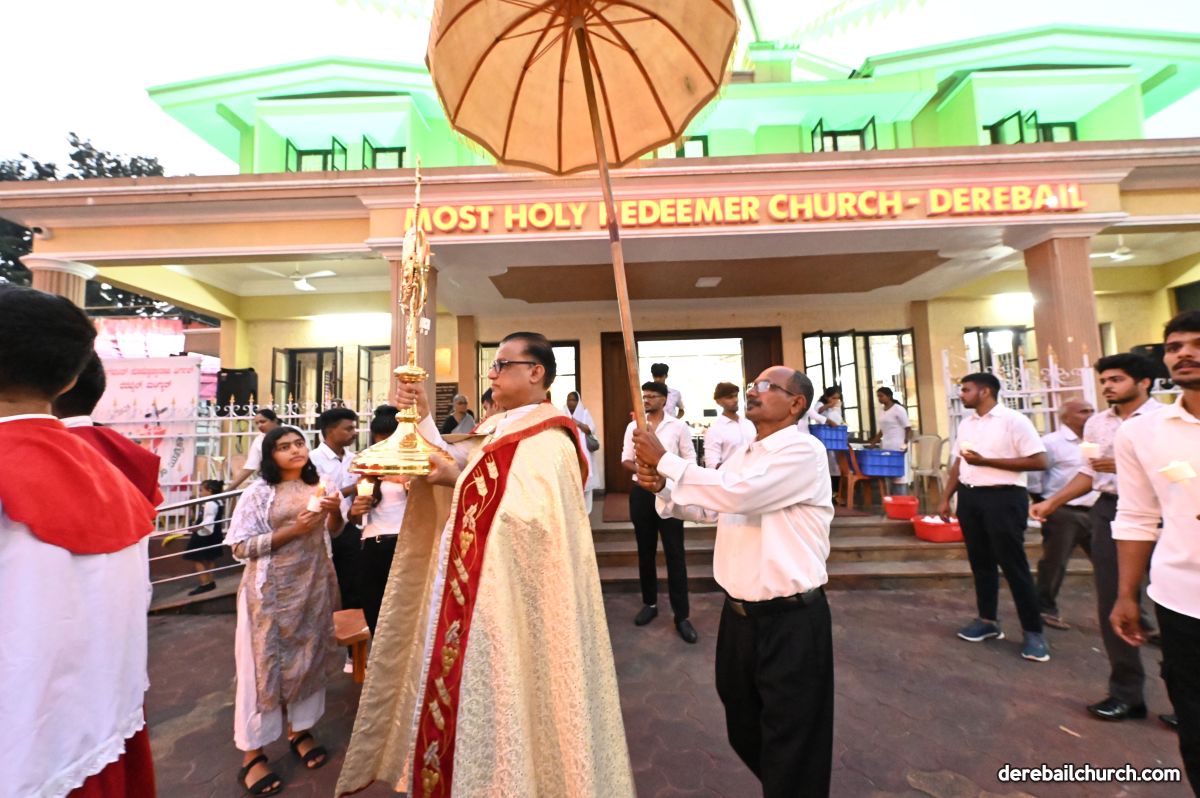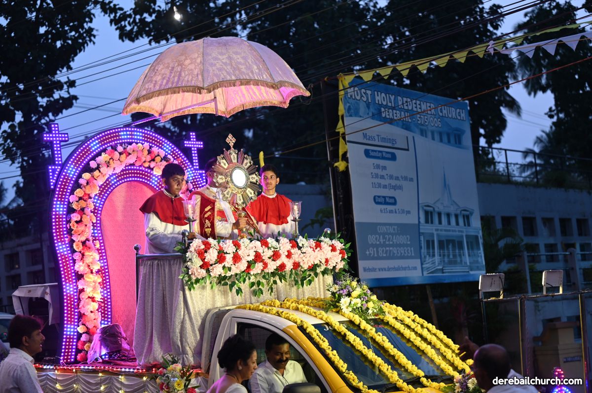 Following the Mass, a solemn procession began at the church entrance, proceeded towards Konchady Katte, and returned. Parishioners, dressed in white and off-white, participated with candles and hymns, symbolizing unity. The evening concluded with adoration of the Blessed Sacrament, accompanied by beautiful hymns by the church choir.