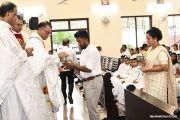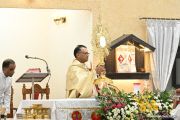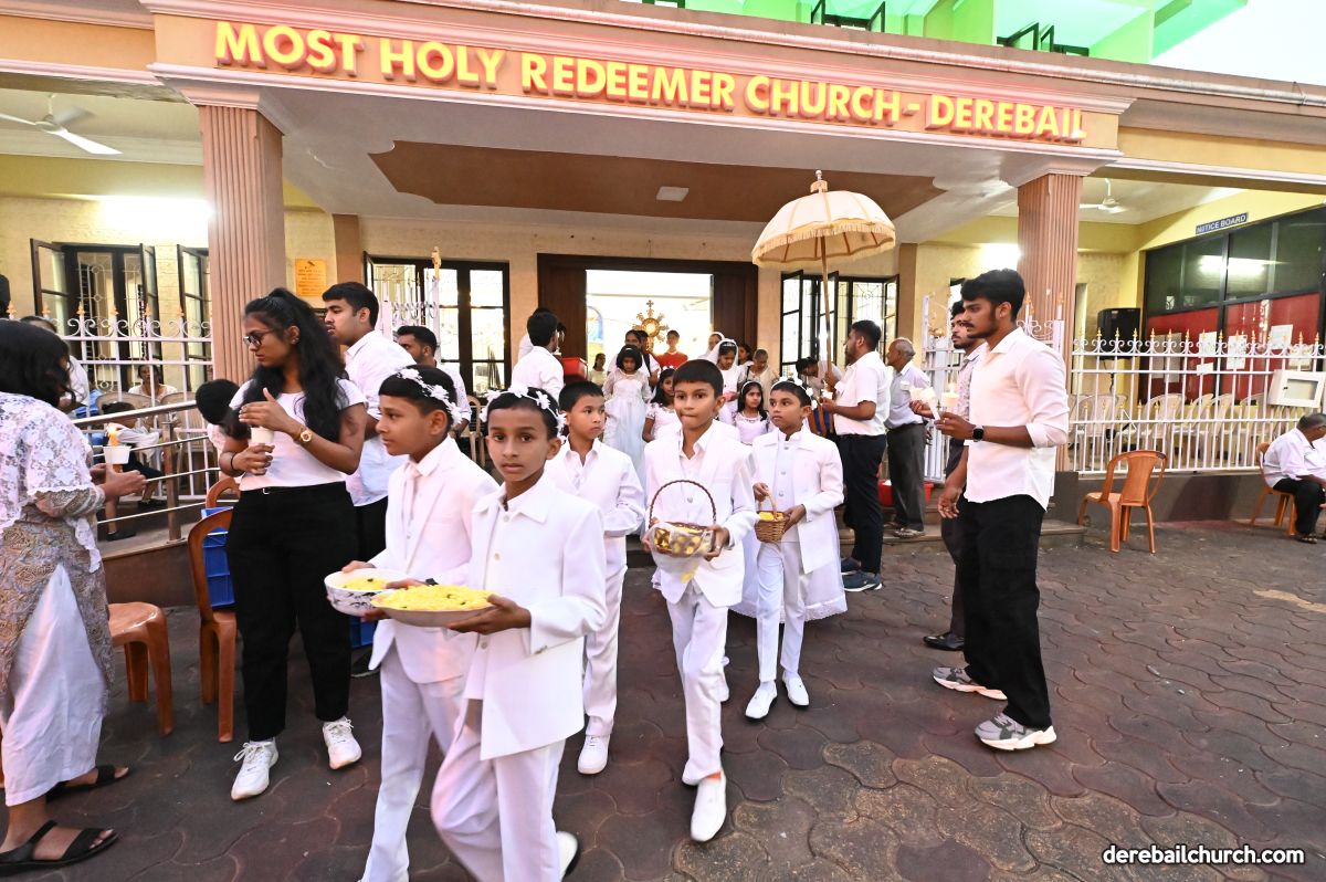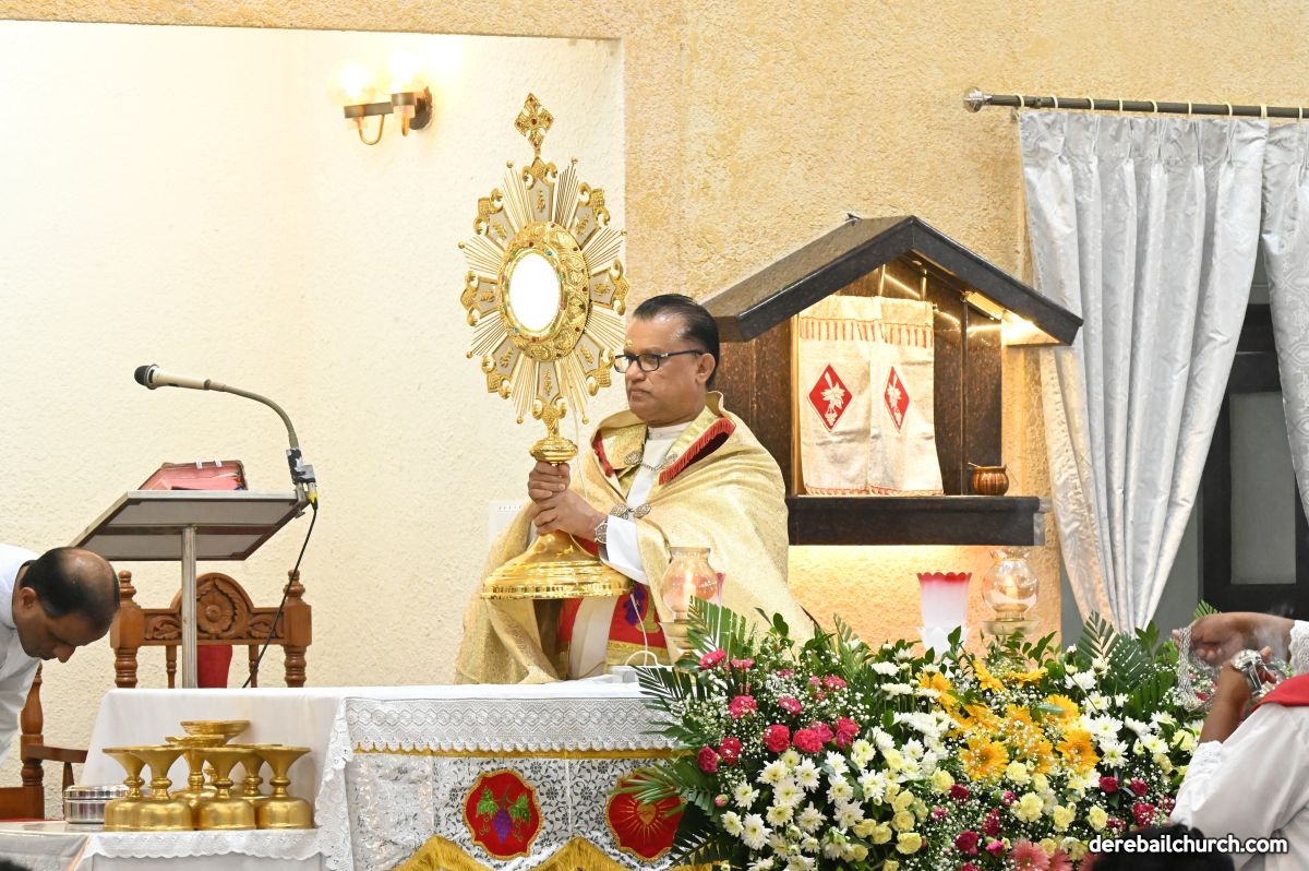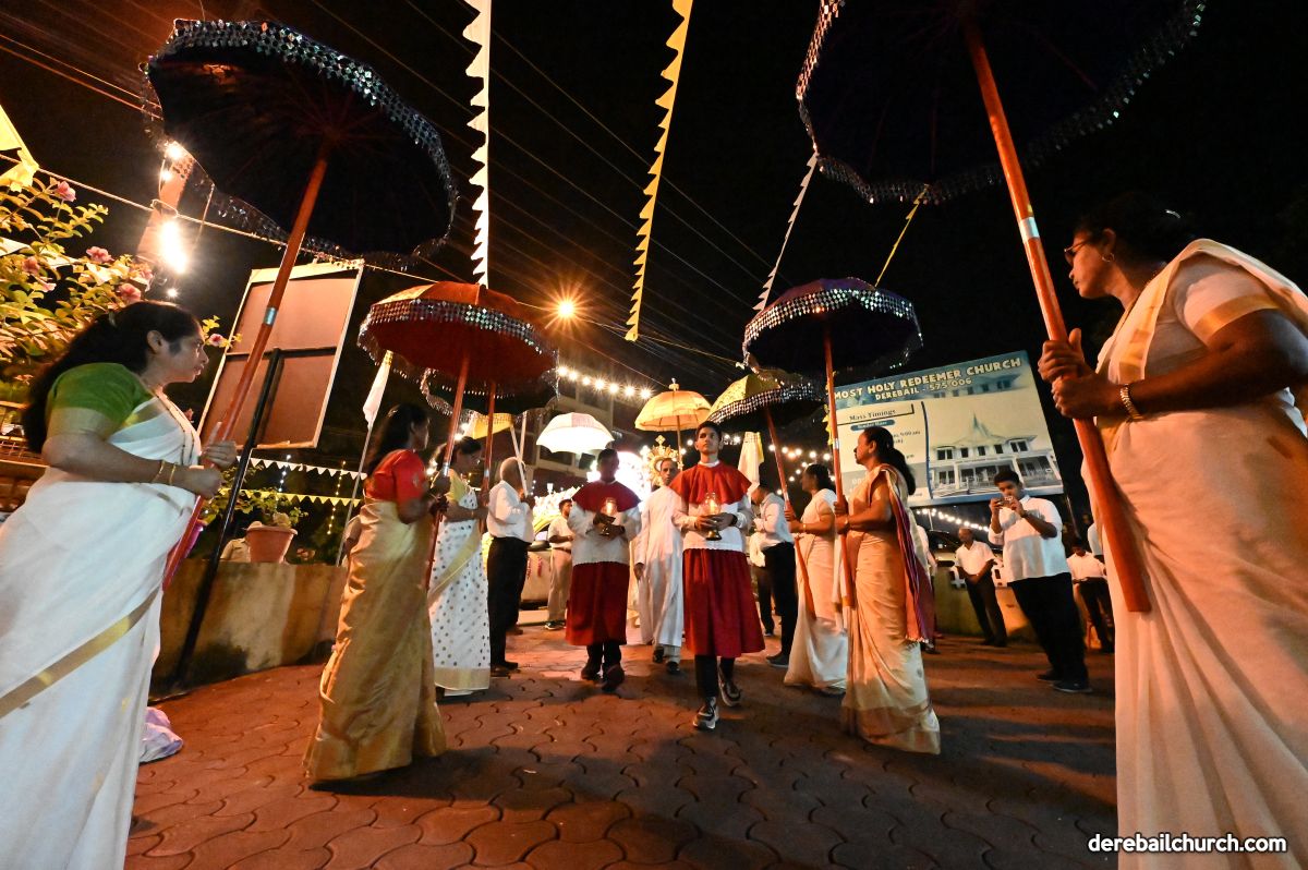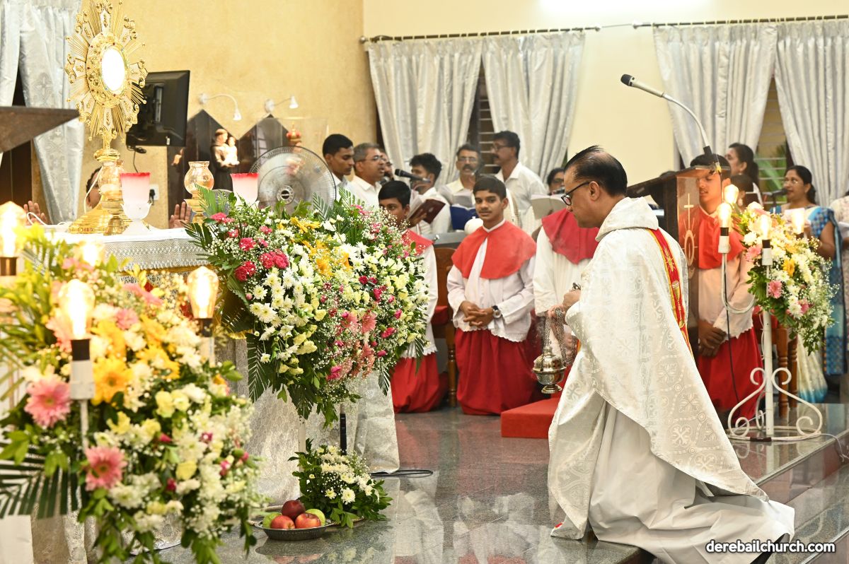 Following the Mass, a solemn procession began at the church entrance, proceeded towards Konchady Katte, and returned. Parishioners, dressed in white and off-white, participated with candles and hymns, symbolizing unity. The evening concluded with adoration of the Blessed Sacrament, accompanied by beautiful hymns by the church choir.