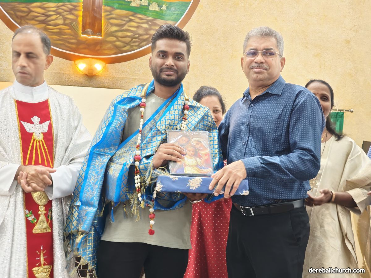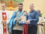 Following the 7:00 a.m. Mass, Mr. Nickil was felicitated with a Shawl, Garland, and Memento in the presence of Parish Priest Fr Joseph Martis, Associate Priest Fr Nelson Peris, Br. Augustine, Mrs. Sheela D’Souza (Parish Vice President), Mr. Anil Patrao (Coordinator of the 21 Pastoral Commissions), and members of the parish community. Fr Joseph Martis congratulated Mr.Nickil and wished him a bright and successful future, also extending warm wishes to his proud parents.
