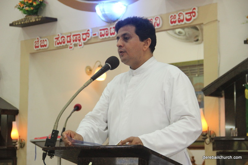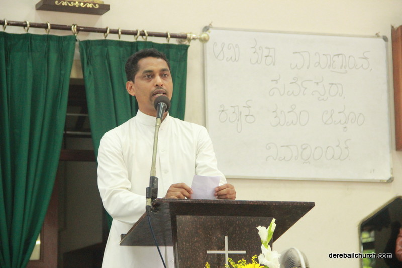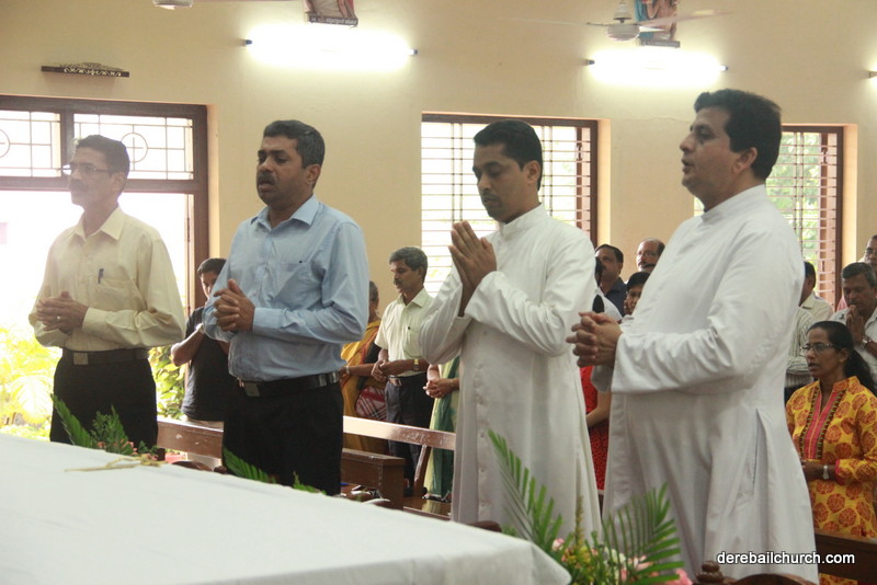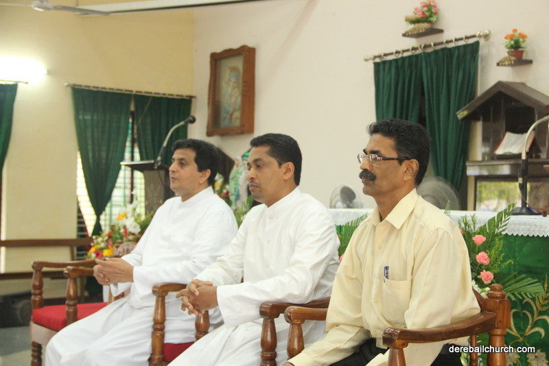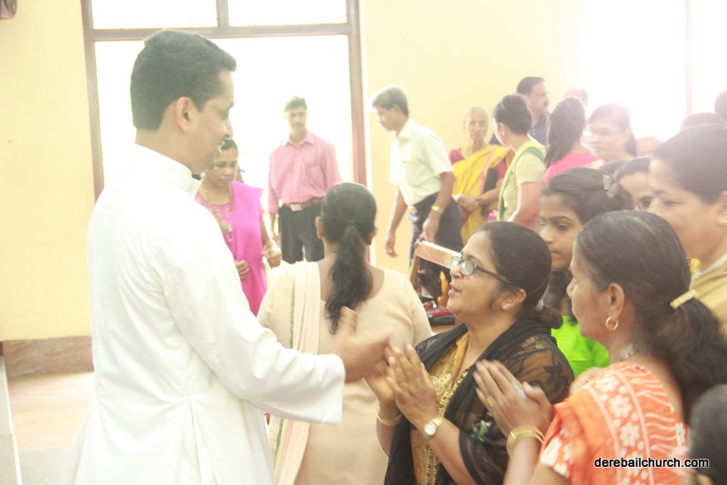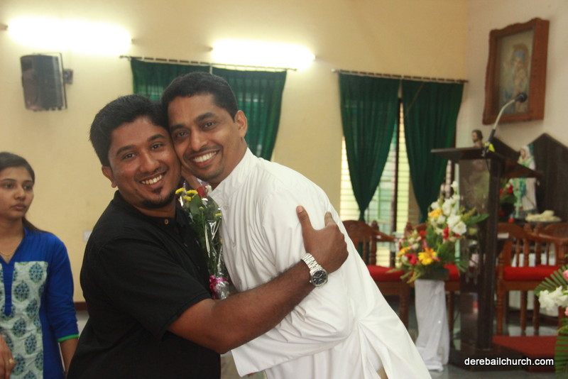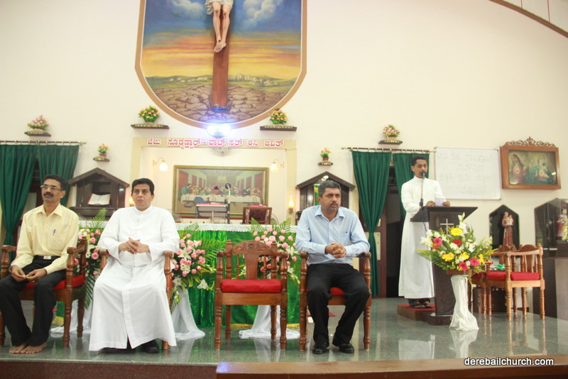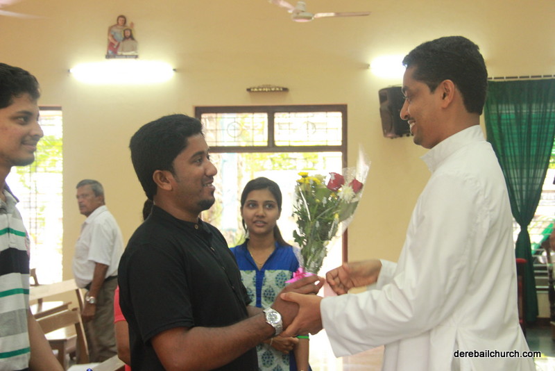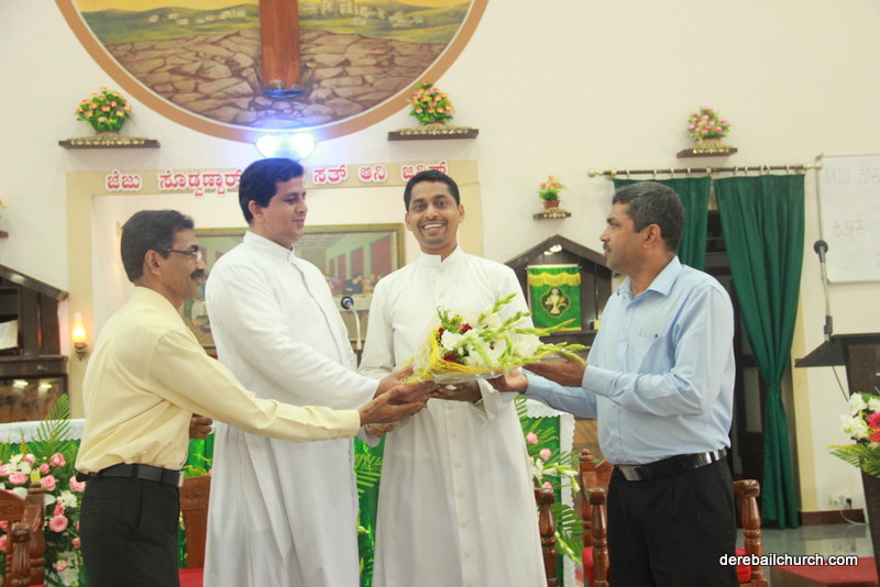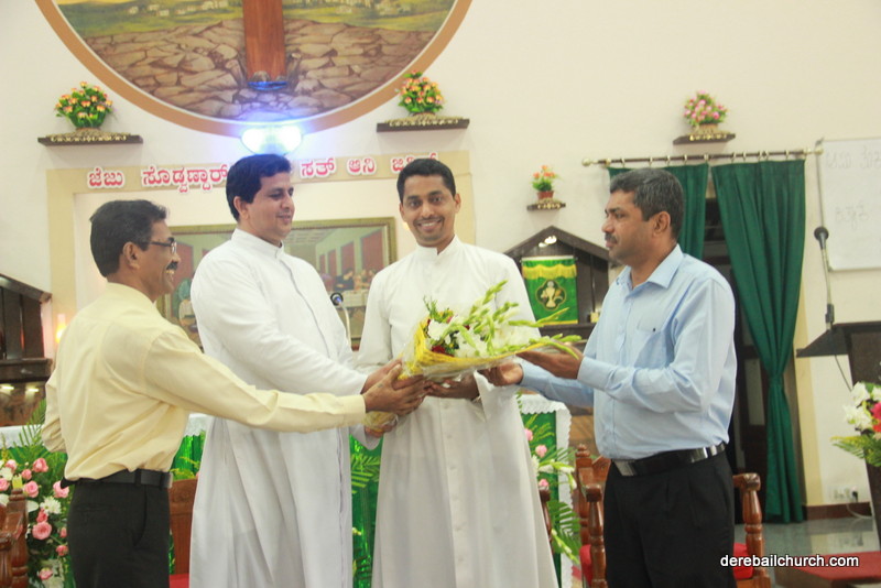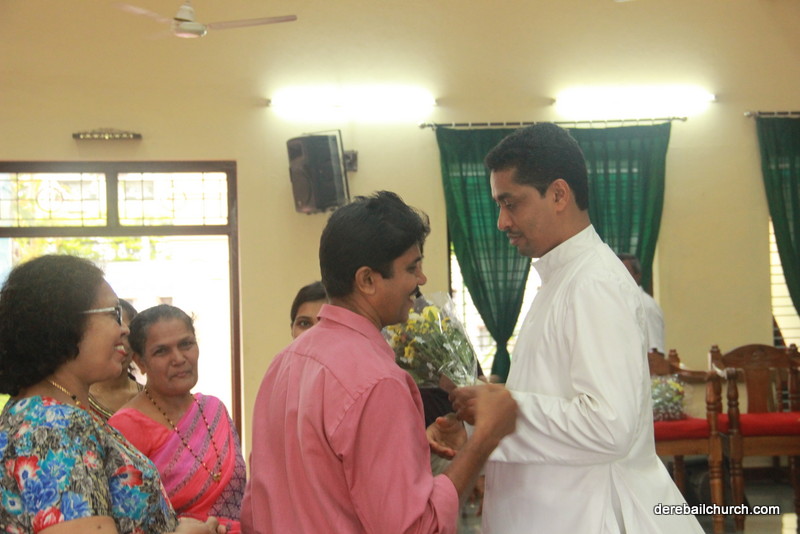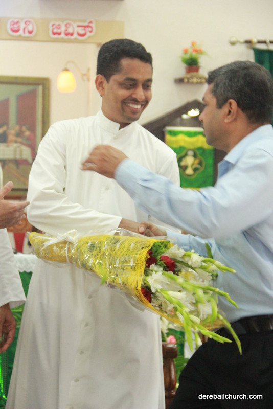 Fr. Anil, the Assistant Parish Priest of Derebail Parish was given a sendoff by the parish on 6th of June, 2016. The farewell programme was held after the 7 AM mass. The new Parish Priest, Rev Fr Austin Peter Peres were also present along with Vice President of Pastorial Council, Mr. Anil Patrao, Secretary Mr. Edward Coelho. Vice President spoke a few words about the service rendered by Fr. Anil in the past 1 year. Then Fr. Austin Peres wished him good luck and blessed future to Fr. Anil. Later Father Anil thanked all the people who helped him serve the parish and also mentioned about how parishioners supported him during the sudden demise of Fr. Joseph. Later the, Fr. Anil gave his blessings and people gathered to wish him.