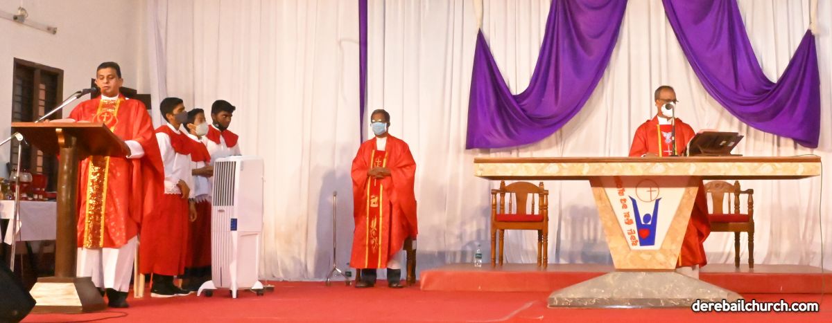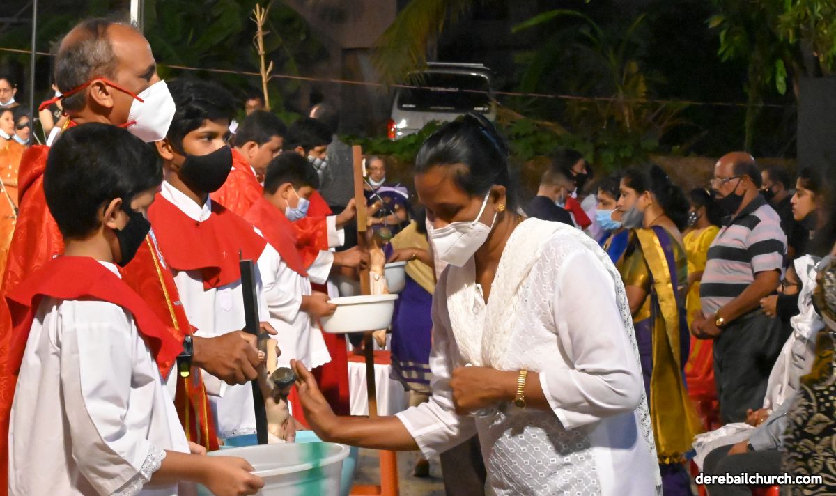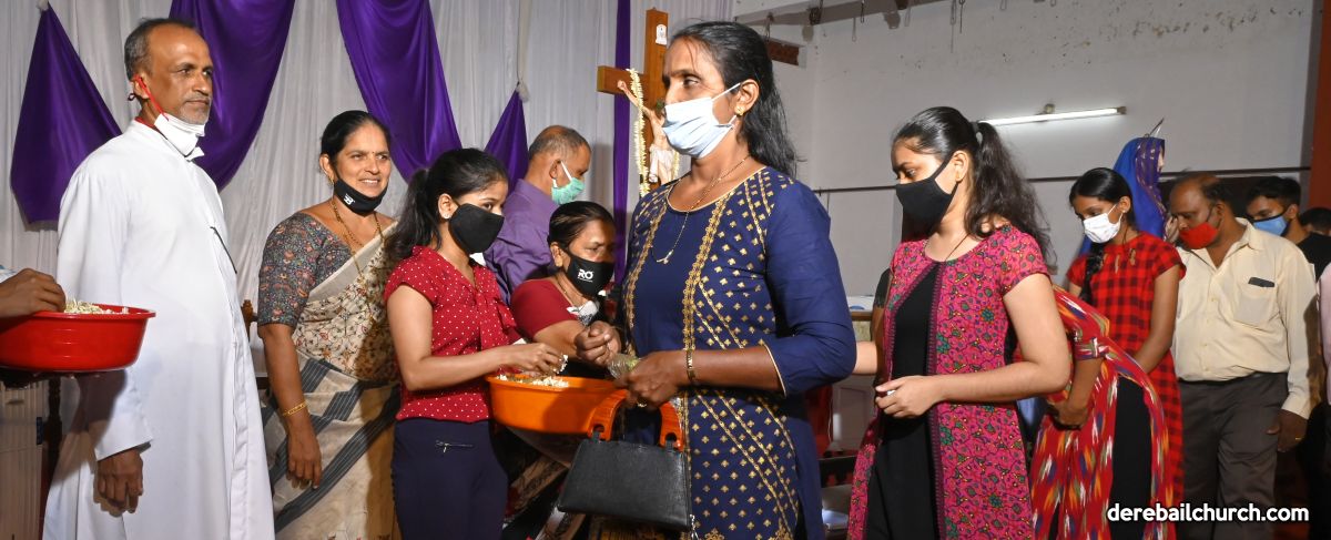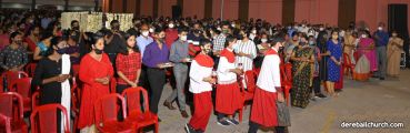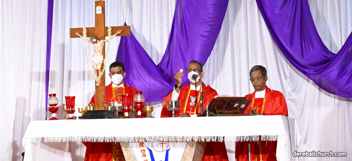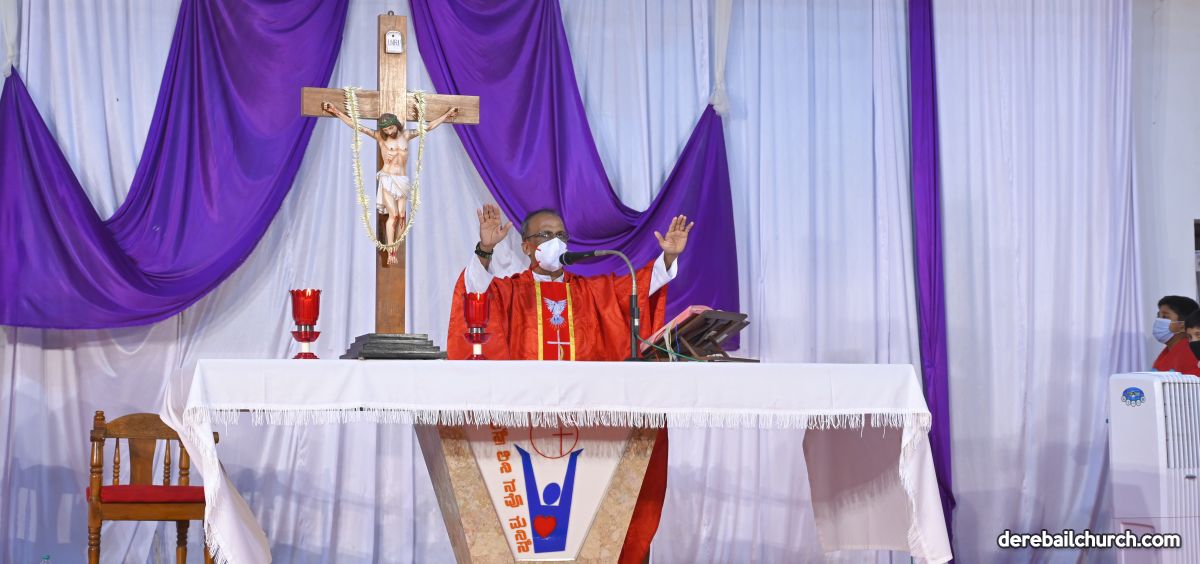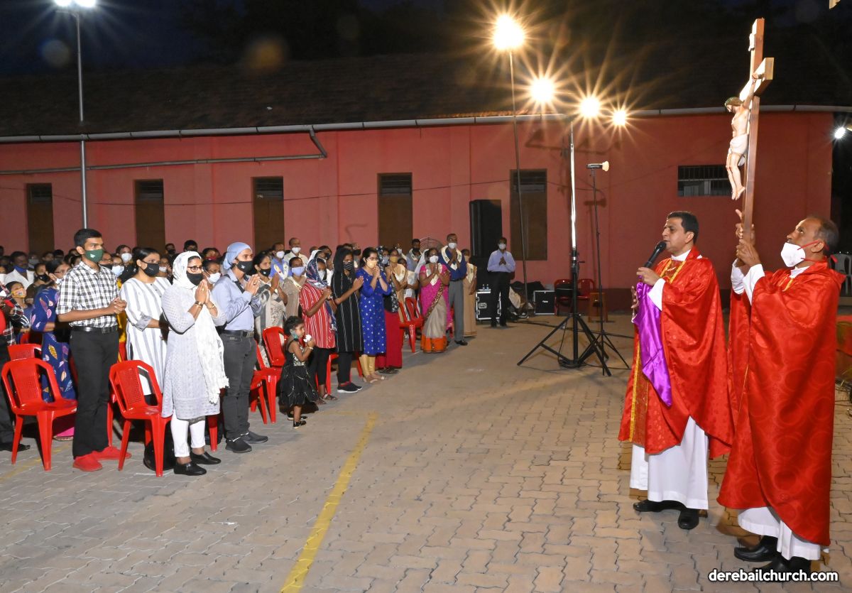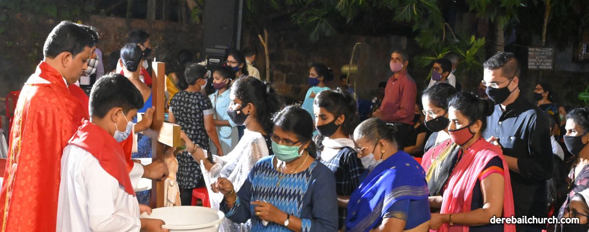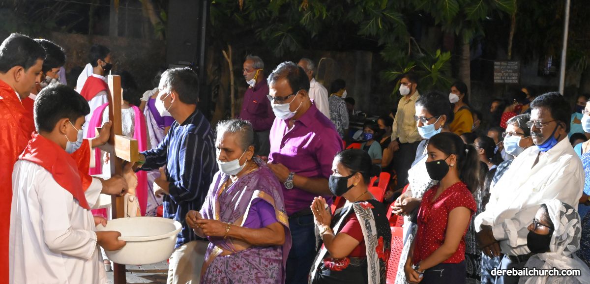 The Good Friday Service commenced at 5.30 PM at Most Holy Redeemer Church Derebail. Rev. Fr. Austin Peres, Rev. Fr. Gerald Pinto along with Fr. Walter Pinto bowed down at the altar in reverence. The Gospel was then recited after which Rev. Fr. Austin reflected on the seven last words that Jesus said on the cross. He cited multiple instances from our daily lives where Jesus's virtues of kindness, humility, and forgiveness could be put to practice, exemplifying good Christian faith. This was followed by the Prayers of the Faithful. The Holy Cross was then venerated after which the Holy Eucharist was distributed to all the faithful present at the ceremony.