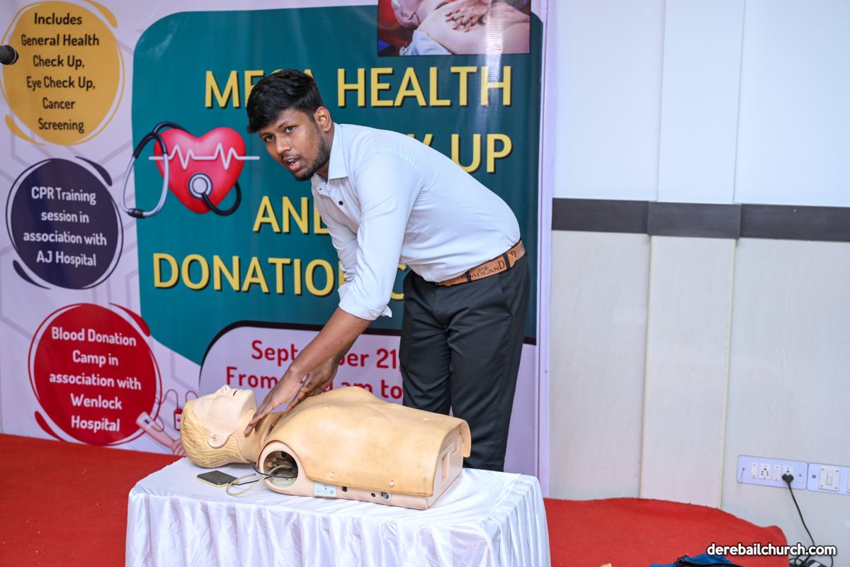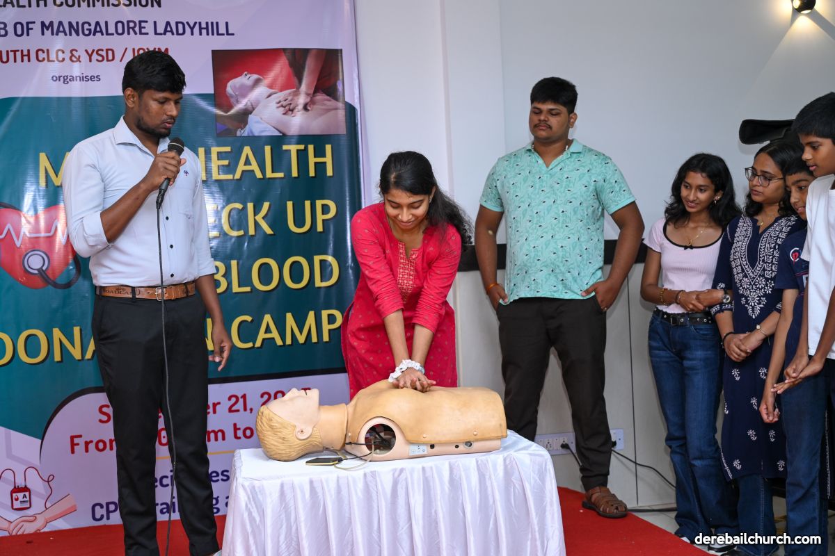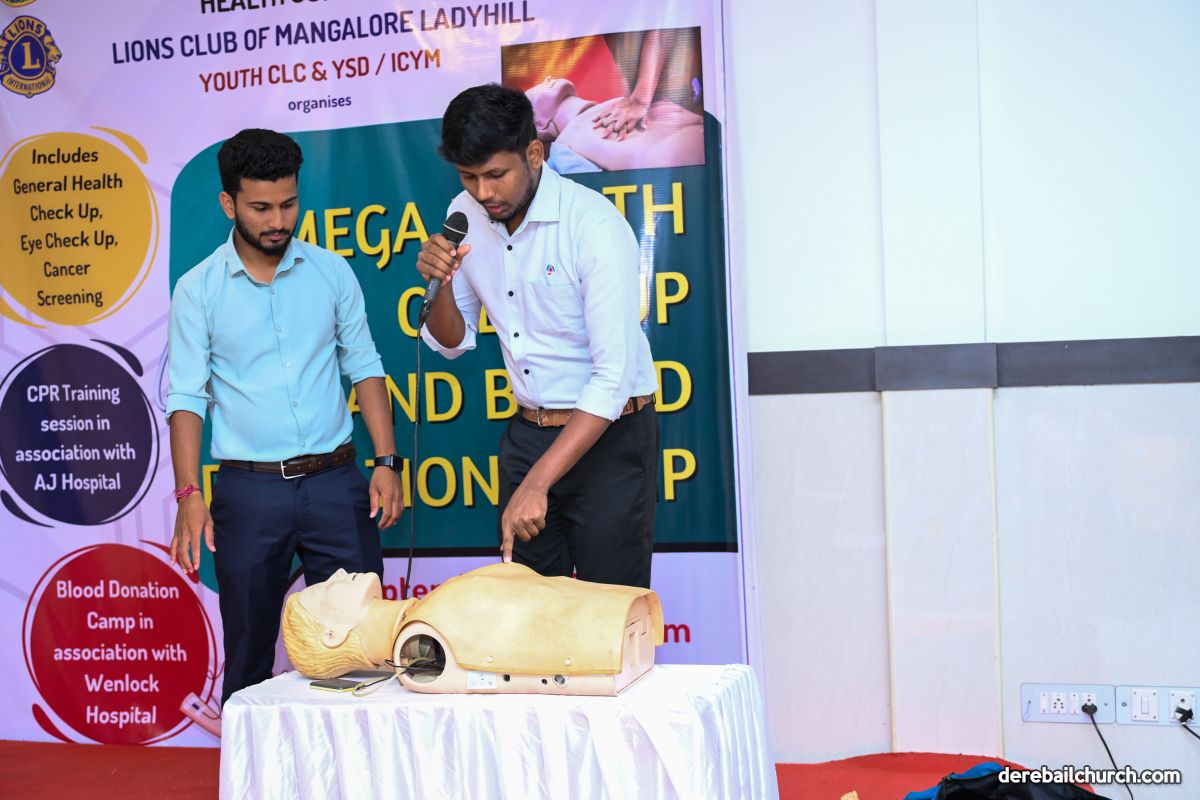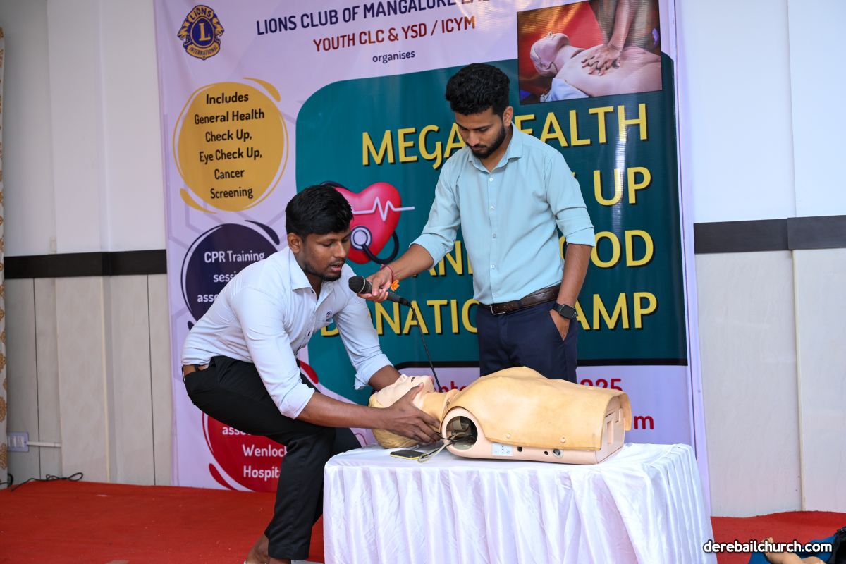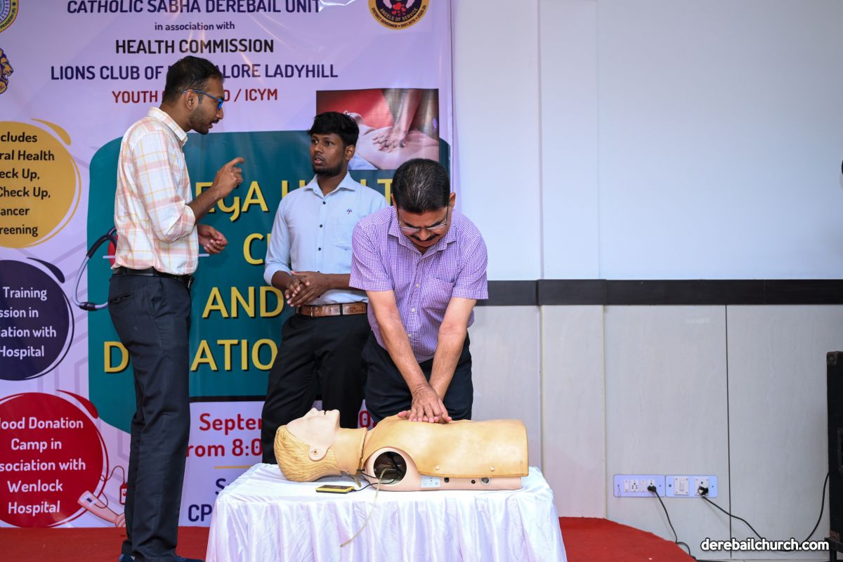 Later, a representative of AJ hospital Mr.Preetham Vas, spoke about various facilities and health schemes available at the hospital. He also appreciated the efforts put up by the organising committee in conducting the camp. This was followed by a demonstrative session on CPR (cardio pulmonary resuscitation) conducted by the casualty team of AJ hospital. Many parishioners participated in the training, especially the youth took keen interest in learning the details of this life saving procedure in emergency situations.