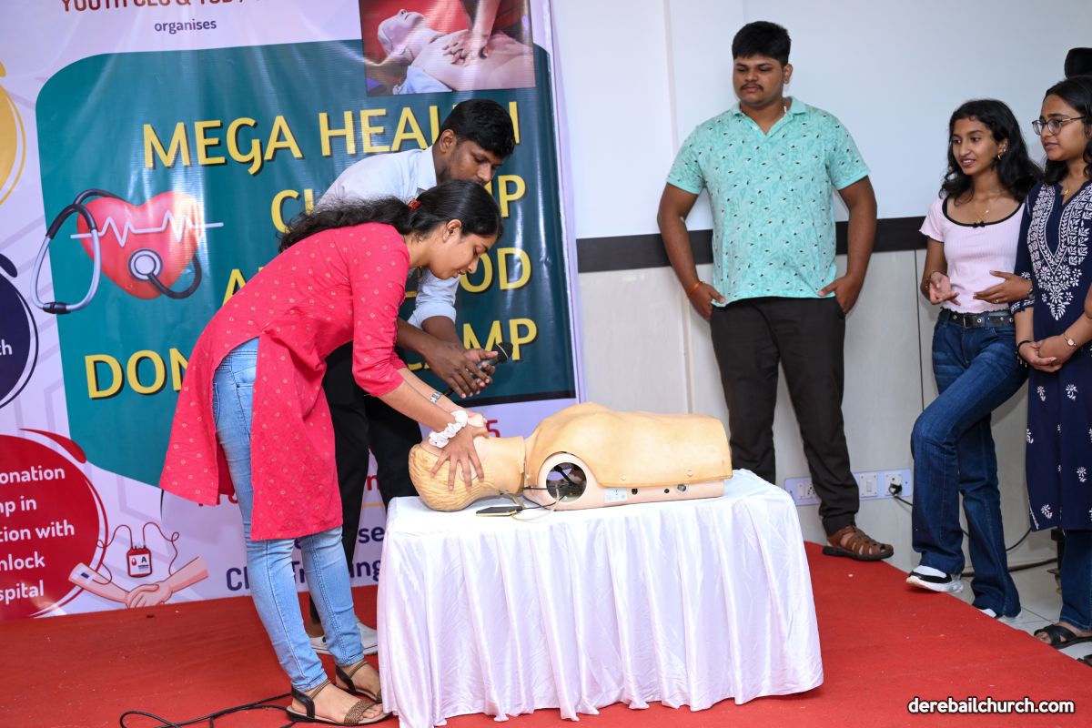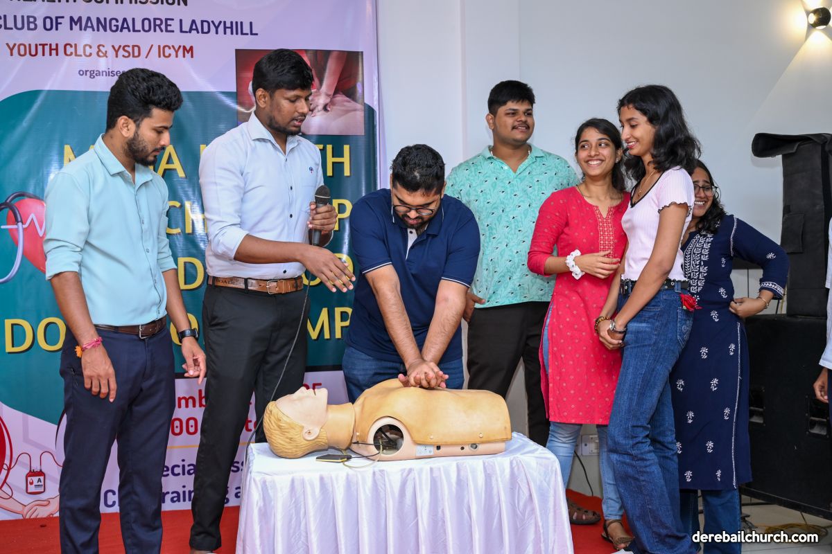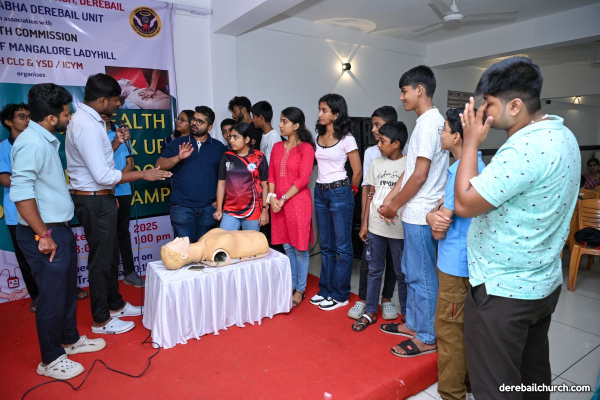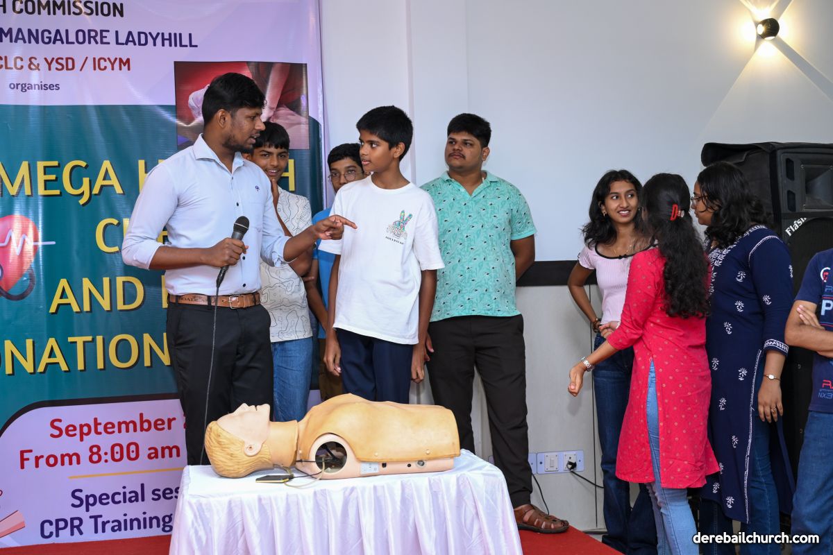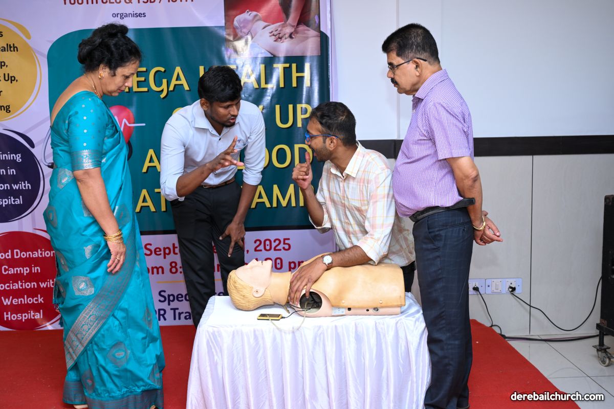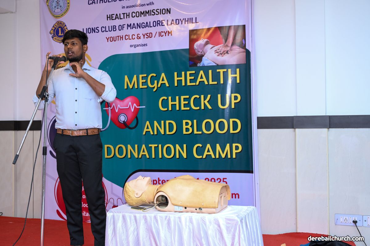 Later, a representative of AJ hospital Mr.Preetham Vas, spoke about various facilities and health schemes available at the hospital. He also appreciated the efforts put up by the organising committee in conducting the camp. This was followed by a demonstrative session on CPR (cardio pulmonary resuscitation) conducted by the casualty team of AJ hospital. Many parishioners participated in the training, especially the youth took keen interest in learning the details of this life saving procedure in emergency situations.