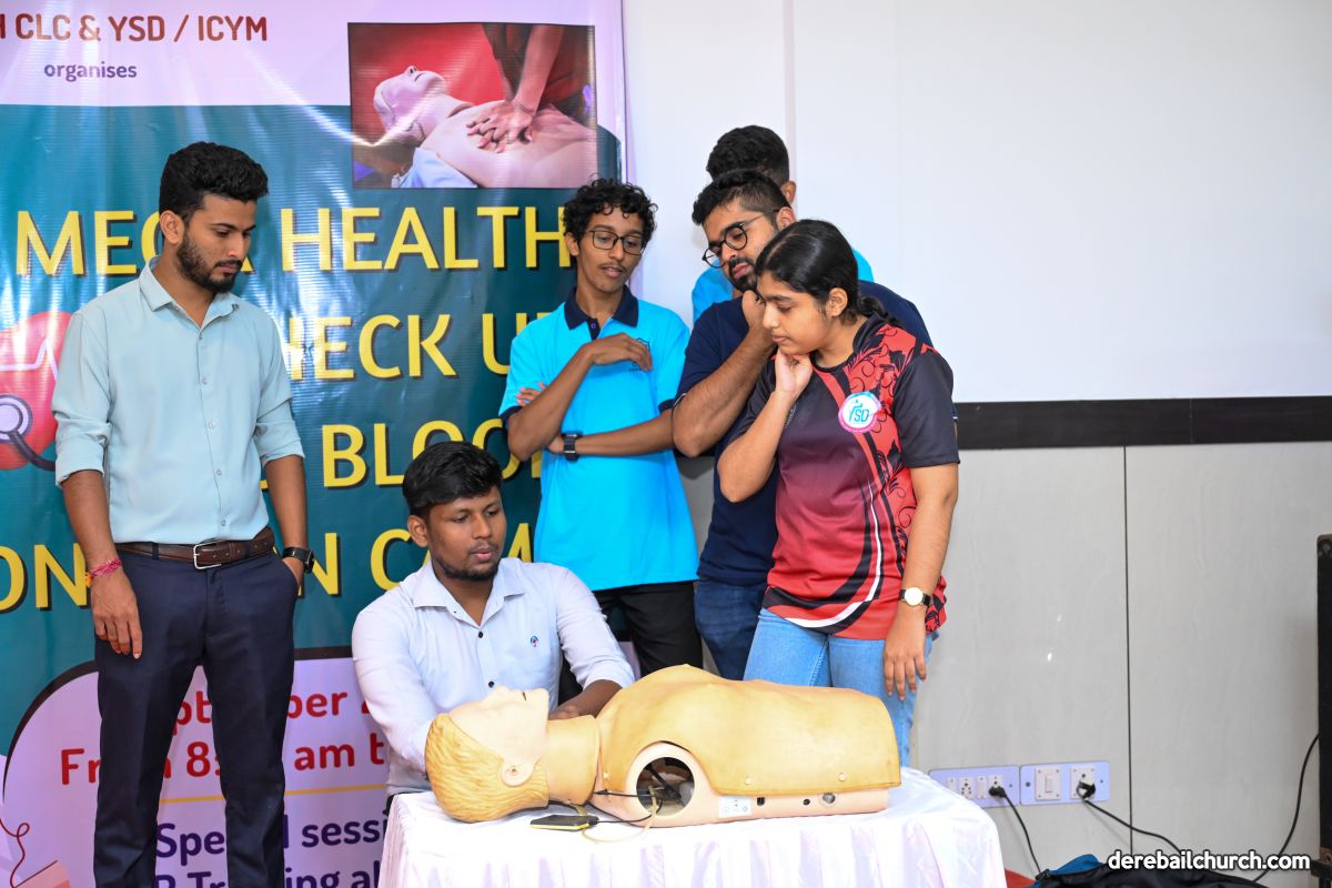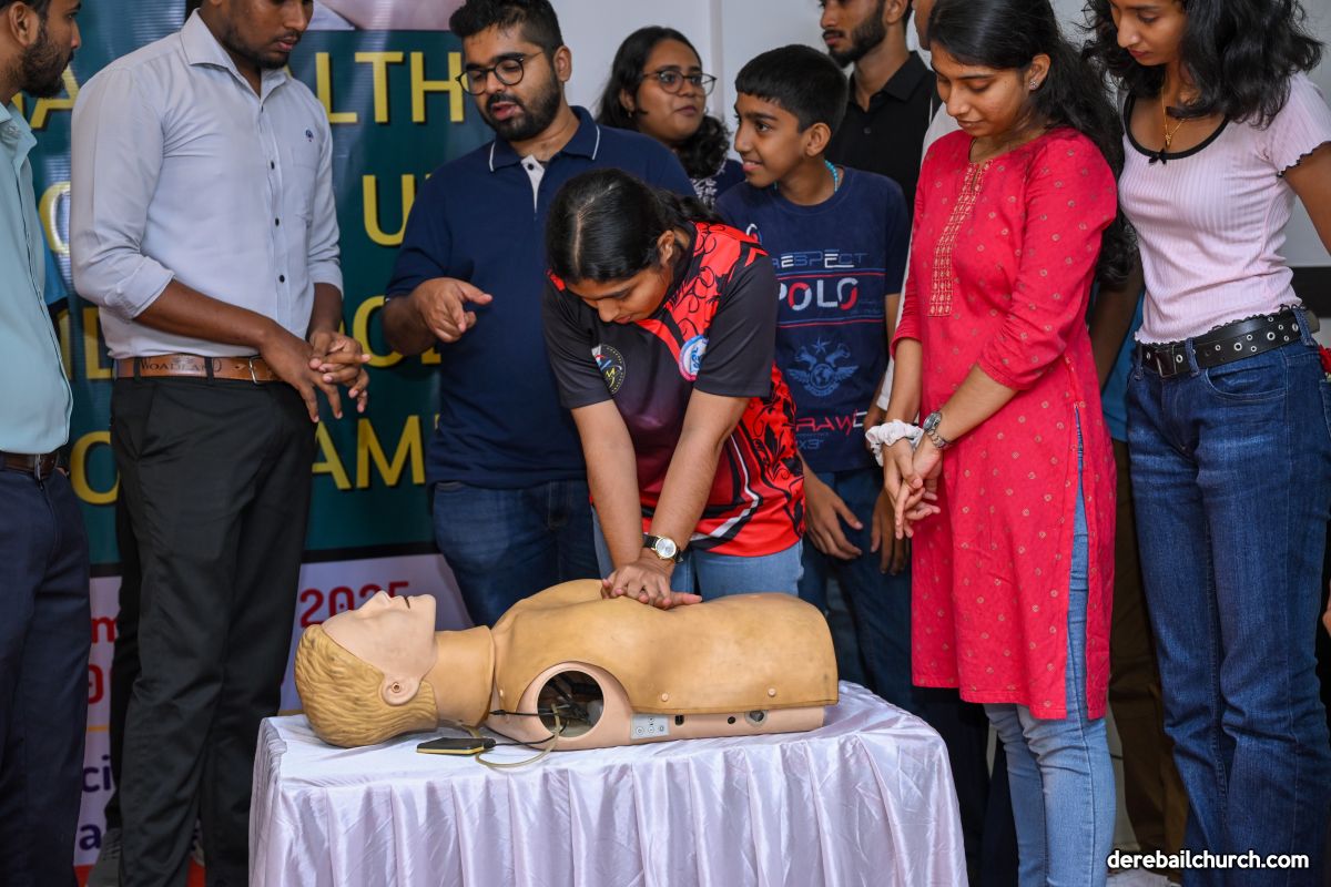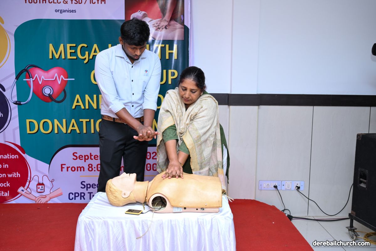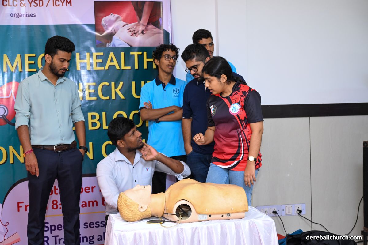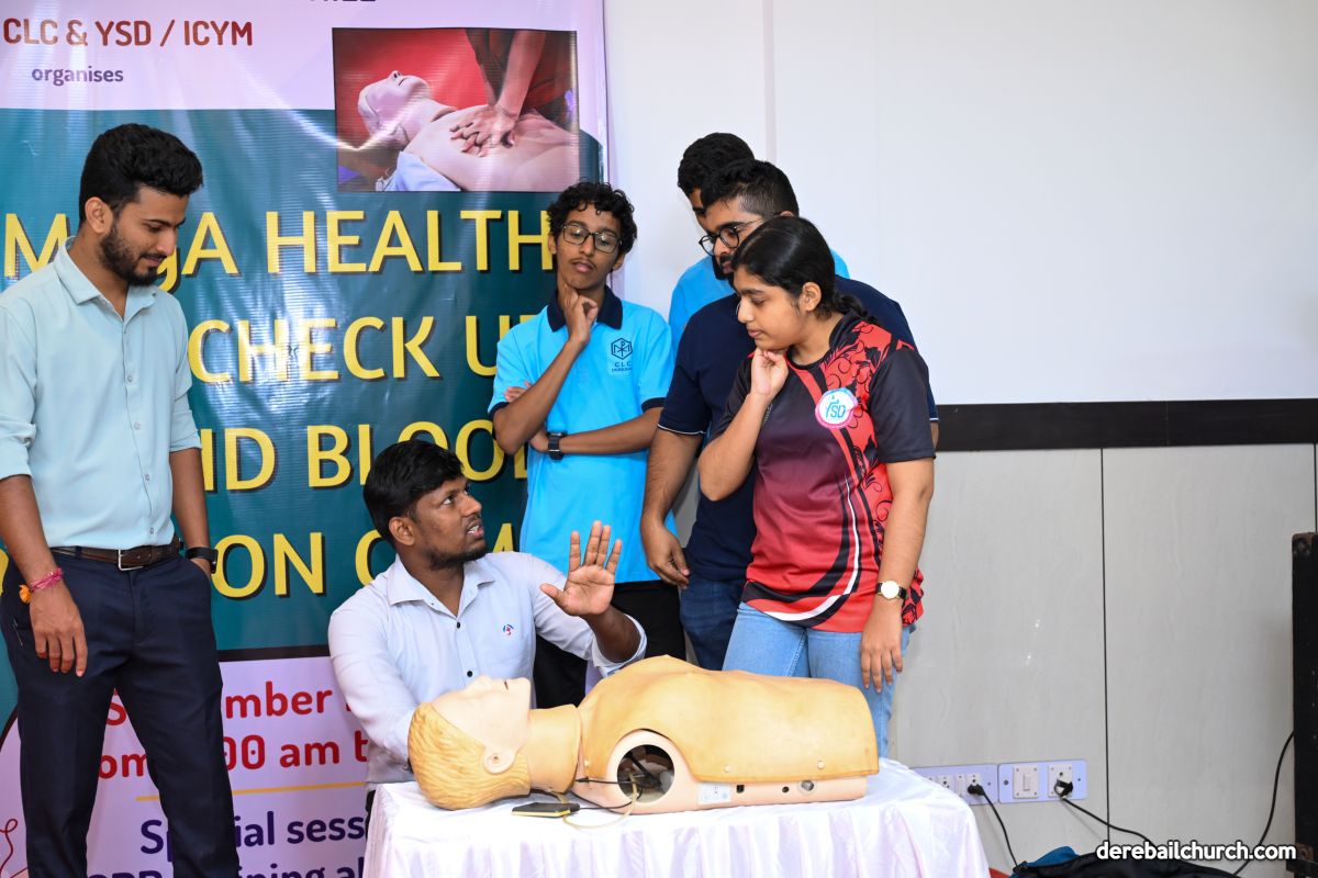 Later, a representative of AJ hospital Mr.Preetham Vas, spoke about various facilities and health schemes available at the hospital. He also appreciated the efforts put up by the organising committee in conducting the camp. This was followed by a demonstrative session on CPR (cardio pulmonary resuscitation) conducted by the casualty team of AJ hospital. Many parishioners participated in the training, especially the youth took keen interest in learning the details of this life saving procedure in emergency situations.