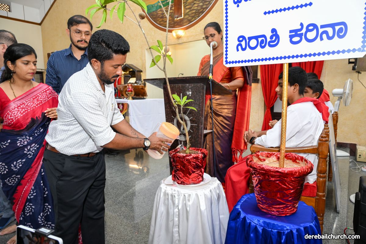 Following Diocesan instructions, Fr. Martis presented the Holy Bible and "Catechism of the Catholic Church" book to the Catechists and distributed Catechism books to the students. A placard reading *Hope does not disappoint us*, along with a plant and water jar, was placed near the altar. The PPC Vice President Mrs. Sheela Dsouza, secretary Mr. Denzil Pinto, the coordinator of the 21 Commissions Mr. Anil Patrao and parents watered the plant, symbolizing the nurturing of hope by both family and the parish.