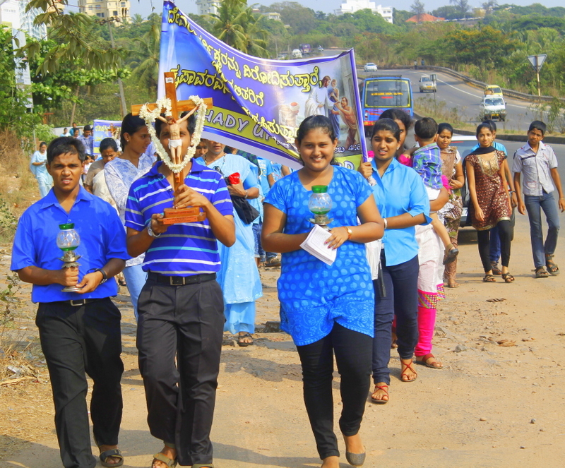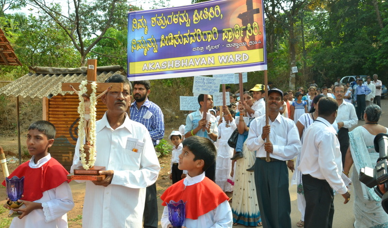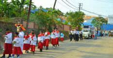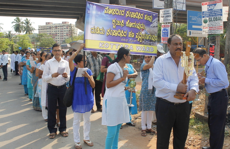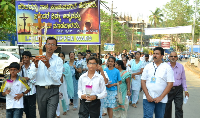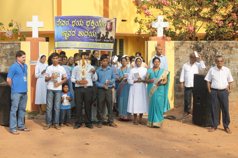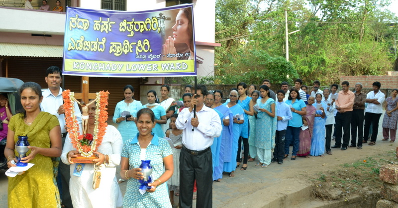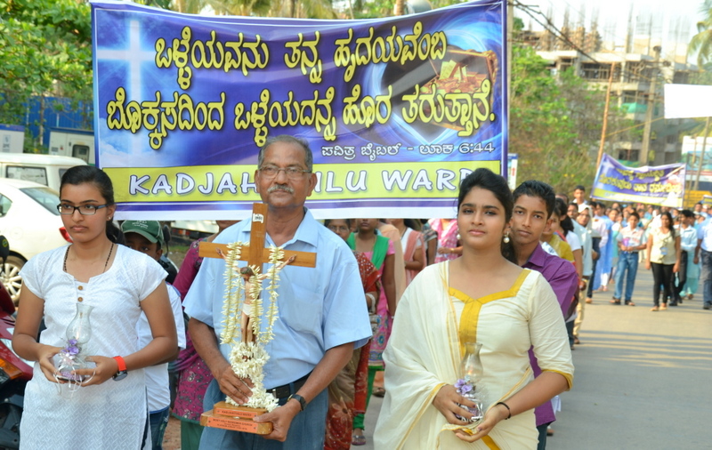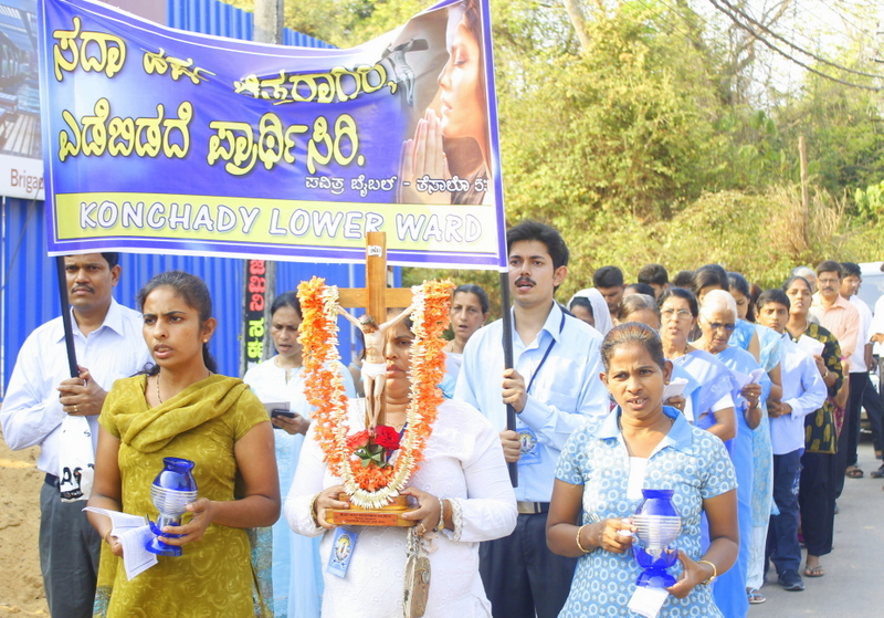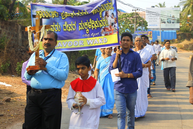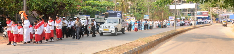 Each procession was led by a main cross, followed by the brass band which played hymns. This was followed by various wards each led by the Gurkar holding the cross, with two people holding the candles and another two wards members holding a banner which had the verse from the Holy Bible printed on it. Behind them, our young and energetic altar boys were followed by members of the wards. It was a spectacular event to witness one procession proceeding from Kottara cross to Kuntikan Flyover and then towards the church, while the other moving from Akashbhavan to 4th Mile towards Konchady Bus Stop and Medi Plus Junction to finally intercede at the church grounds.