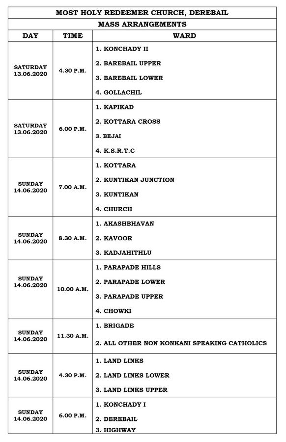 Following the guidelines issued by the Mangalore Diocese, Most Holy Redeemer Church, Derebail is opening its doors for its Parishioners to partake in the Eucharistic Celebration. However, the parishioners are requested to strictly adhere to the time slot alloted to their respective wards, keep distance and follow the COVID safety norms for the benefit of themselves and others.