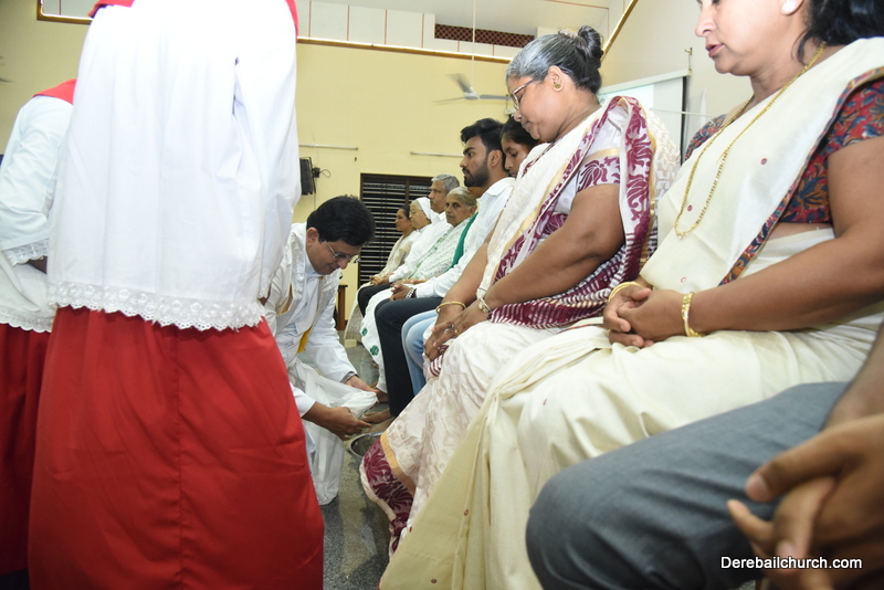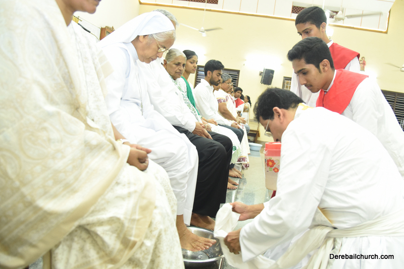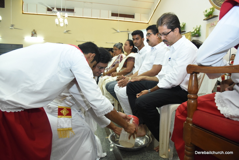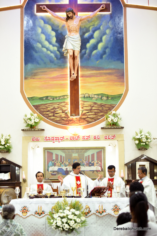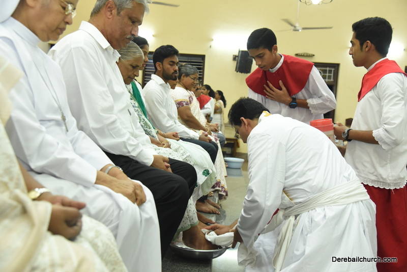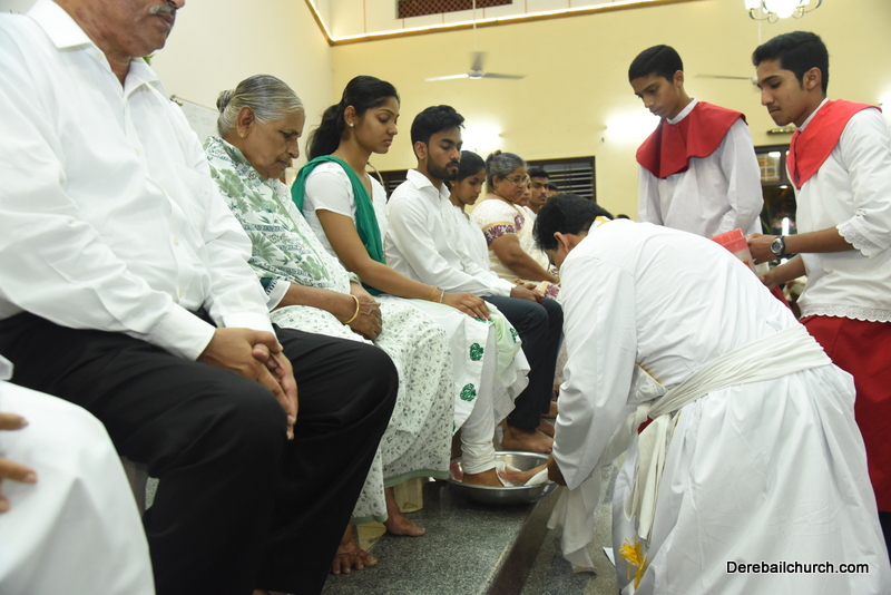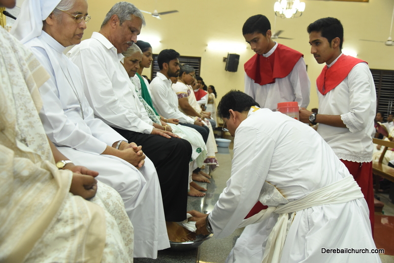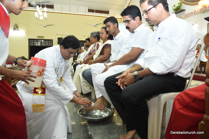 Maundy Thursday marks the beginning of the three day celebration of Easter. It commemorates the Last supper of Jesus Christ with his disciples. Jesus also washed the feet of his followers and commanded them to love each other. The Maundy Thursday celebration at The Most Holy Redeemer Church Derebail were concelebrated by the Rev.Fr Austin Peres, Rev Fr.Gracian Alvares, Rev.Fr Anthony Pais and Rev. Fr Walter Pinto. Fr Anthony Pais in his homily elaborated the significance of the day and also reminded the parishoners about the institution of the sacrament of Priesthood.The mass stressed the importance Jesus put on the humility of service. The mass also emphasized the importance of Eucharist and its symbolic gesture of sacrifice of Jesus's body. At the conclusion of the mass the faithful were invited to continue the adoration of the Blessed Sacrament. The members of the Senior Choir added to the solemnity of the service through their singing.