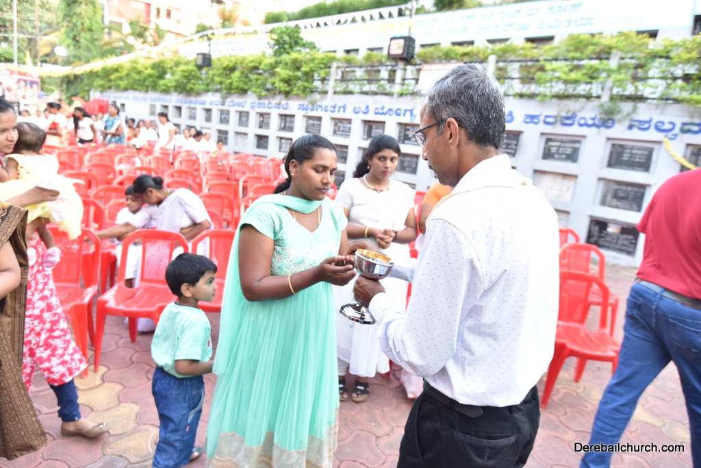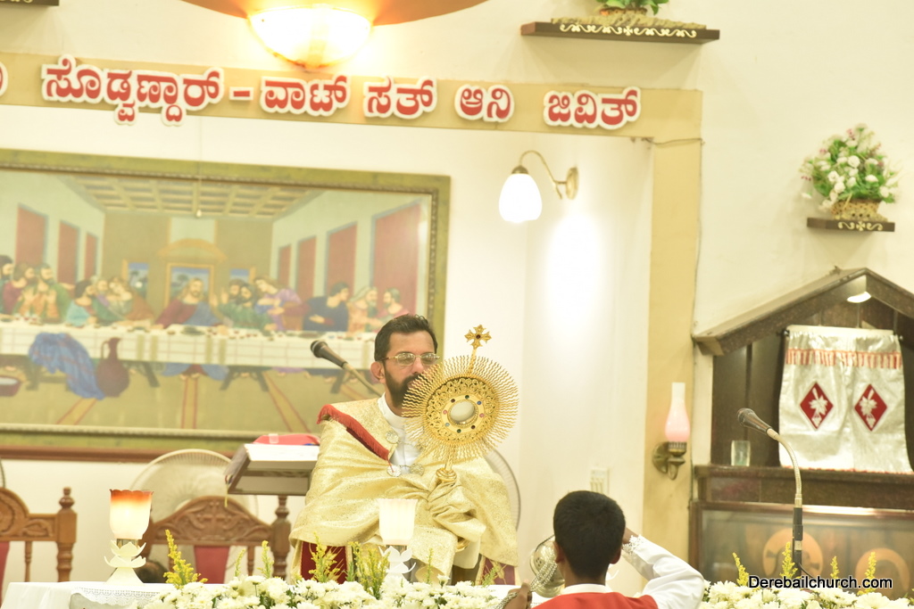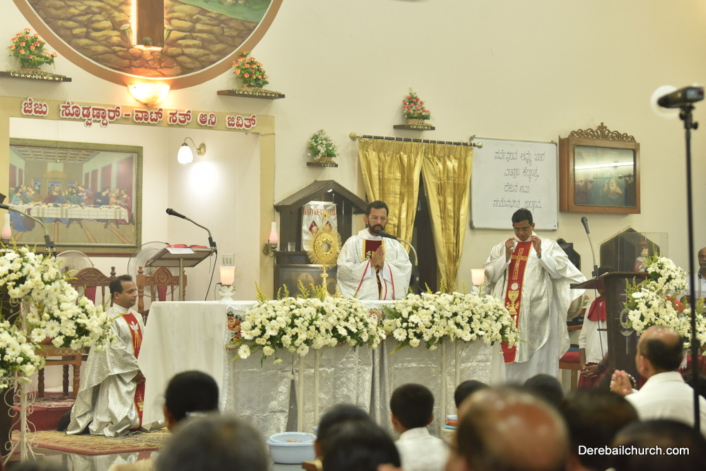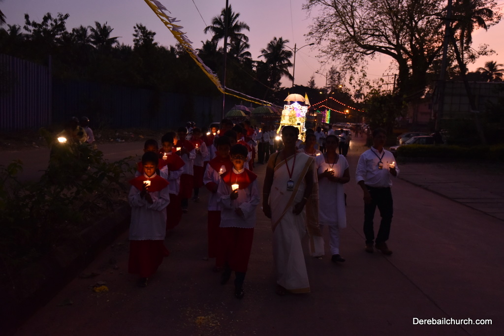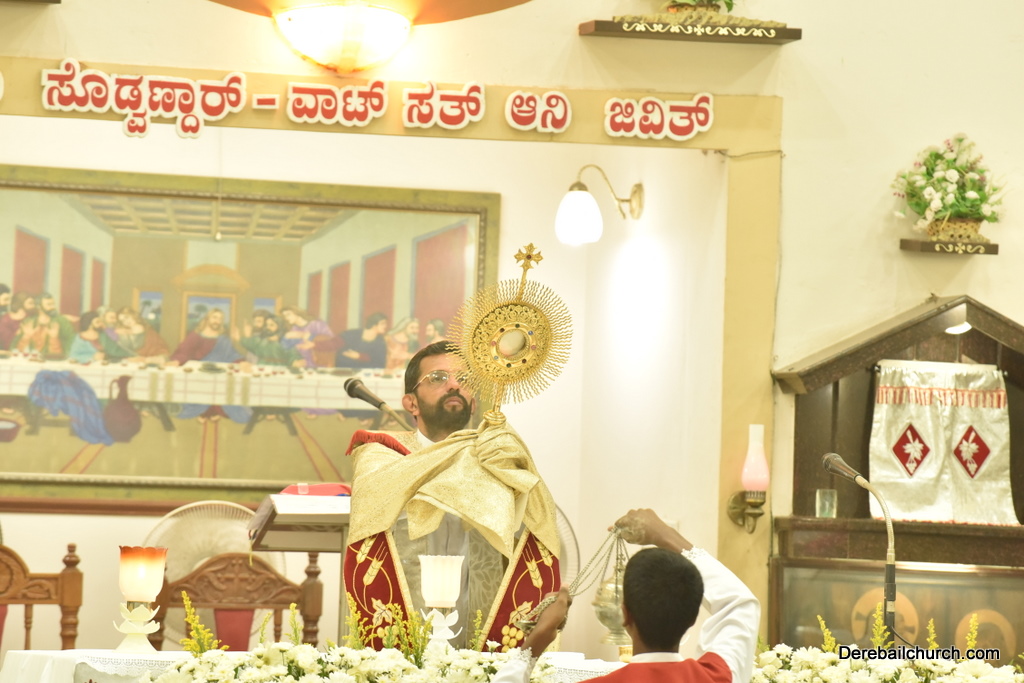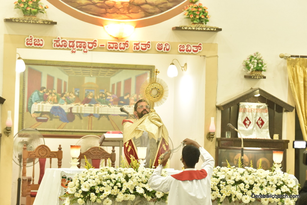 As preparation for the annual parish feast of Most Holy Redeemer Church, Derebail, the Confraternity Sunday (Compricho Aithar) was observed on 28th October, 2018 with gaiety and devotion. The entire parish got together in huge numbers on this blessed day. The Eucharistic celebration began at 04.30 PM with Rev. Fr. Boniface Pinto being the main celebrant offered mass along with Rev. Fr. Austin Peter Peris and Rev. Fr. Gratian Alvares. In his homily he said that Eucharist is the centre of our Christian life. The Eucharist binds us together in family and at large at the Parish community as one body.