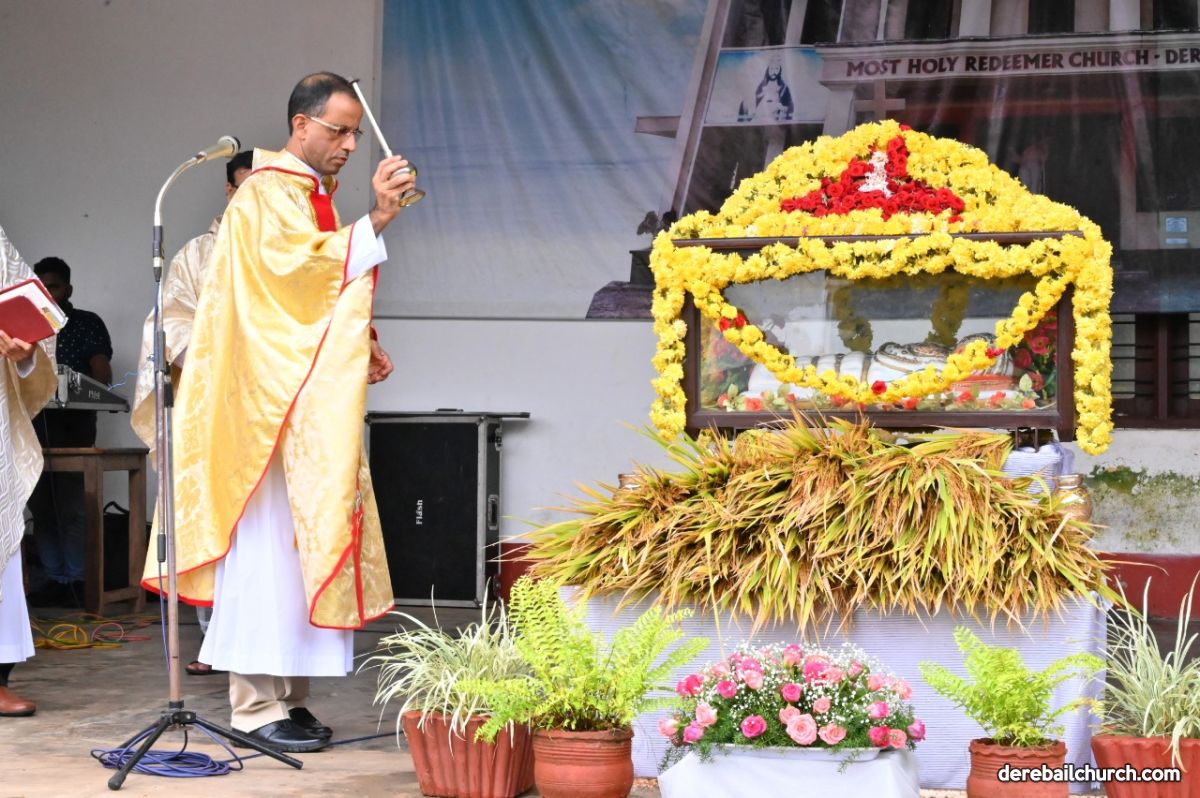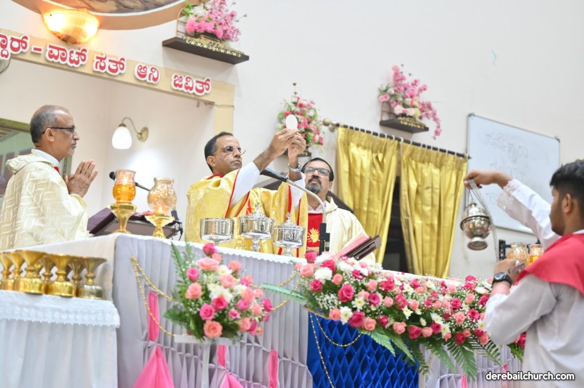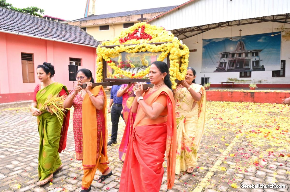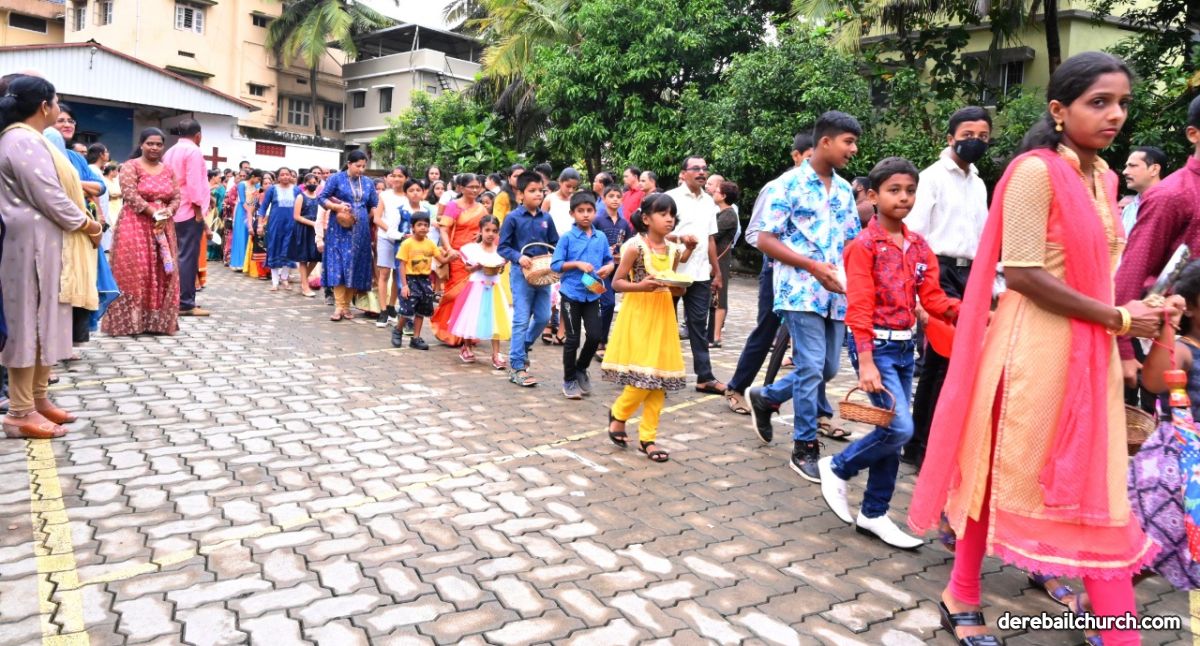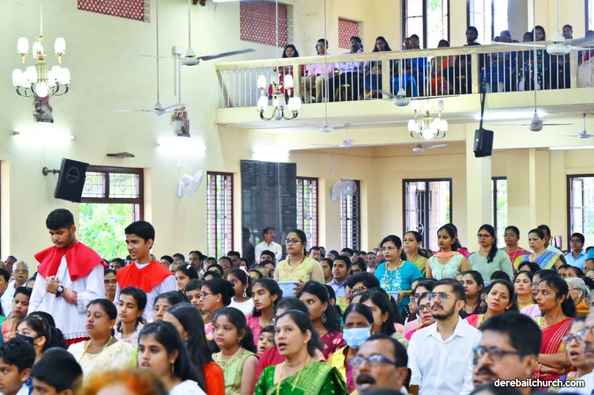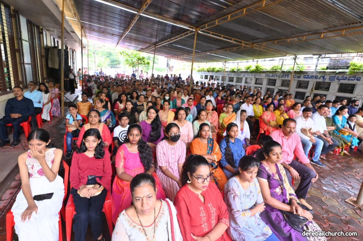 'Monthi Fest' or the Feast of Nativity of Blessed Virgin Mary was celebrated at Most Holy Redeemer Church Derebail on Thursday, 8 September, 2022. Preparations for the Feast was done with nine days of Novena participated by large number of people very specially children. The Novena masses were held at 5.30 in the evenings, followed by Novenas prayers and offering of flowers in front of the Grotto. The kids were offered with variety of sweets during the Novena days.