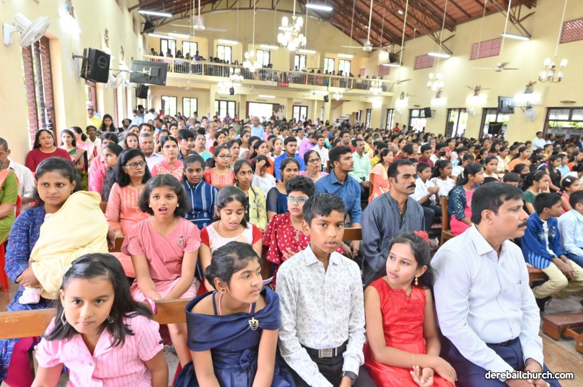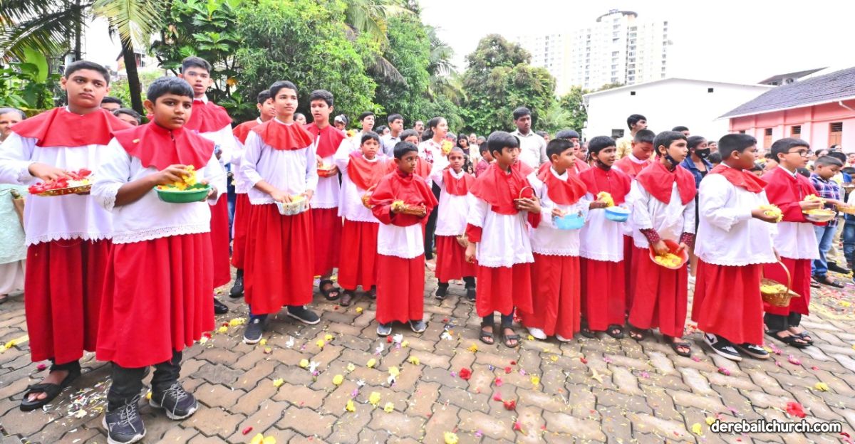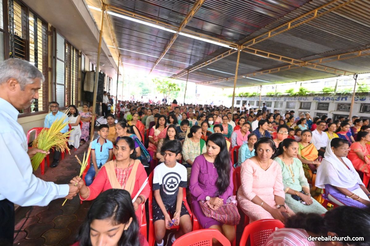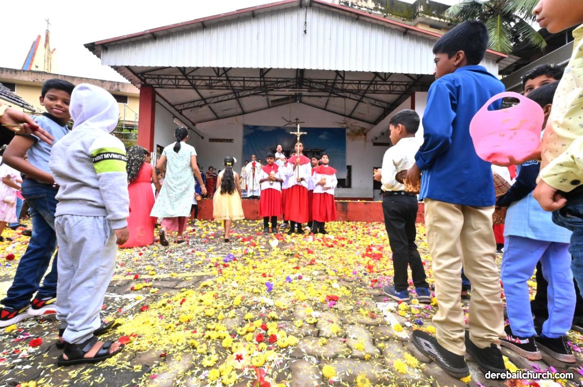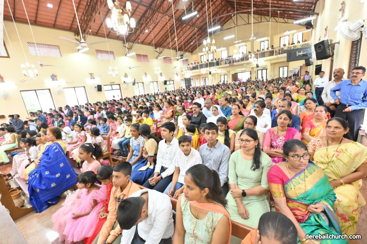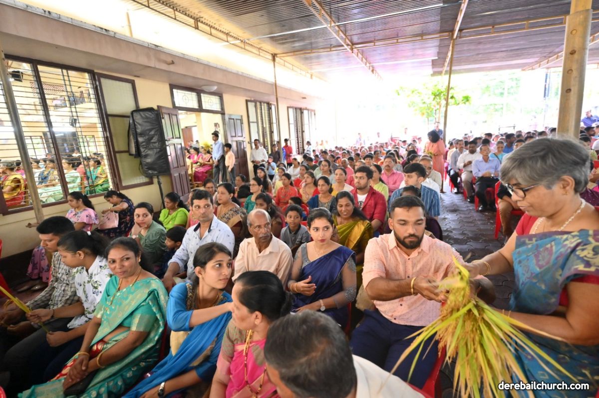 'Monthi Fest' or the Feast of Nativity of Blessed Virgin Mary was celebrated at Most Holy Redeemer Church Derebail on Thursday, 8 September, 2022. Preparations for the Feast was done with nine days of Novena participated by large number of people very specially children. The Novena masses were held at 5.30 in the evenings, followed by Novenas prayers and offering of flowers in front of the Grotto. The kids were offered with variety of sweets during the Novena days.