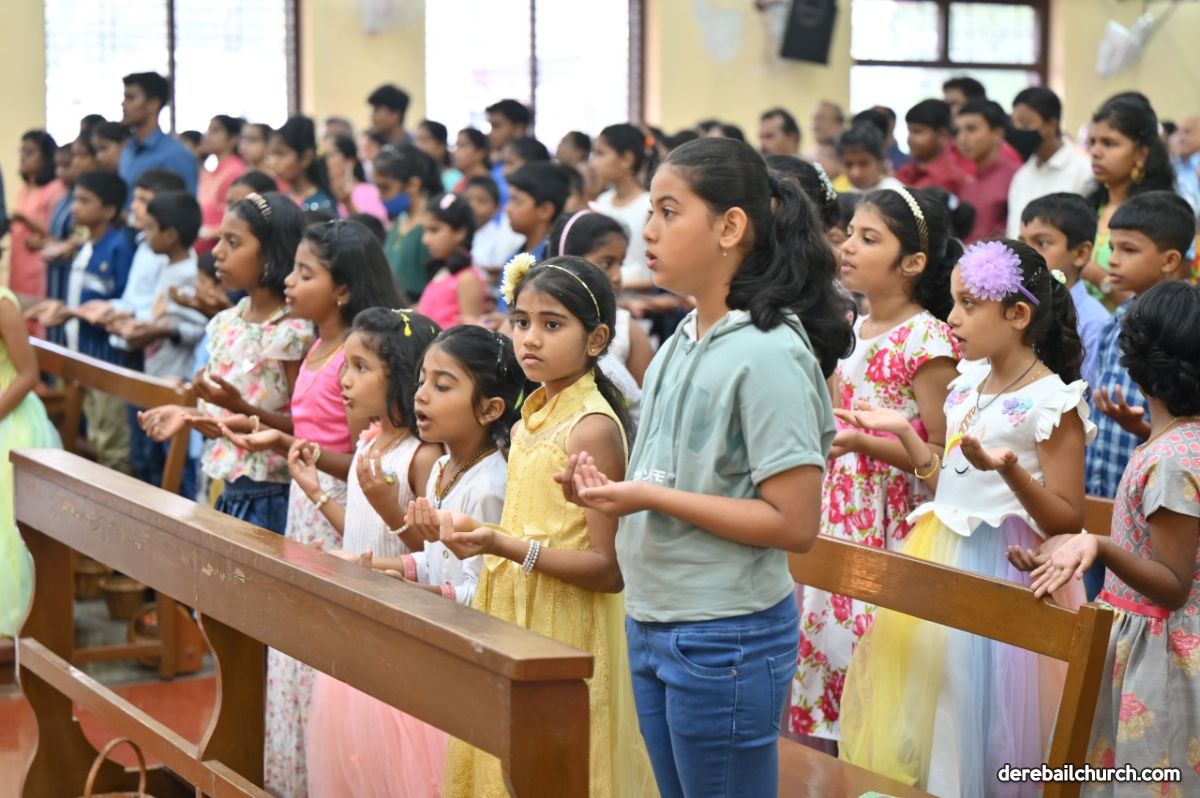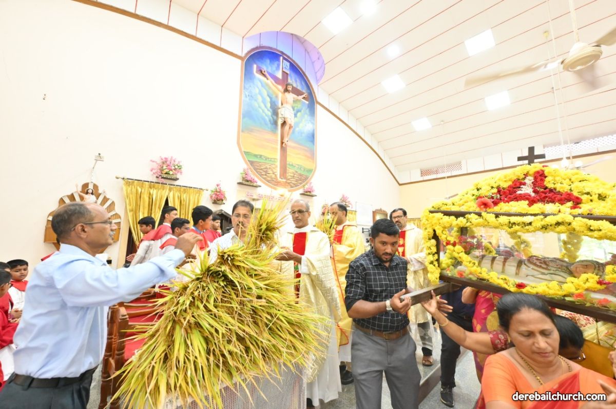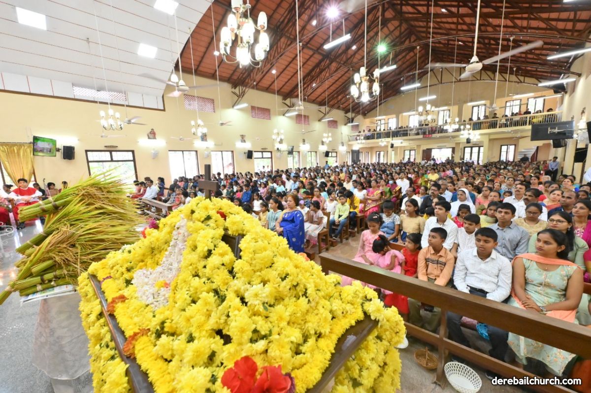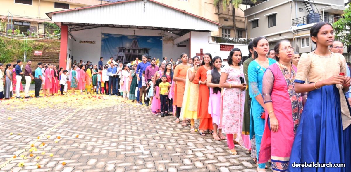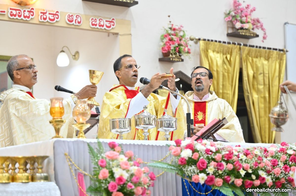 'Monthi Fest' or the Feast of Nativity of Blessed Virgin Mary was celebrated at Most Holy Redeemer Church Derebail on Thursday, 8 September, 2022. Preparations for the Feast was done with nine days of Novena participated by large number of people very specially children. The Novena masses were held at 5.30 in the evenings, followed by Novenas prayers and offering of flowers in front of the Grotto. The kids were offered with variety of sweets during the Novena days.