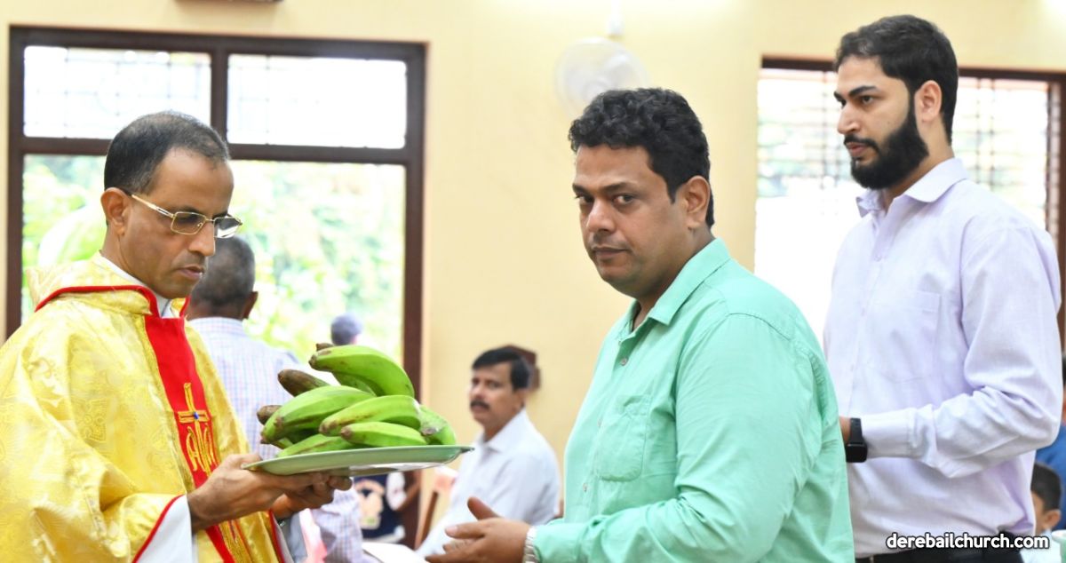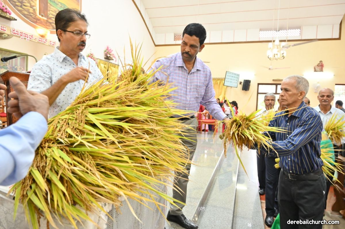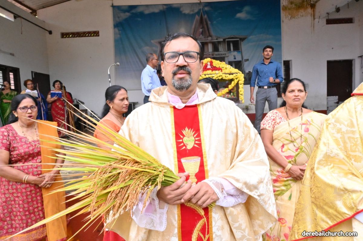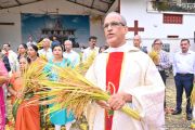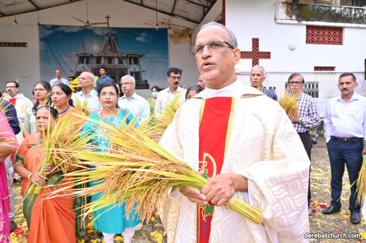 On the 8th of September, the Feast day, the parishioners assembled at Holy Family School Grounds at 7.30 a.m. where the ceremony began with a prayer service and the blessing of the new paddy grains. The ceremonial festal procession was rendered colourful with decorated Statue of Infant Mary, Brass Band, and choral singing. The solemn Eucharistic celebration was presided over by Fr Joseph Martis, Parish Priest and concelebrated by Fr Gerald Pinto and Fr Joel Pais. In his Homily, Fr. Joseph highlighted the significance of the day. He underscored the main aspect of the feast, namely family as the fundamental gift of God and how this feast should be an occasion to sit and eat together, visit the sick members of our families, and spend some time with the older folks of the family.