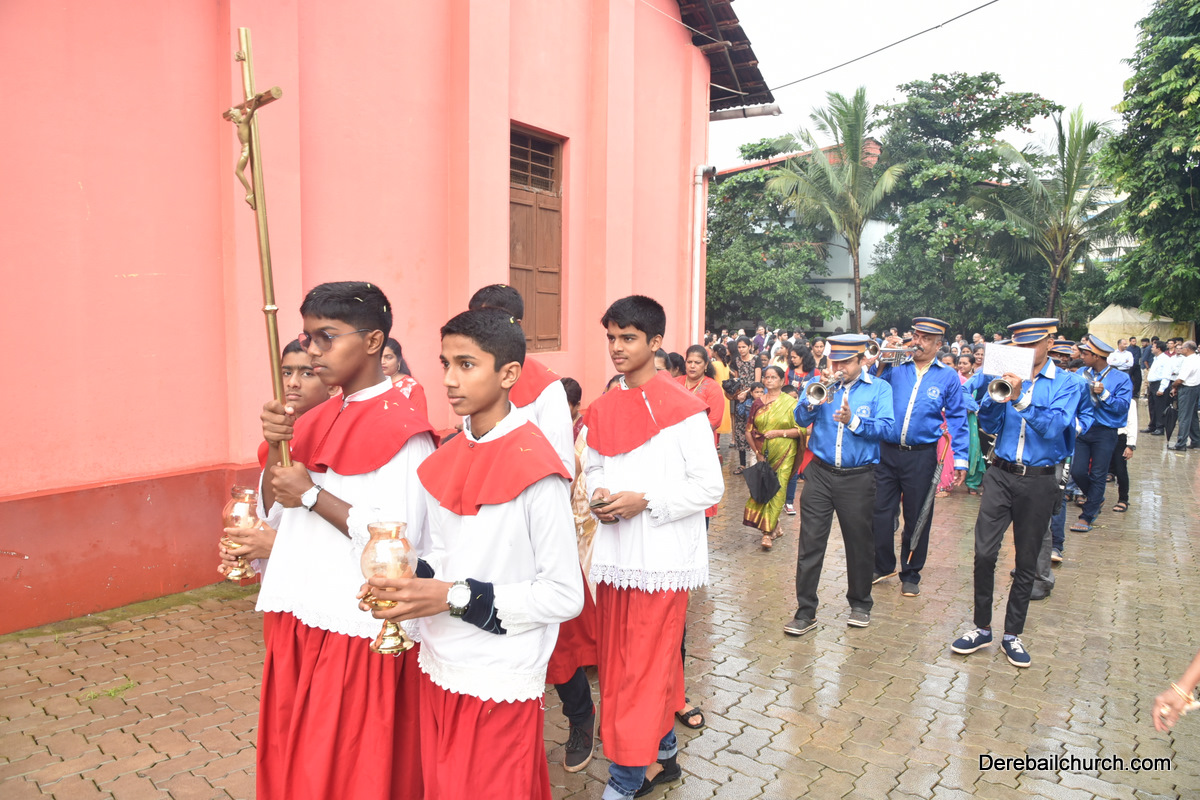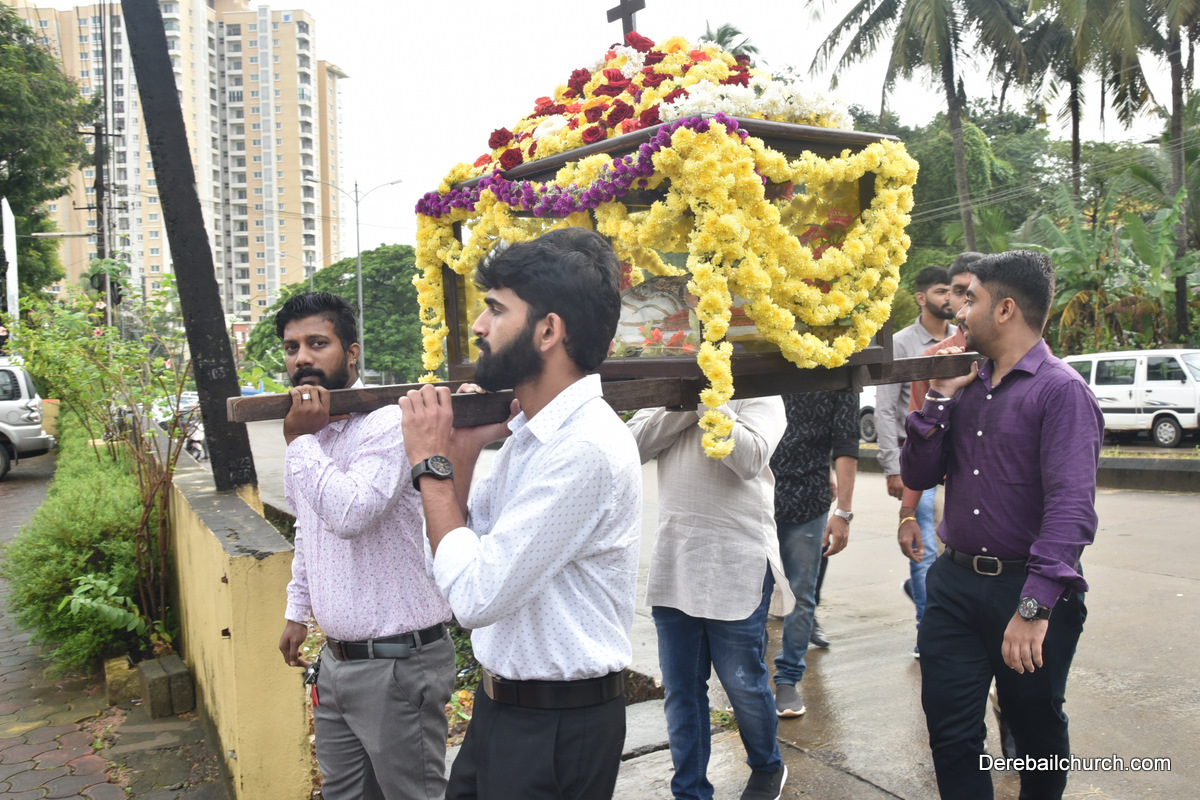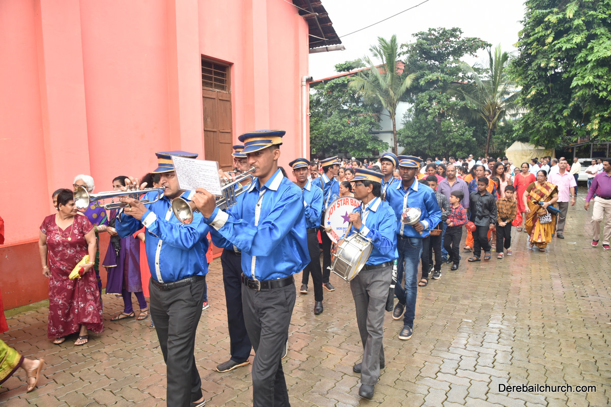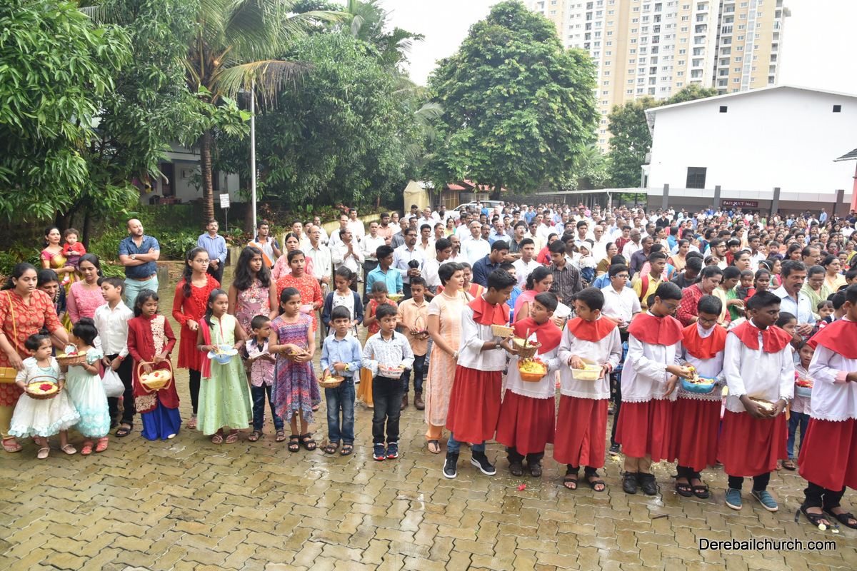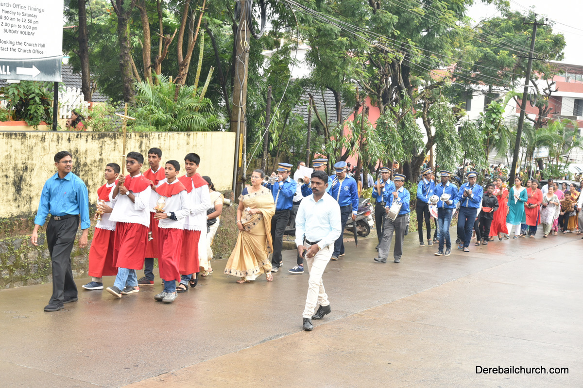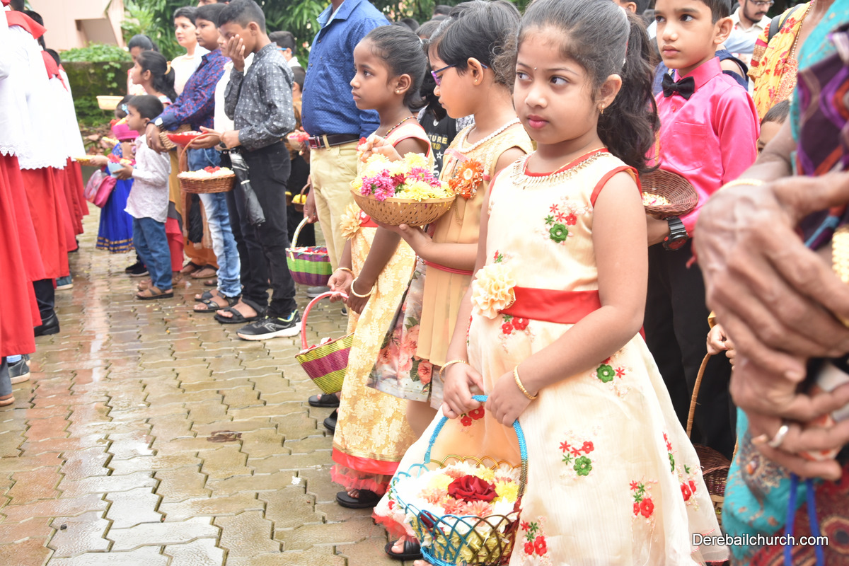 The Nativity celebrations at Derebail Parish began at 07:30 AM at the Holy Family school grounds. A large number of parishioners and children gathered with great devotion. The ceremony began with prayer service and blessing of the new grains. This was followed by the veneration of statue of Infant Mary and the procession.
