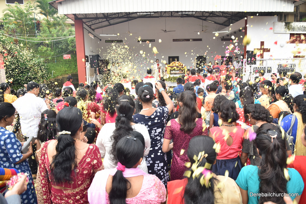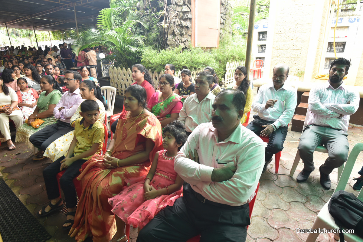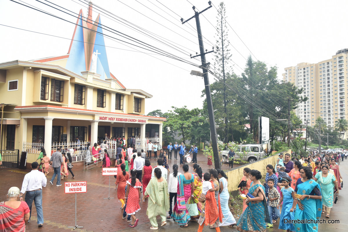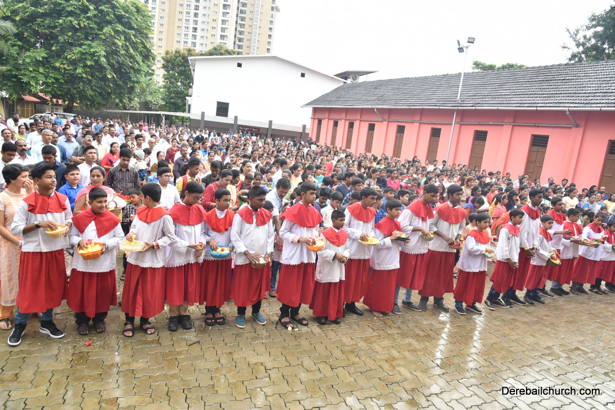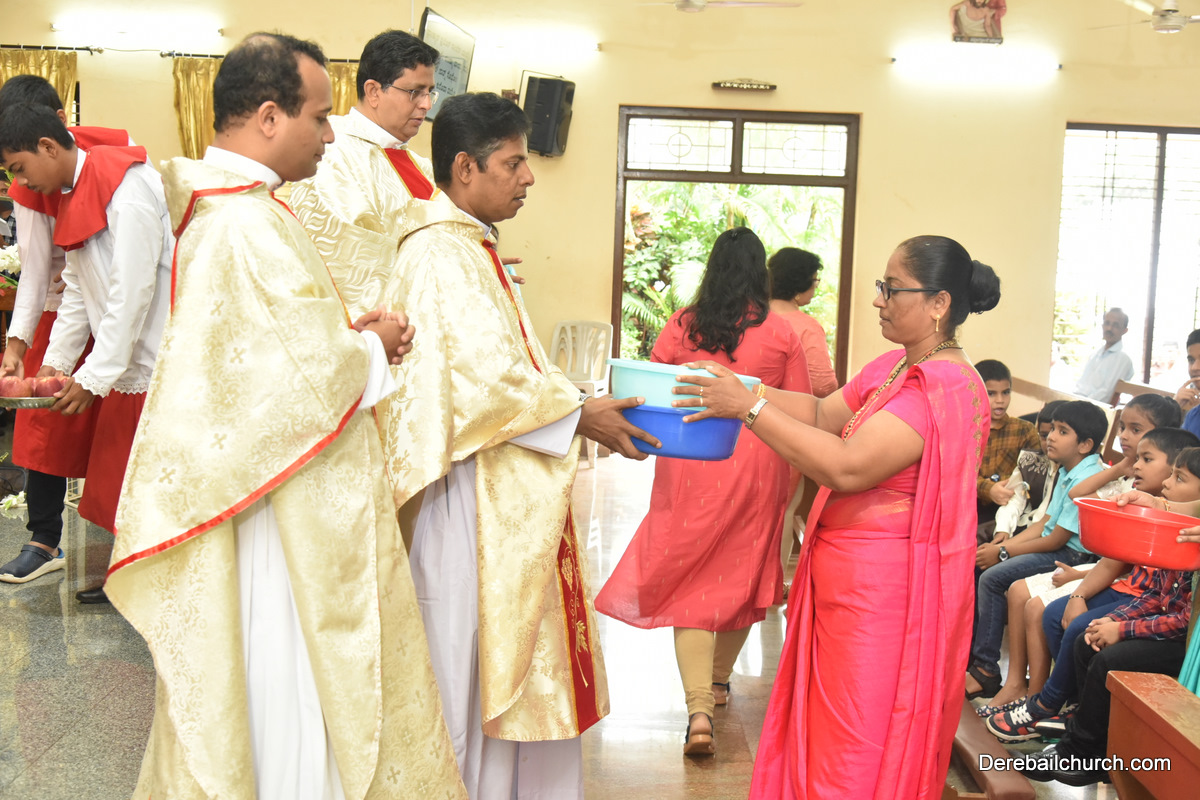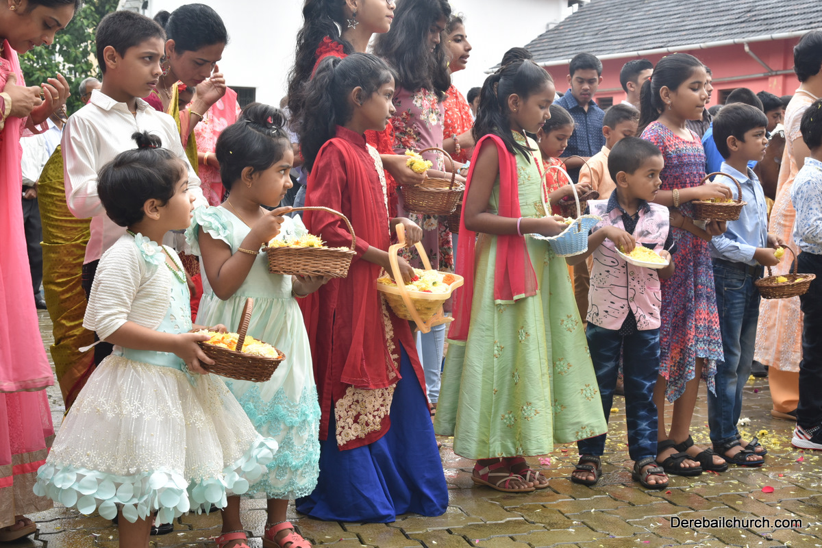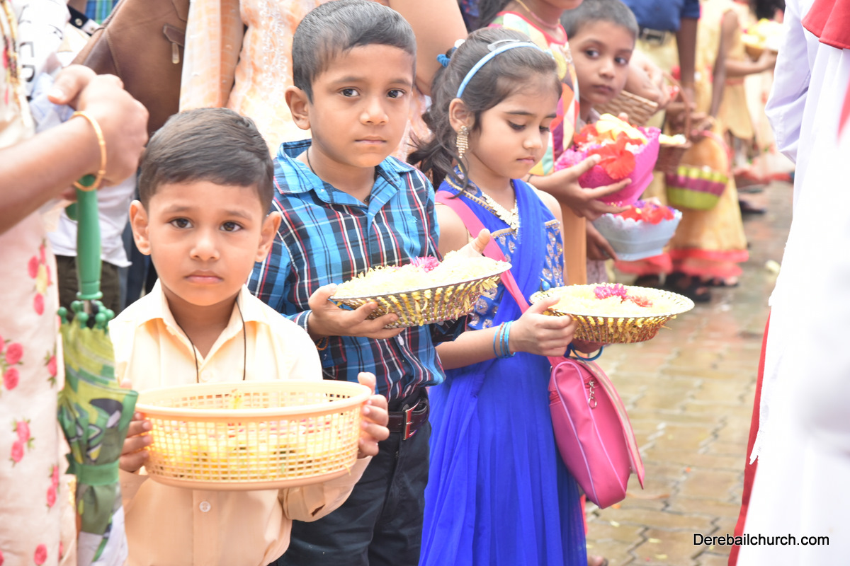 The Nativity celebrations at Derebail Parish began at 07:30 AM at the Holy Family school grounds. A large number of parishioners and children gathered with great devotion. The ceremony began with prayer service and blessing of the new grains. This was followed by the veneration of statue of Infant Mary and the procession.