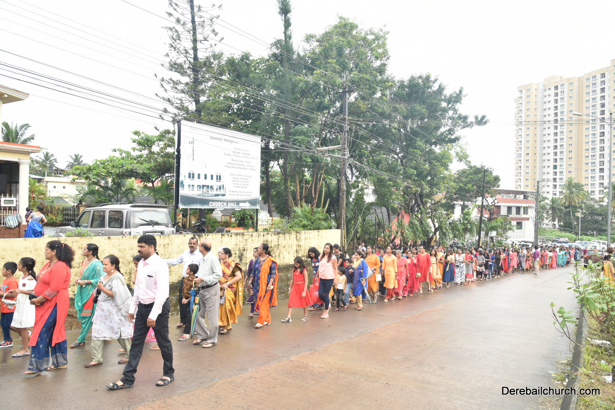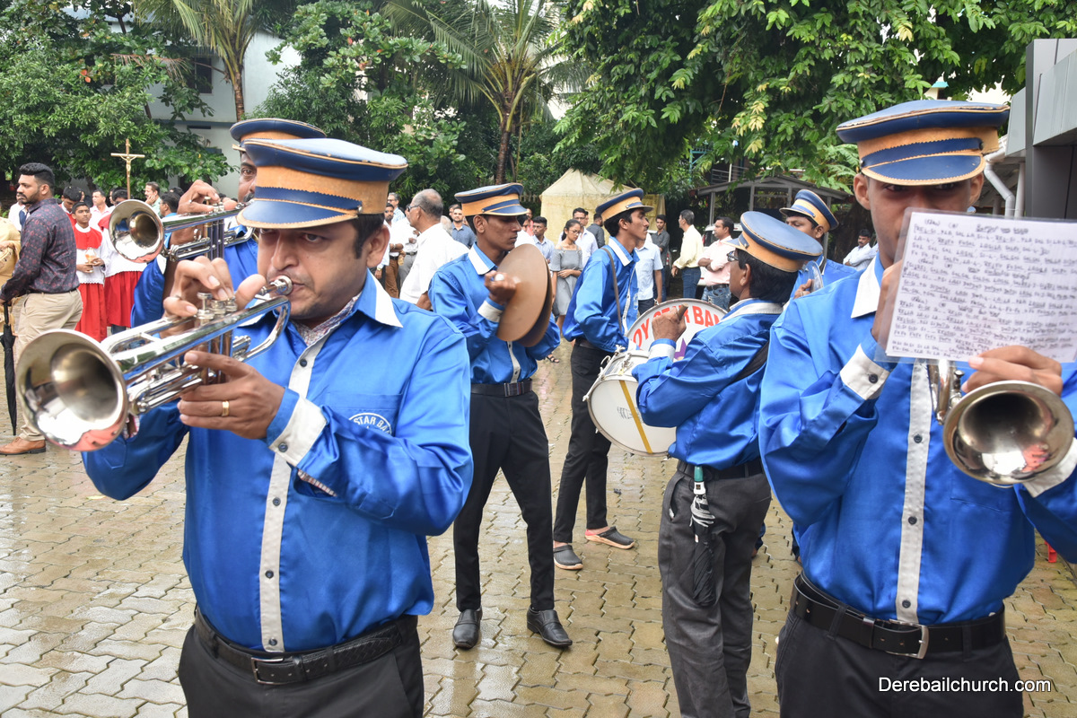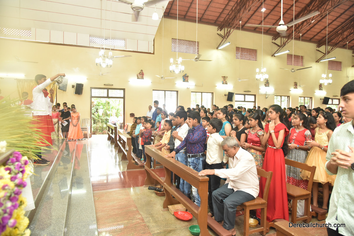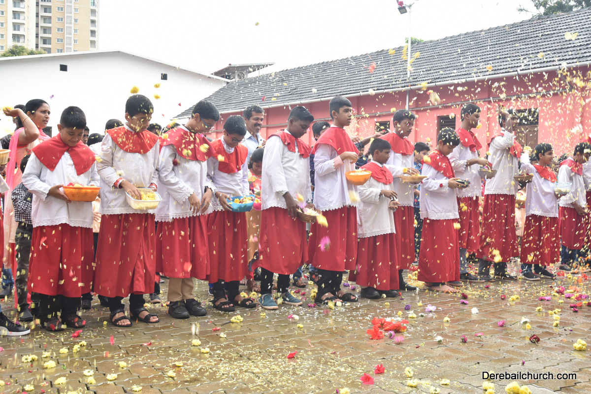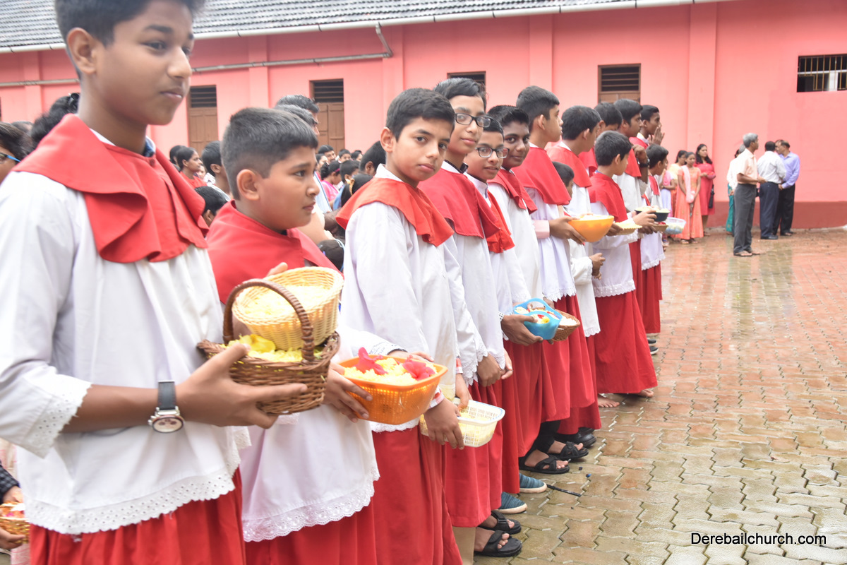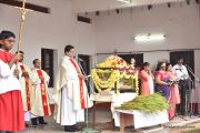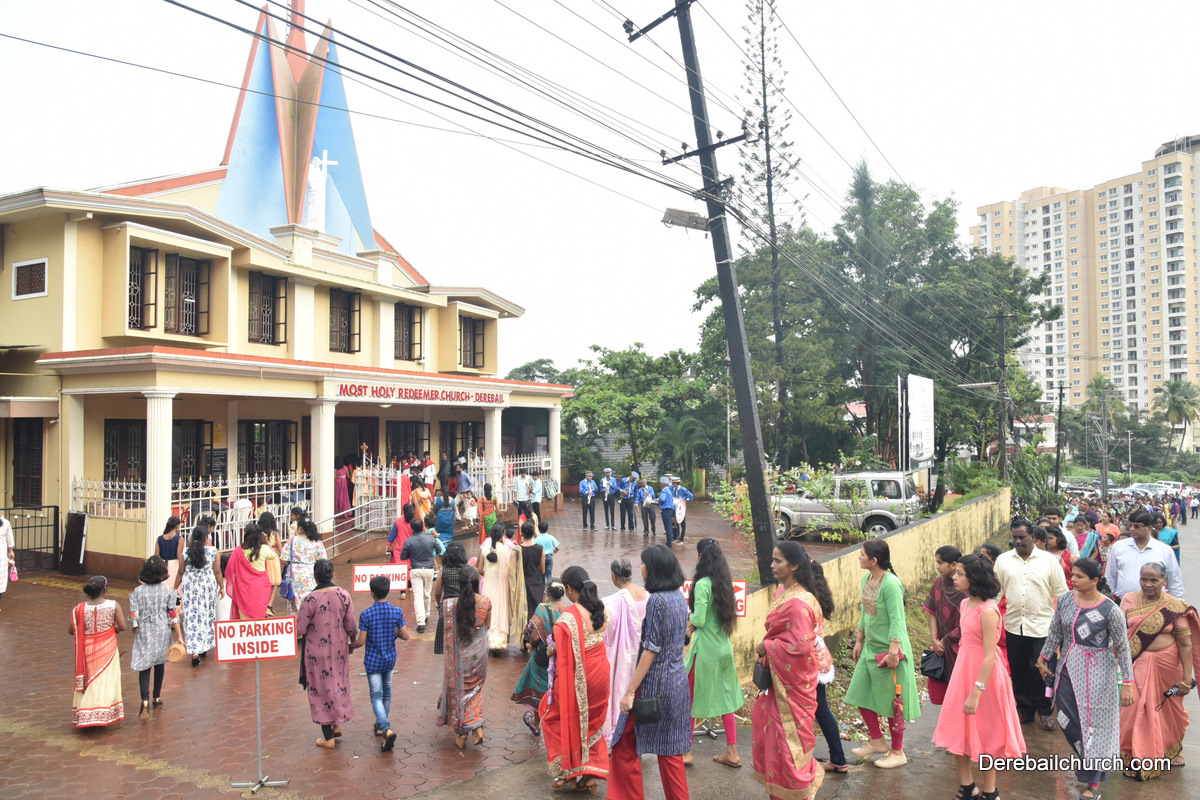 The Nativity celebrations at Derebail Parish began at 07:30 AM at the Holy Family school grounds. A large number of parishioners and children gathered with great devotion. The ceremony began with prayer service and blessing of the new grains. This was followed by the veneration of statue of Infant Mary and the procession.