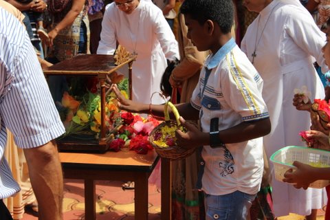 Eucharistic Celebration usually begins at 5.30.P.M. followed by the novena and strewing of flowers. After the strewing of flowers children are given sweets. On the 8th of September children walk in a grand procession strewing flowers all the way till the church and collect their share of Sugarcane after the Eucharistic Celebration.