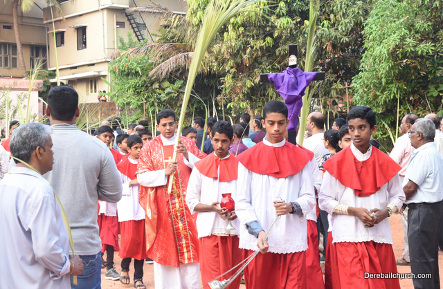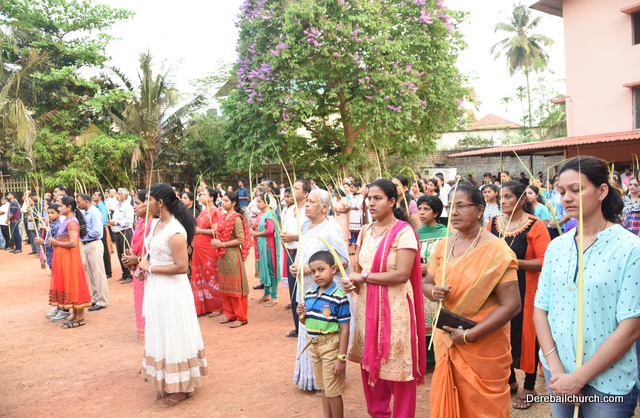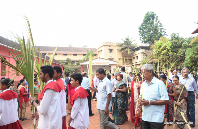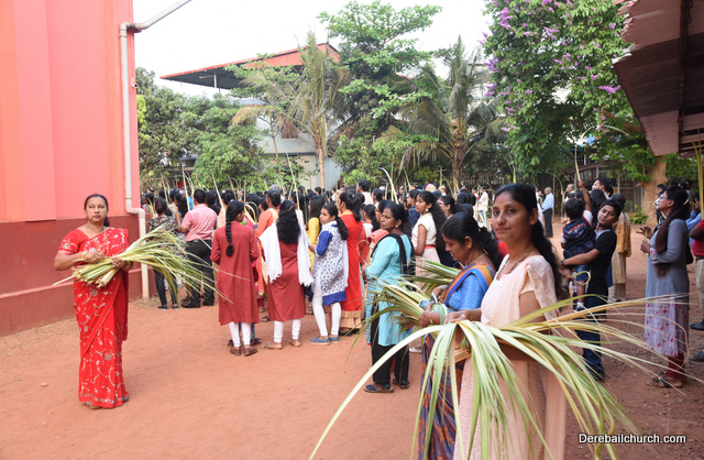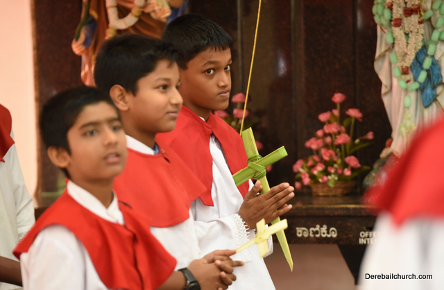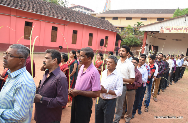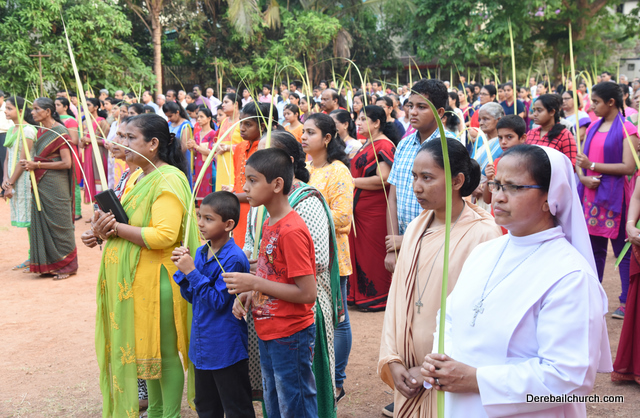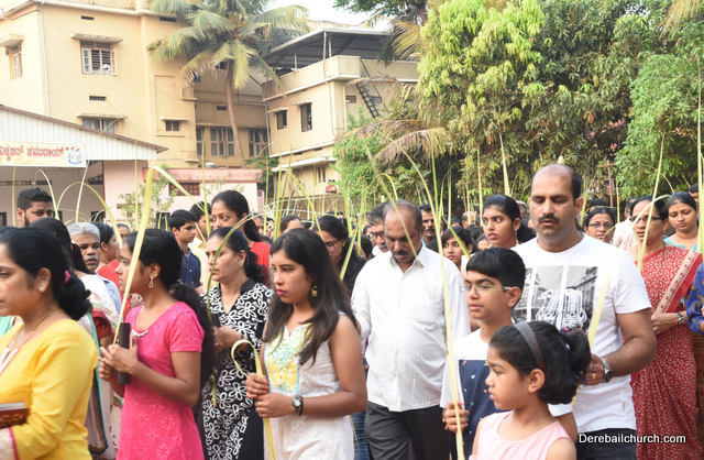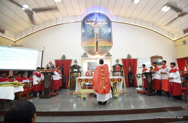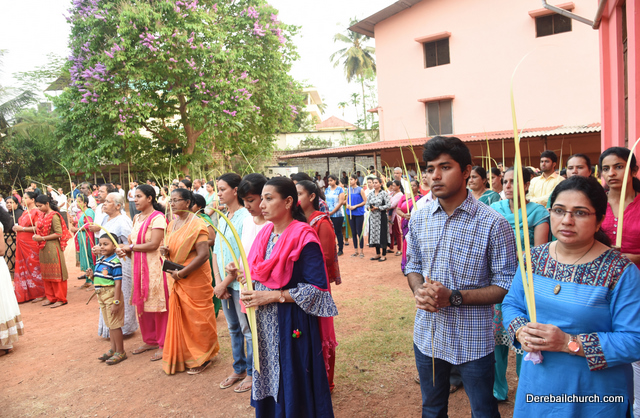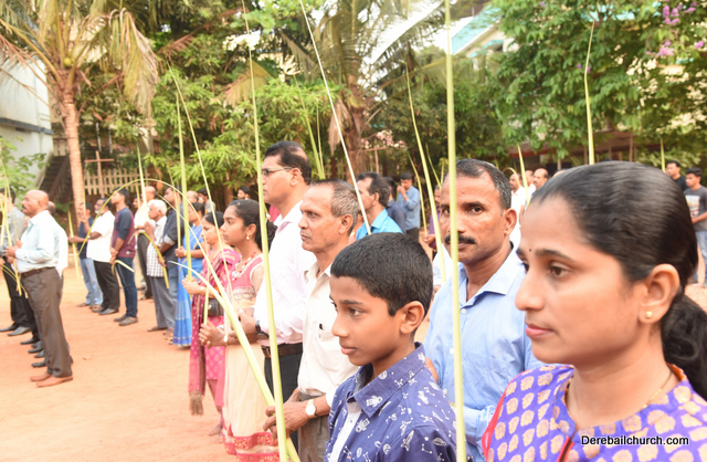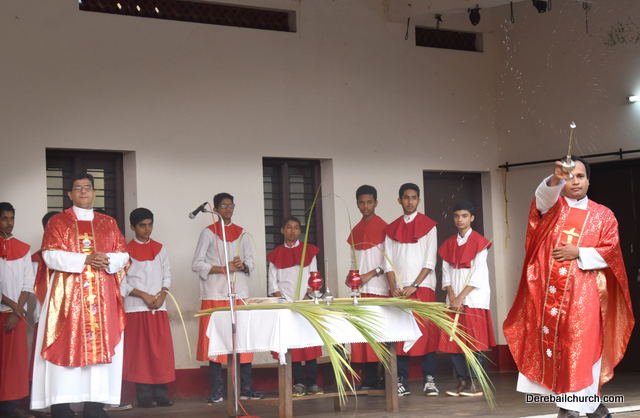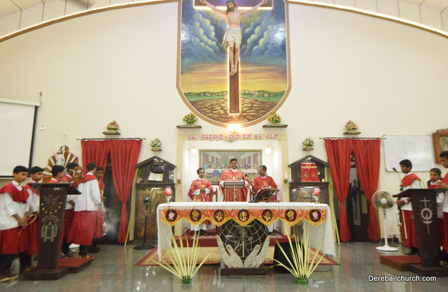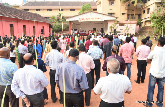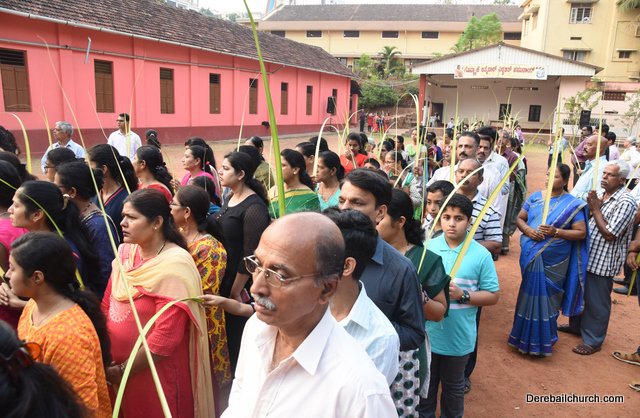Palm Sunday marks the beginning of the Holy Week, a week that Christians all over the world spend on recollection of our Lord's great sacrifice and resurrection.  Palm sundaycommemorates Jesus's triumphal entry into Jerusalem. The Palm Sunday celebration at Most Holy Redeemer Church, Derebail commenced at 7 AM on the 25th of March, at Holy Family School grounds, Derebail. The coconut Palm symbolic of the olive palm with which Jesus was welcomed into Jerusalem was handed over to the Parishioners.  This was followed by a procession to the church.