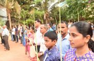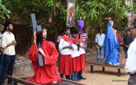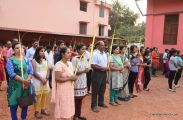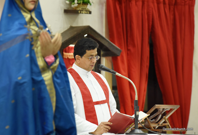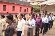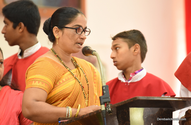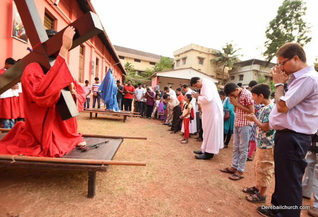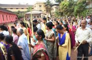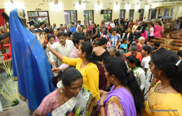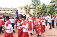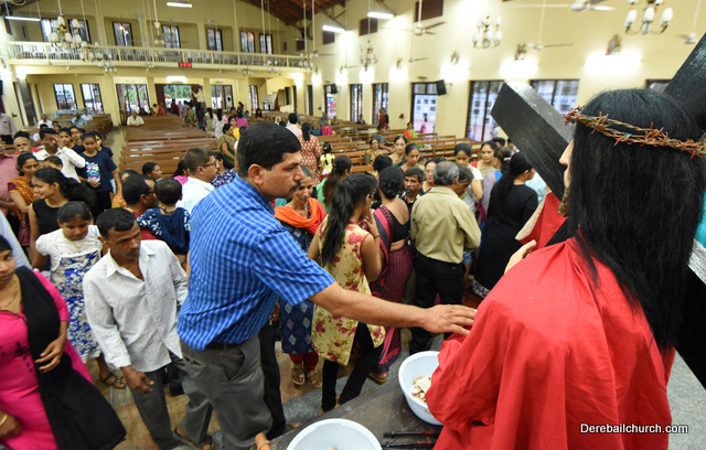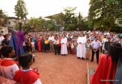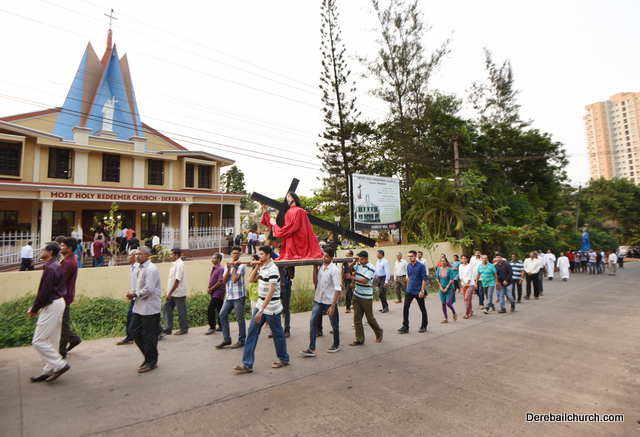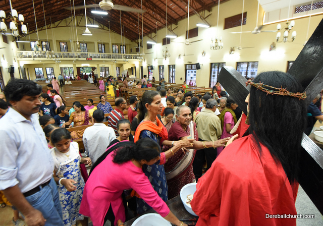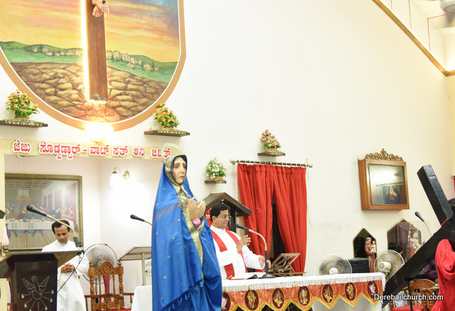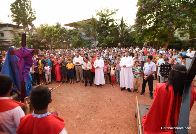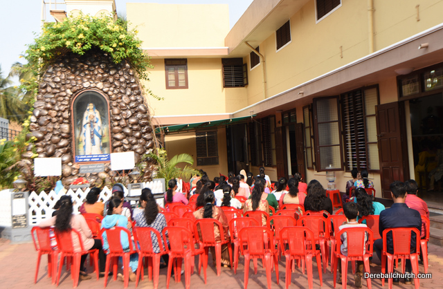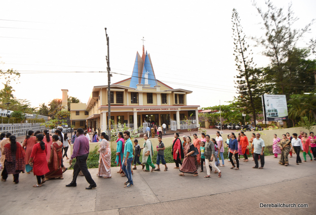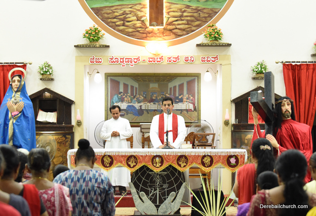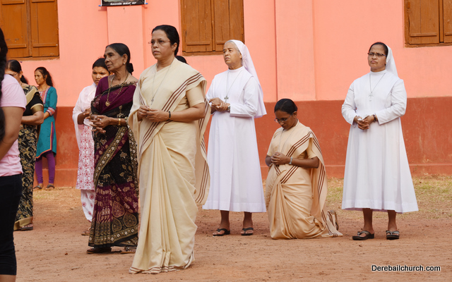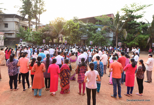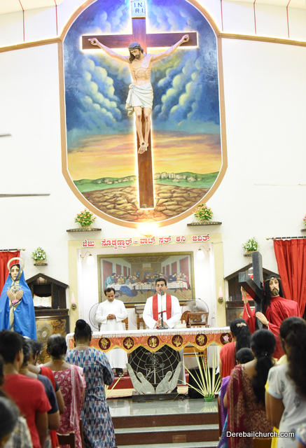 A Way of the Cross was conducted on the same day at 5 PM at Holy Family School Grounds , Derebail. The Way of the Cross was carried out effectively by the members of the choir. This was followed by a procession to the church with the Cross and statue of Mother Mary.  A short prayer service was conducted in the church which also included a reading from the Gospel and sermon by Fr. Austin Peres.