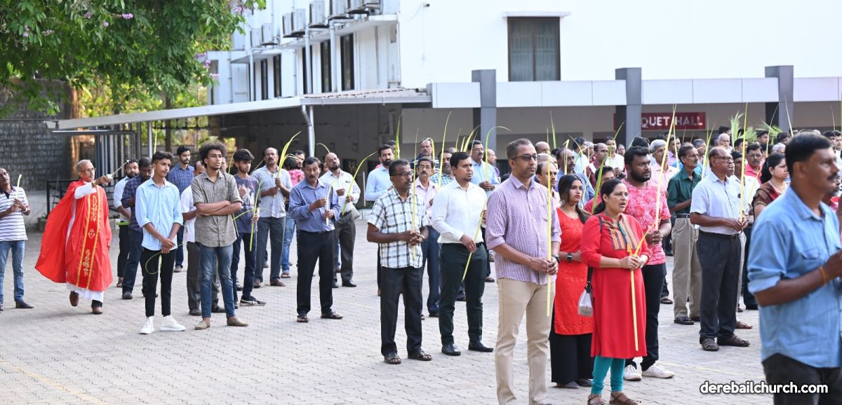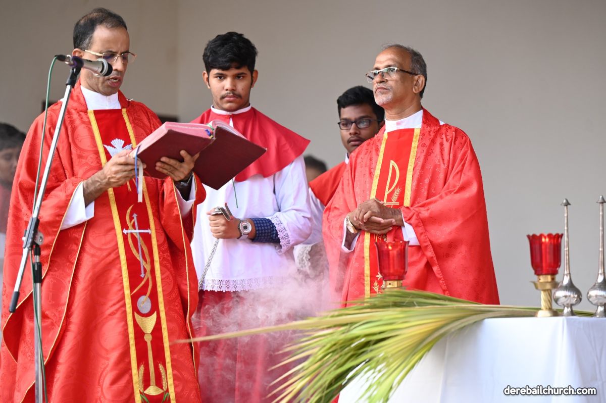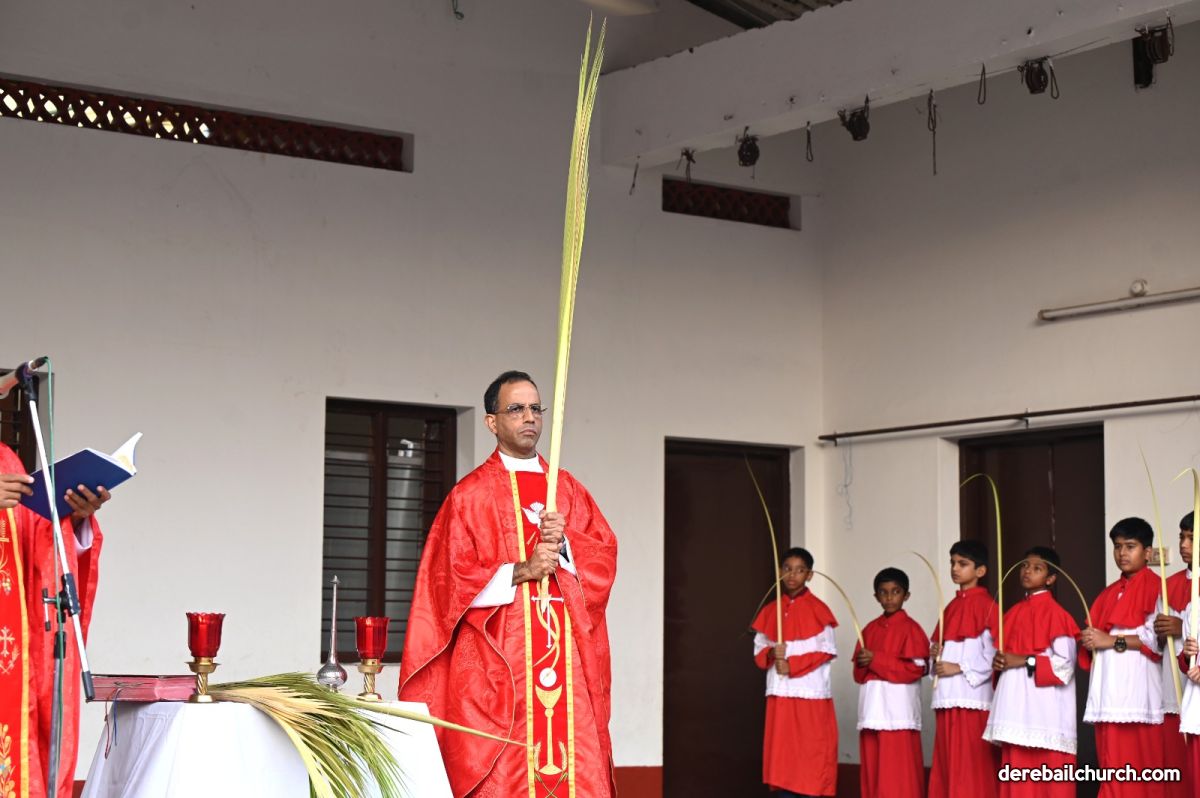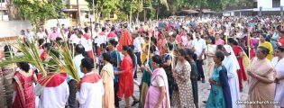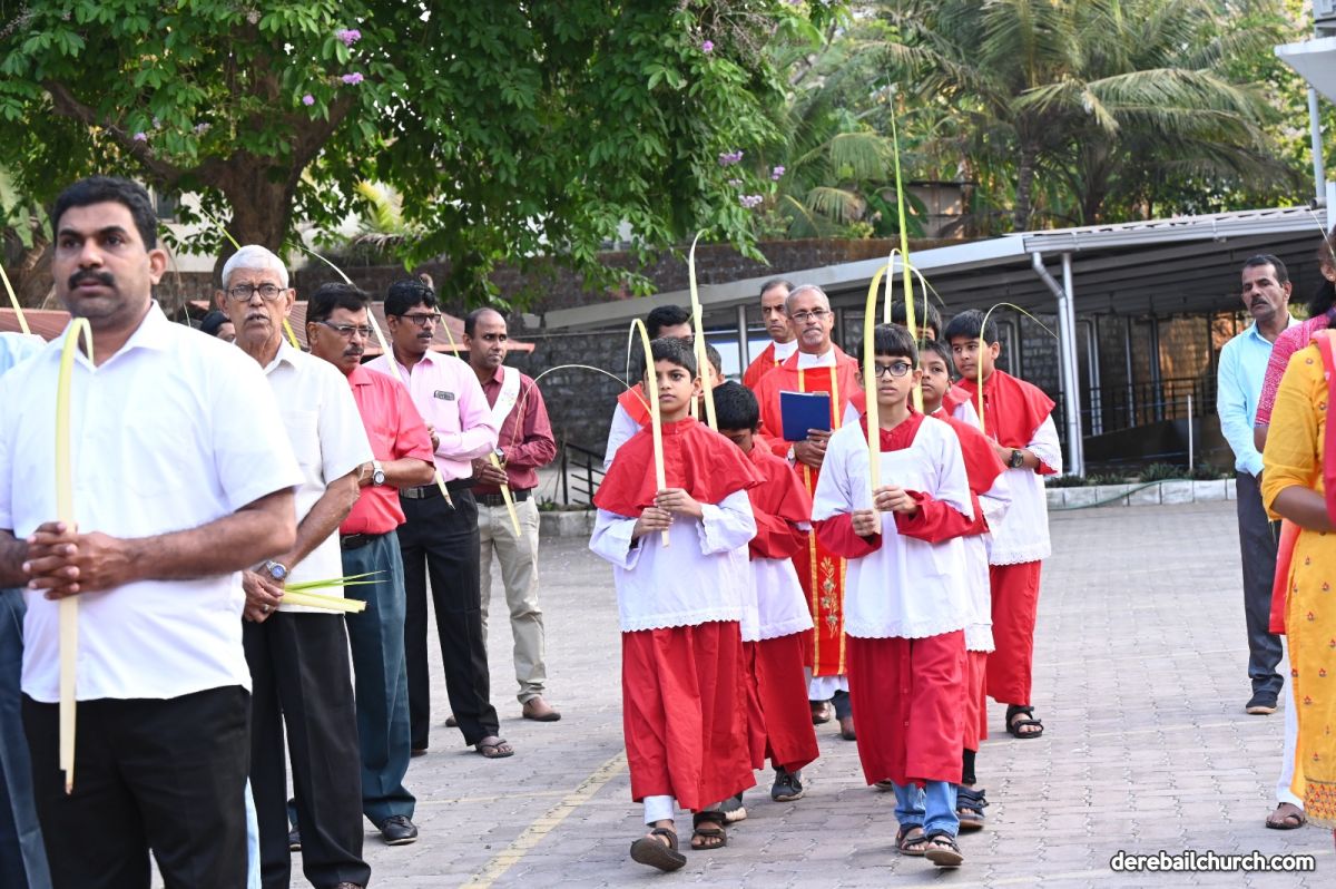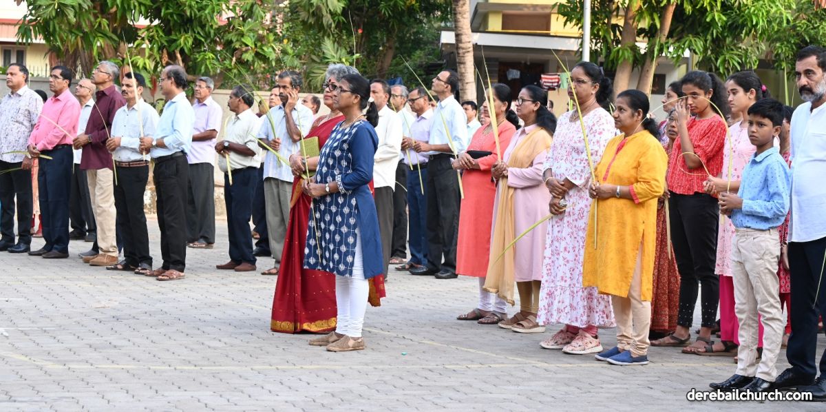 The parishioners gathered at the Church Grounds at 7 AM, where the ceremony began with an opening prayer by Fr Gerald. The palms were blessed by Fr Joseph Martis, Parish priest, the Holy water was sprinkled on all parishioners by the priests. After this, the parishioners followed Rev.Fr.Joseph Martis and Rev.Gerald Pinto with palms in their hands to the church (hall). The covered Cross, thurible and incense, altar boys and then all the faithful followed.