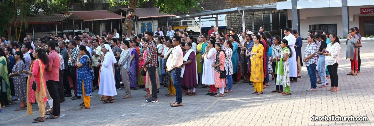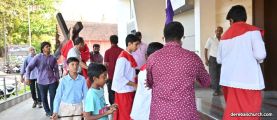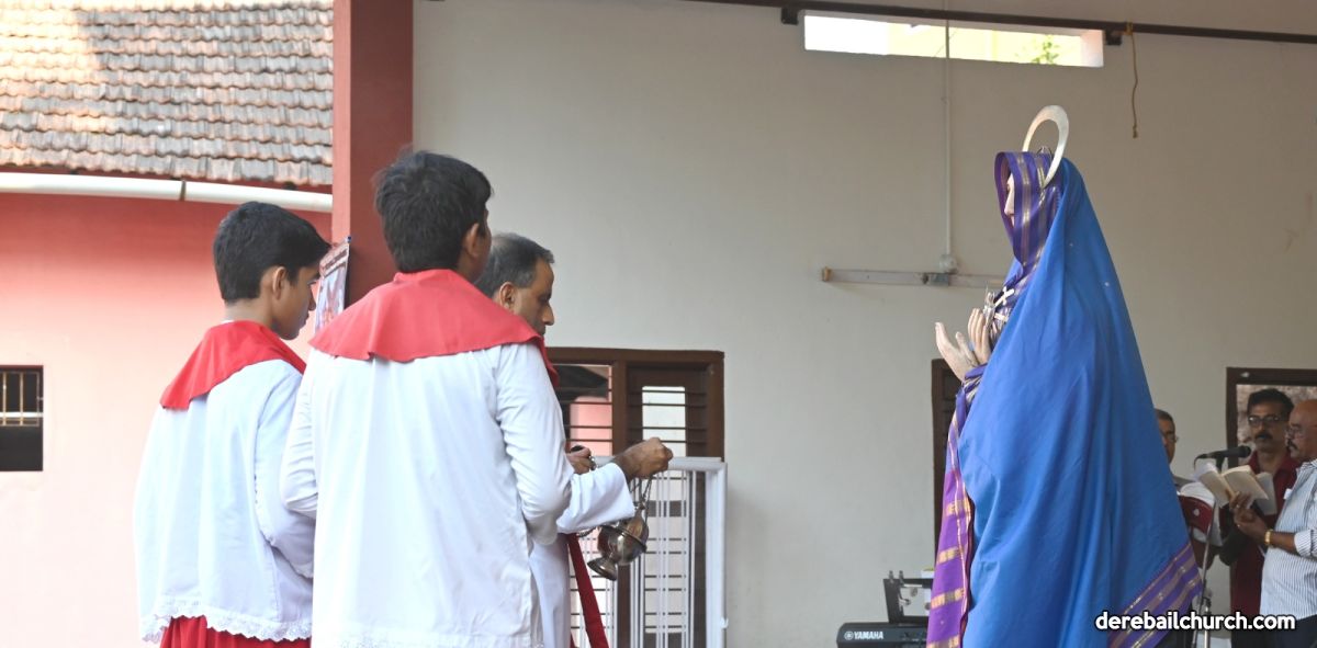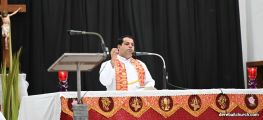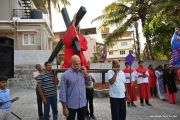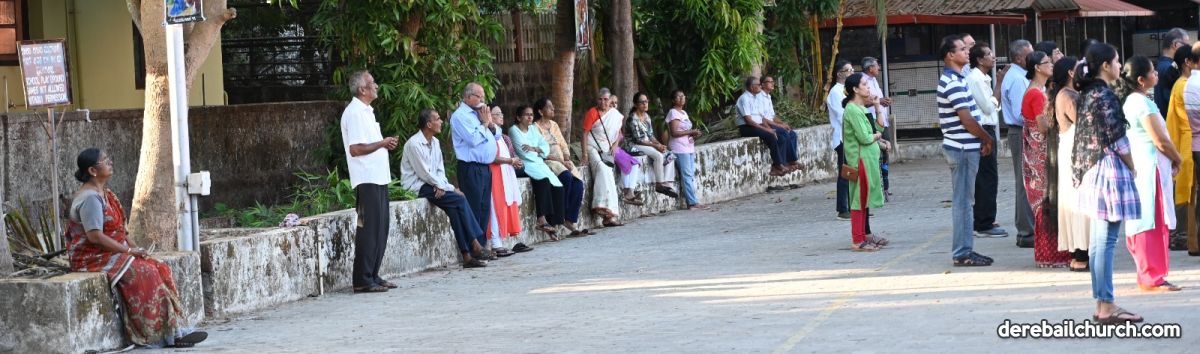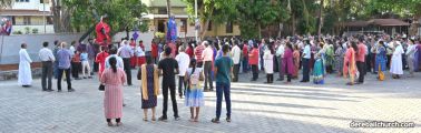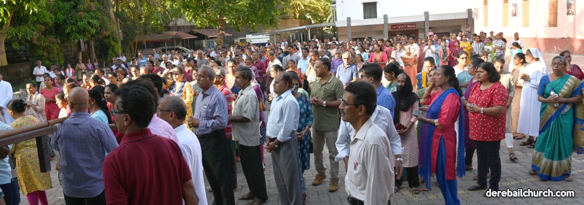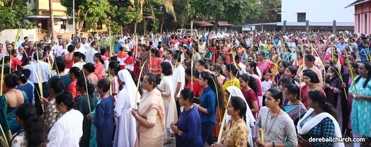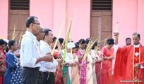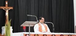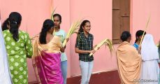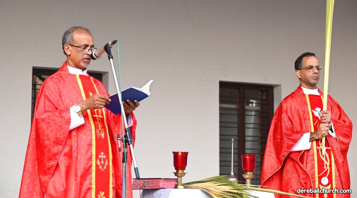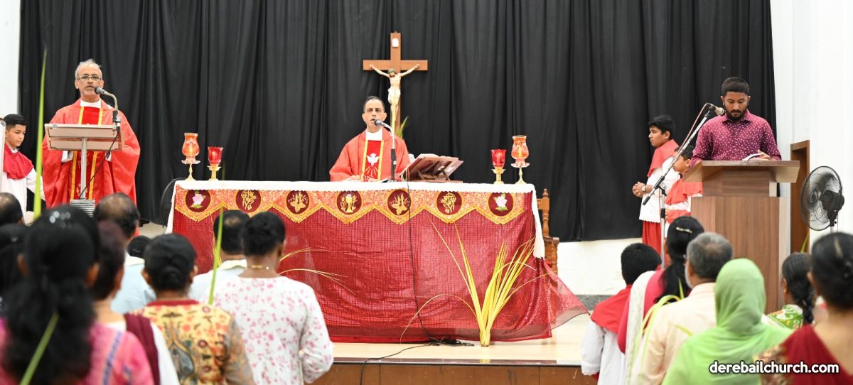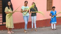 The parishioners gathered at the Church Grounds at 7 AM, where the ceremony began with an opening prayer by Fr Gerald. The palms were blessed by Fr Joseph Martis, Parish priest, the Holy water was sprinkled on all parishioners by the priests. After this, the parishioners followed Rev.Fr.Joseph Martis and Rev.Gerald Pinto with palms in their hands to the church (hall). The covered Cross, thurible and incense, altar boys and then all the faithful followed.
