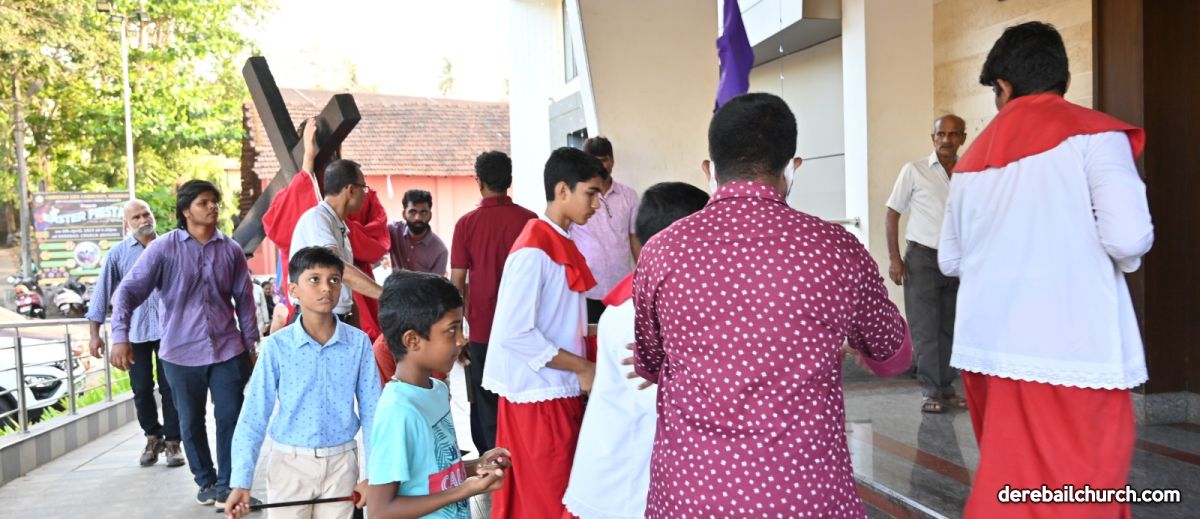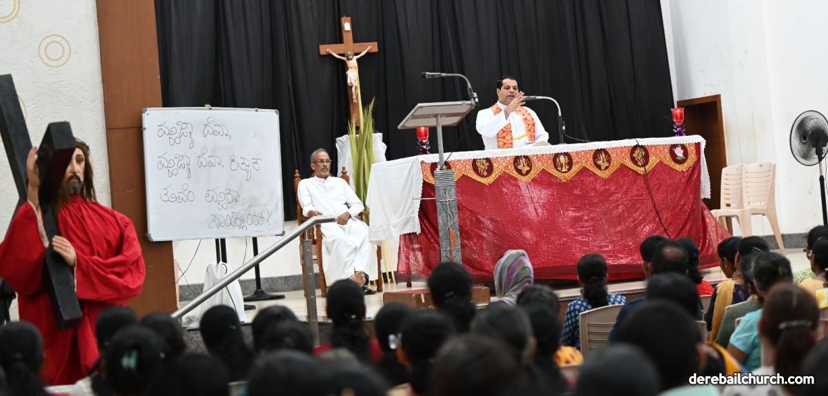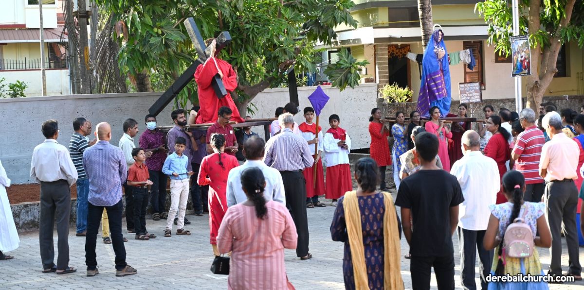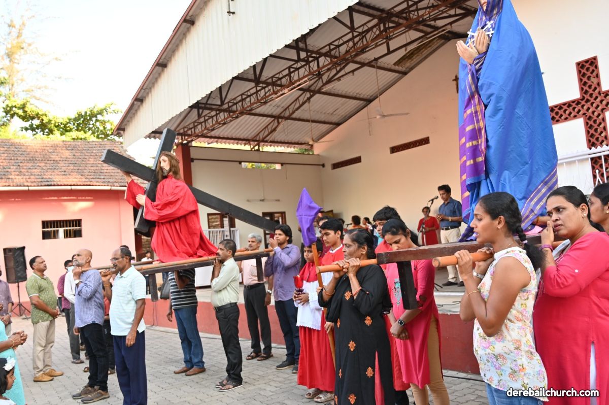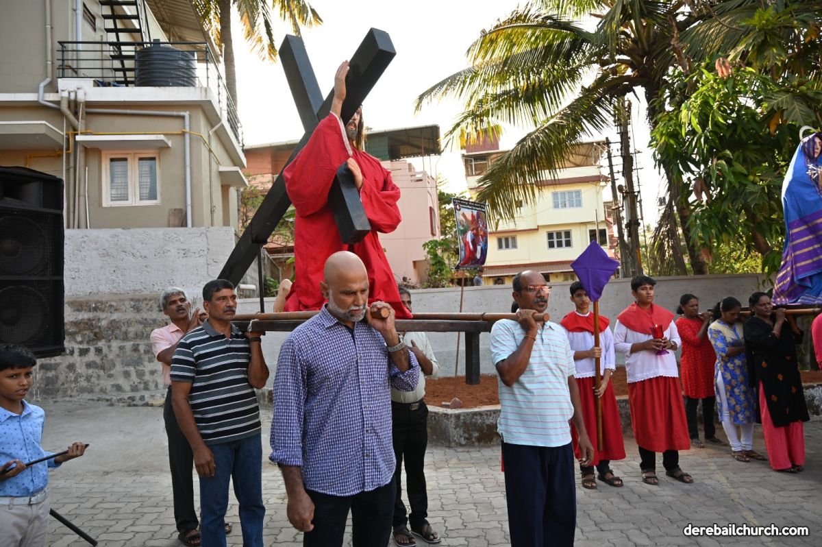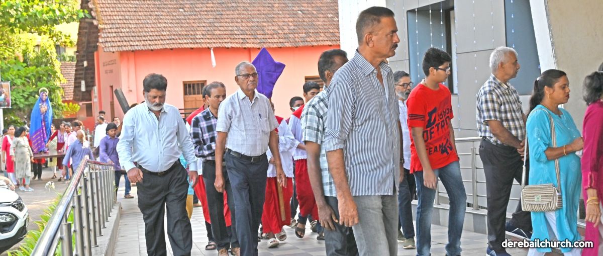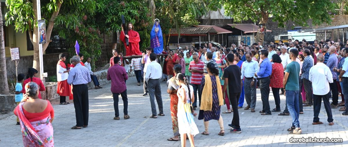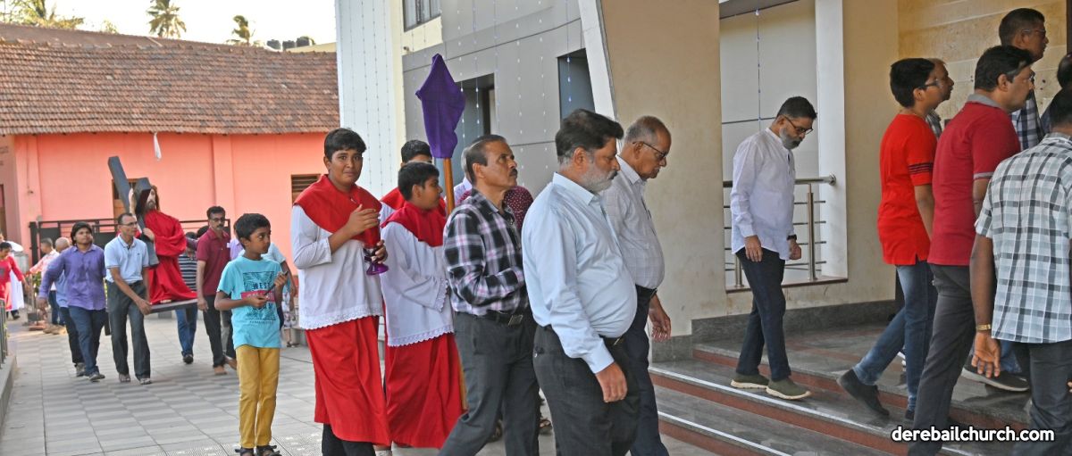 In the evening, the devotion of the Way of the Cross was held at 5 PM. The Parish Pastoral Council members led the Way of the Cross by reading each station. The statues of Jesus carrying the cross and Sorrowful Mother made their way through each station by men and women carrying the statues respectively. The Way of the Cross ended at the Church Hall were all the parishioners gathered for a reflection. Rev. Fr Robert Dsouza, Principal – Lourdes Central Board School, gave an insightful reflection on how Jesus requires us in various instances. He used a boat from a fisherman to preach, bread and fish from a little boy to feed the multitude, raised Lazarus from the dead to show God’s glory, a Donkey for a joyous entry to Jerusalem.
