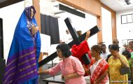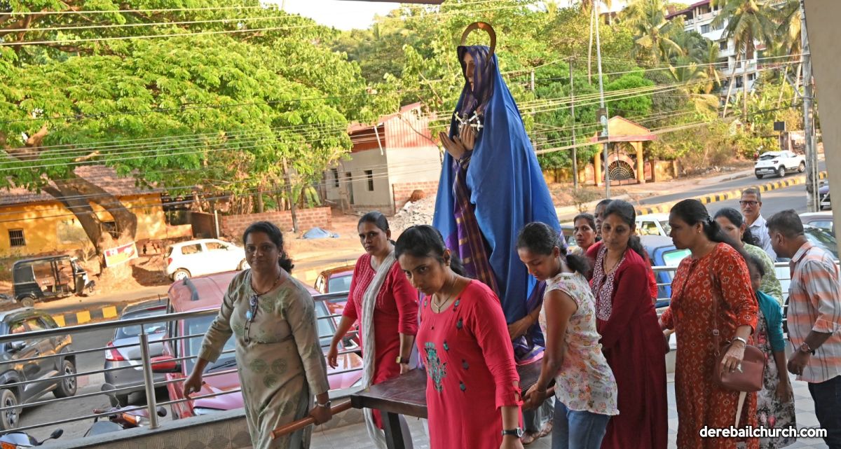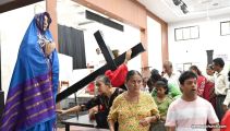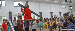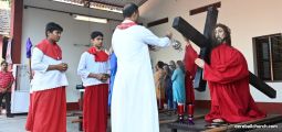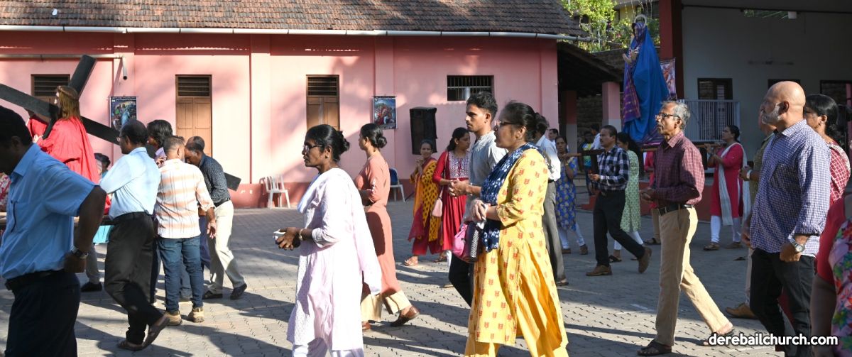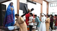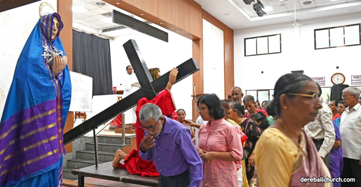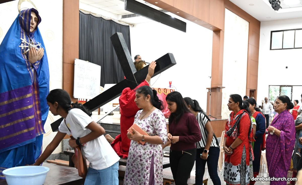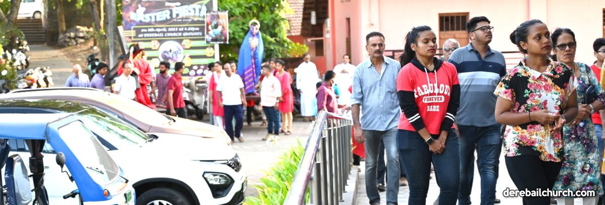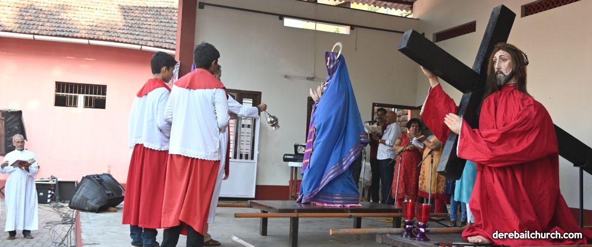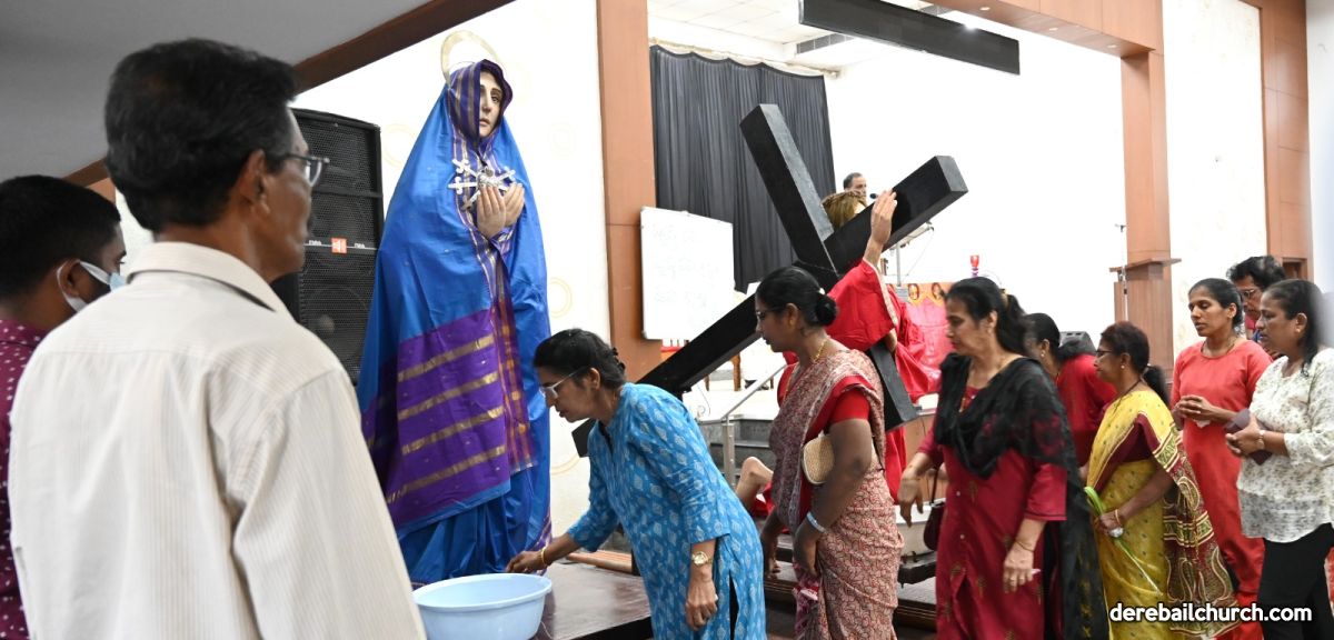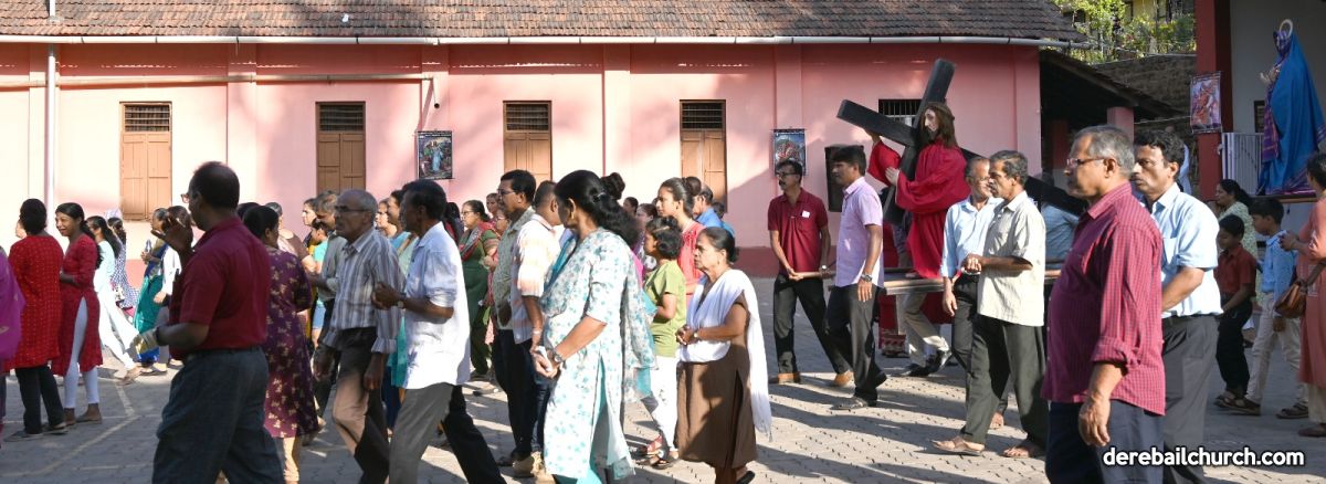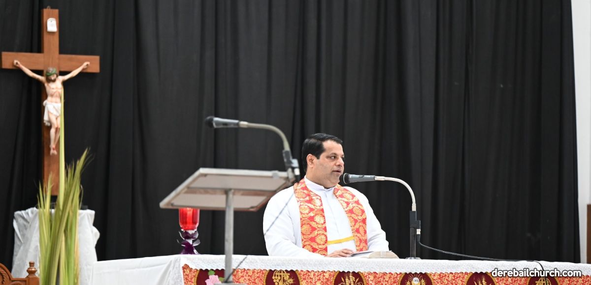In the evening, the devotion of the Way of the Cross was held at 5 PM. The Parish Pastoral Council members led the Way of the Cross by reading each station. The statues of Jesus carrying the cross and Sorrowful Mother made their way through each station by men and women carrying the statues respectively. The Way of the Cross ended at the Church Hall were all the parishioners gathered for a reflection. Rev. Fr Robert Dsouza, Principal – Lourdes Central Board School, gave an insightful reflection on how Jesus requires us in various instances. He used a boat from a fisherman to preach, bread and fish from a little boy to feed the multitude, raised Lazarus from the dead to show God’s glory, a Donkey for a joyous entry to Jerusalem.