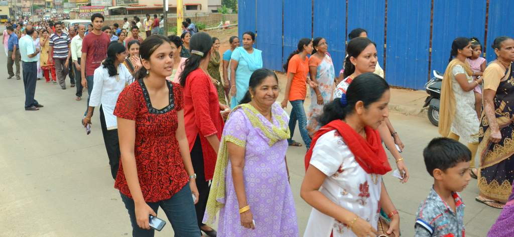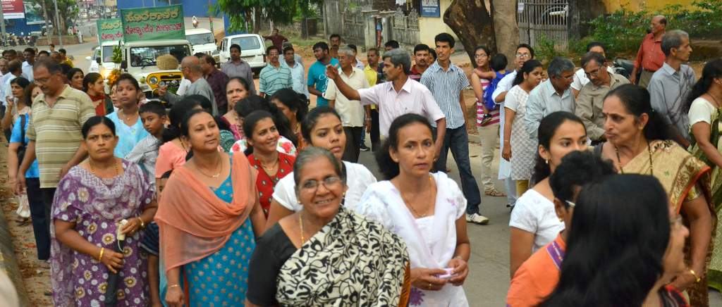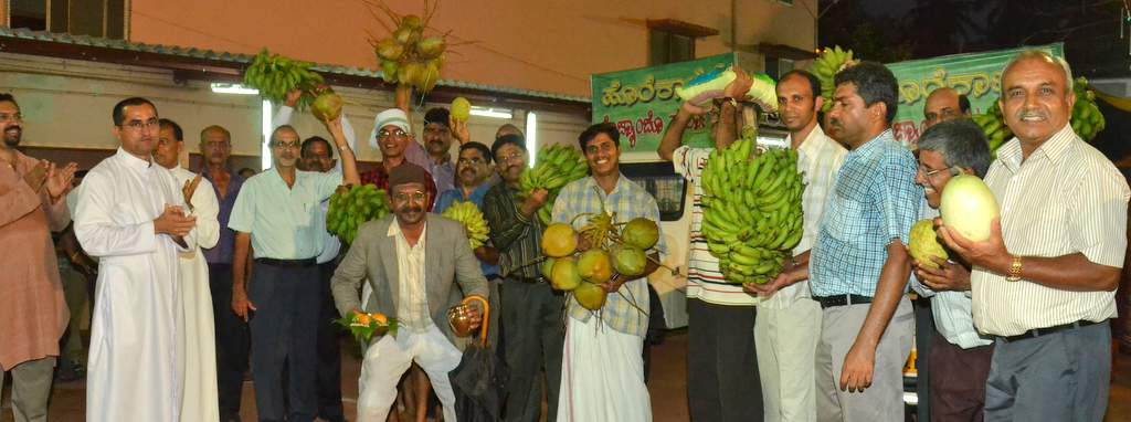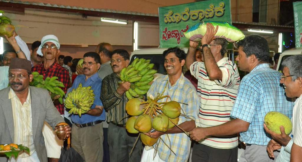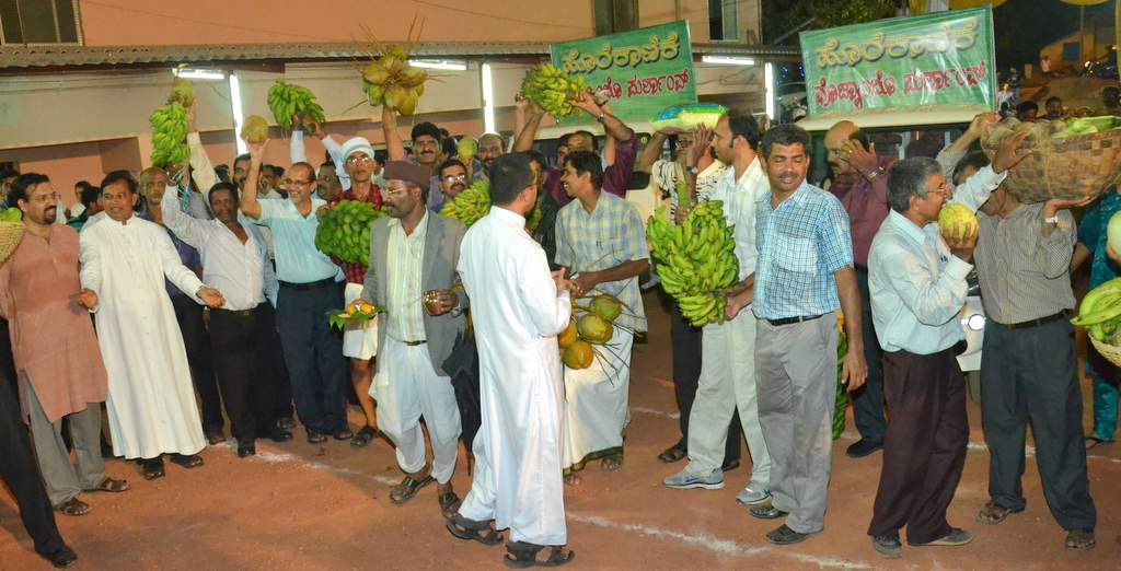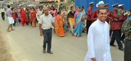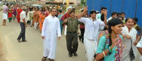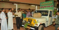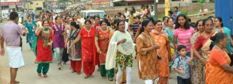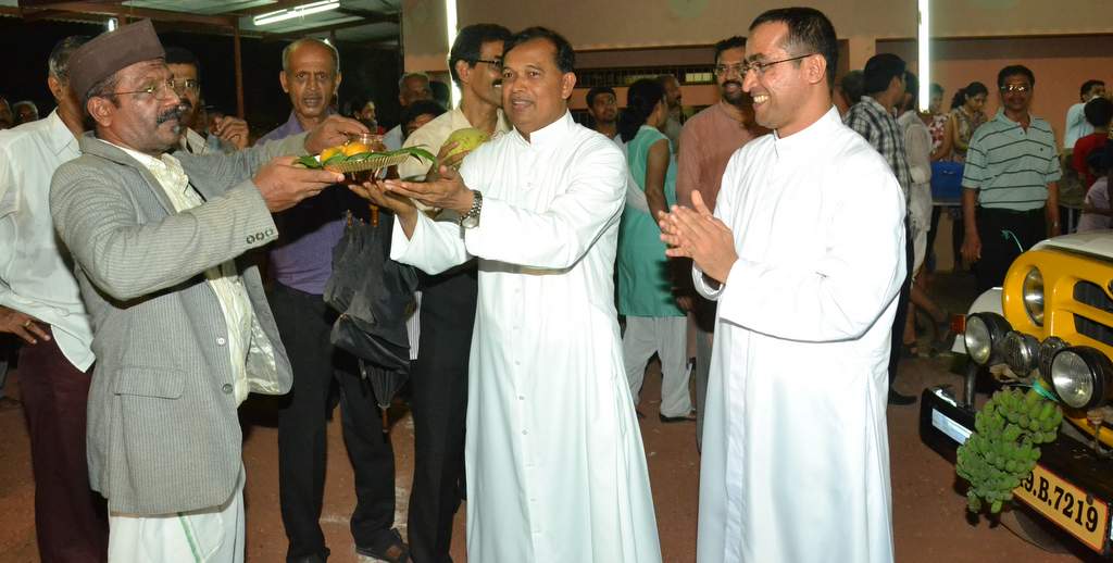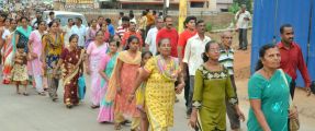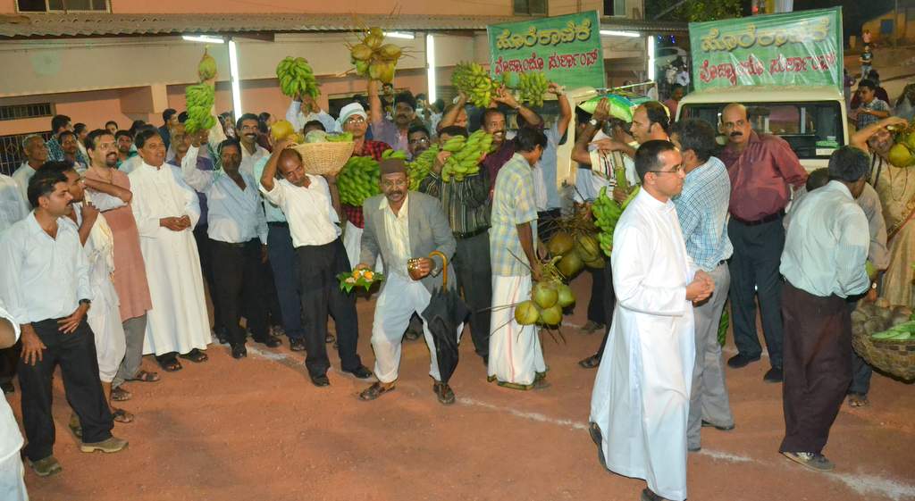The Vojhen procession on the eve of the Platinum Jubilee Celebrations of the Most Holy Redeemer Church, Derebail started from Konchady at 6 PM on Saturday, 26th April. About 600 Parishioners, young and old alike assembled at Konchady and marched in a procession accompanied by the Band and trucks full of Vojhen for the community dinner planned on Sunday, 27th April in culmination of the Platinum Jubilee Celebrations. The procession passed through the main road in front of the Church till the Kuntikan Junction and then turned to enter the School Grounds to a traditional welcome of Betel Leaves and Water by the Parish Priest, Rev. Fr. Peter D’souza and Assistant Parish Priest, Fr. Edwin Monis. The Vojhen items were then lowered from the trucks and gathered at the main cooking place in readiness for the cooking preparations slated to start at 7 AM on Sunday, 27th April at the Church Mini Hall.