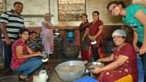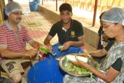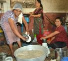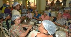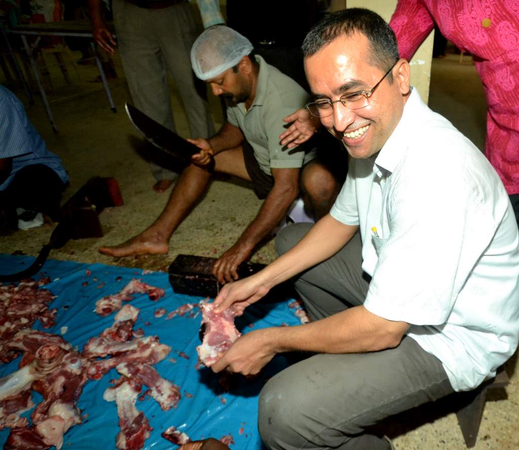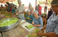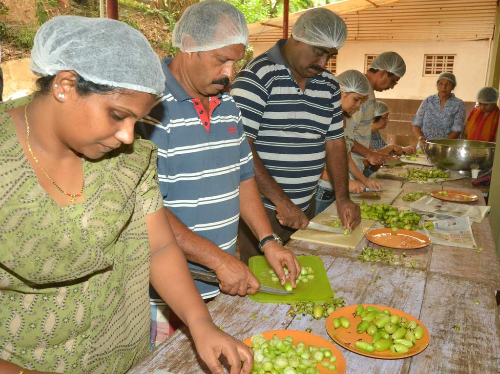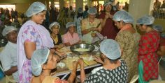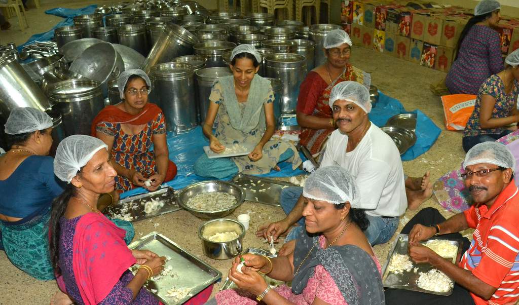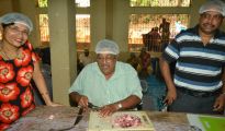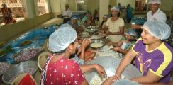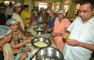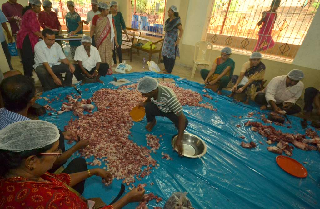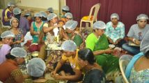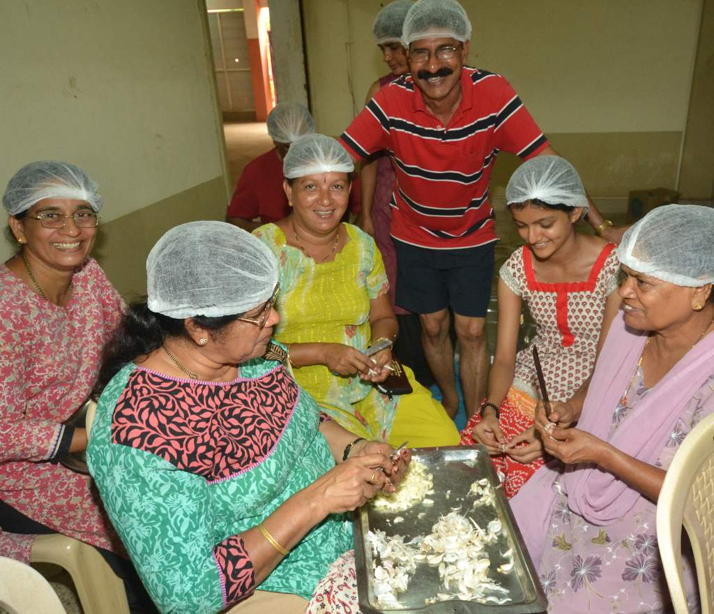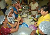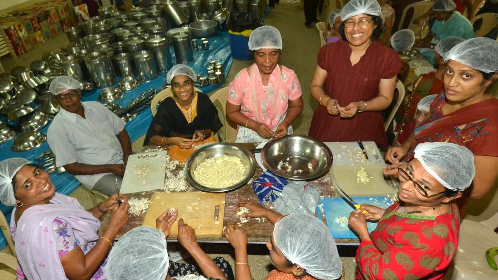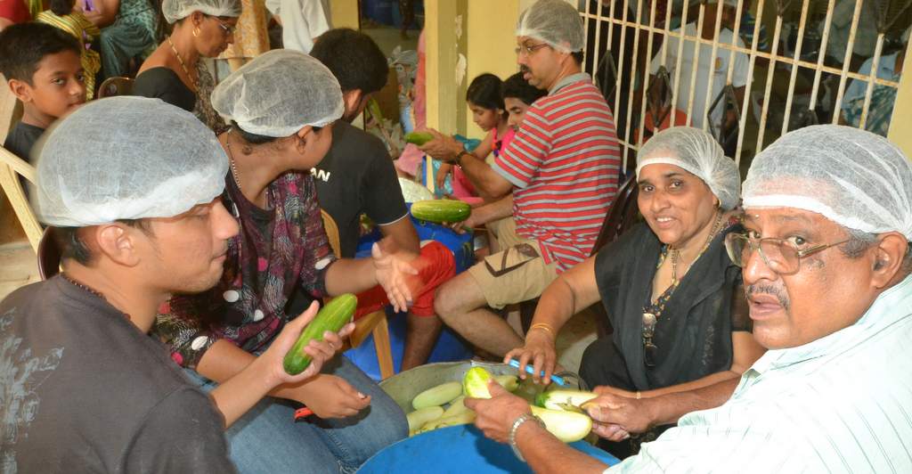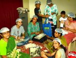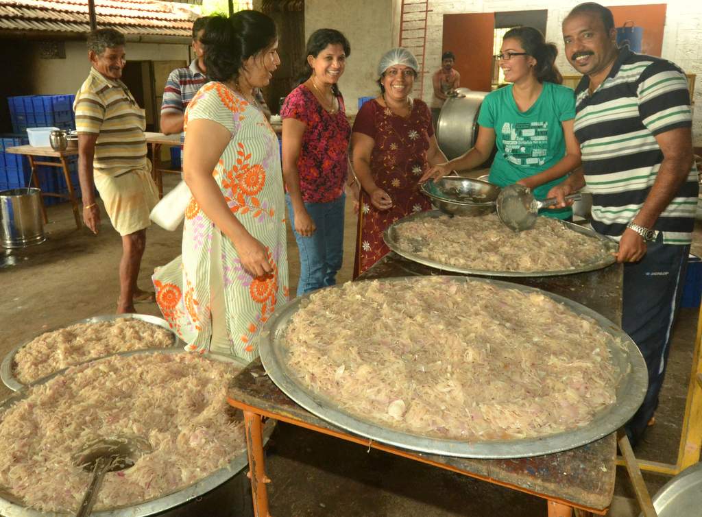 In no time, groups of Parishioners started to cut the pork for the Bafad while other groups starting peeling the onions, cleaning the ginger, slicing the green chillies, peeling the garlic and scraping the cucumber. Breakfast of Idly/Chutney/Sambhar was served along with piping hot tea to encourage the Parishioners. Some of the enthusiastic Parishioners took the initiative to sing old songs and made the atmosphere lively. Everyone volunteered and within a matter of few hours, all the chopping and cleaning was done. In parallel, at the cooking venue, a separate team was busy with grinding and doing the actual cooking.