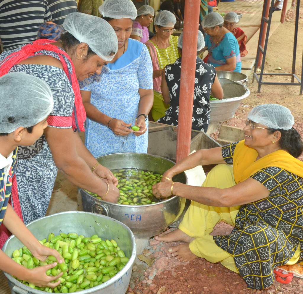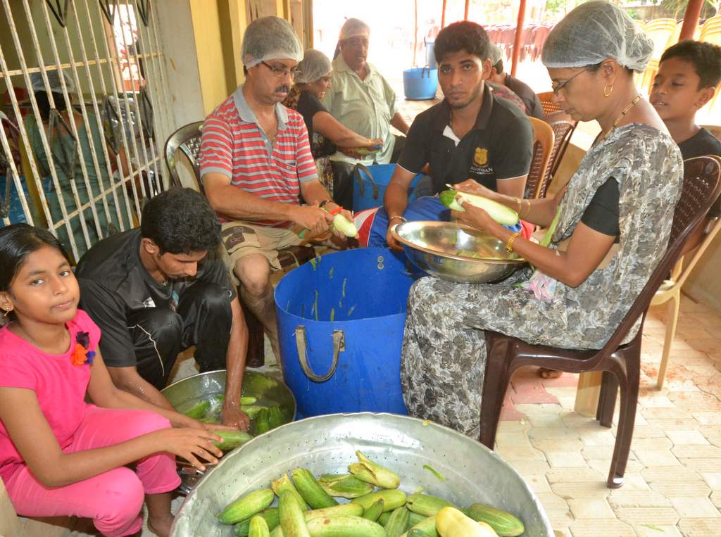 On 27th April, Sunday morning, even before 7 AM, a good number of parishioners gathered at the Parish mini hall to start the cutting and cooking for the evening celebration dinner. The Parish Priest, Rev. Fr. Peter D’souza led the gathering in prayer and then declared the preparations open. All, young and old, came equipped with cutting boards, knives, choppers, sharpeners and scrapers and proved they were adept at cleaning and cutting.