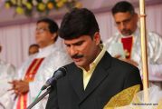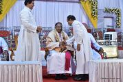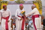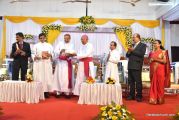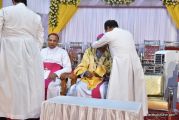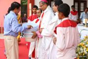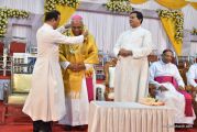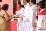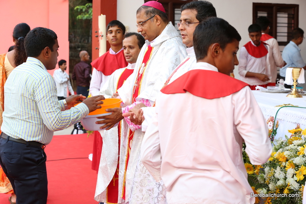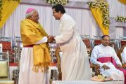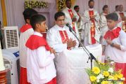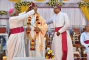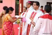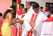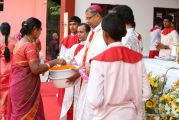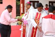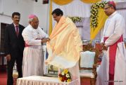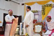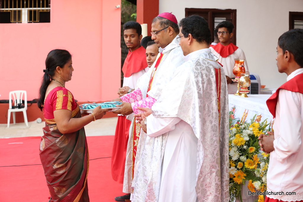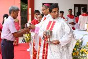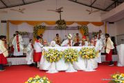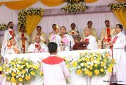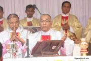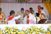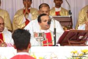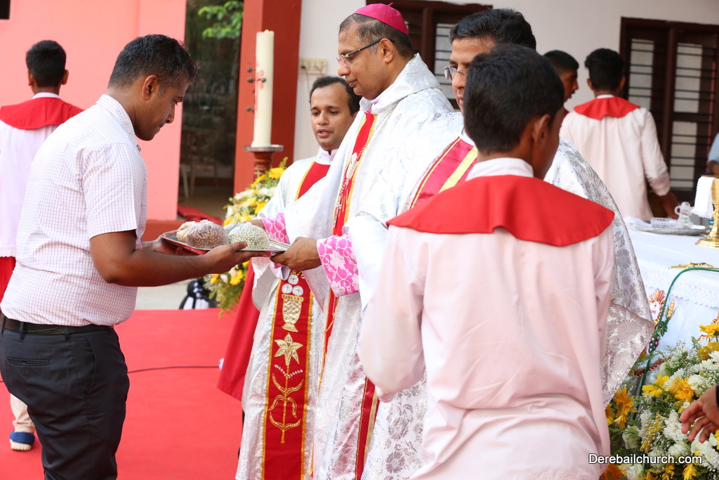 The Holy Eucharist Celebration began at 05:00 PM. Most Rev Dr Peter Paul Saldanha was the main celebrant. Altogether three Bishops and 14 Priests Celebrated the Holy Eucharist. Most Rev Dr Francis Serrao in his homily highlighted the significance and elaborated on the Celebrations of the day. He also defined the role of a priest and spoke on the mission that priest are bound to carry out. He added and explained the four blessed looks and concluded with poem on 'Beautiful hands of a Priest'. Later in the prayers of the faithful special intentions like prayer for the clergy, prayer for peace in our country and for those who died in the recent bomb blast in Sir Lanka were offered. Many offerings were brought by the parishioners. The Eucharistic Celebration was solemnized by a choir of about 100 parishioners.