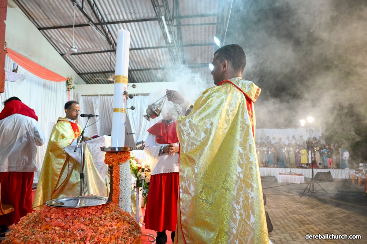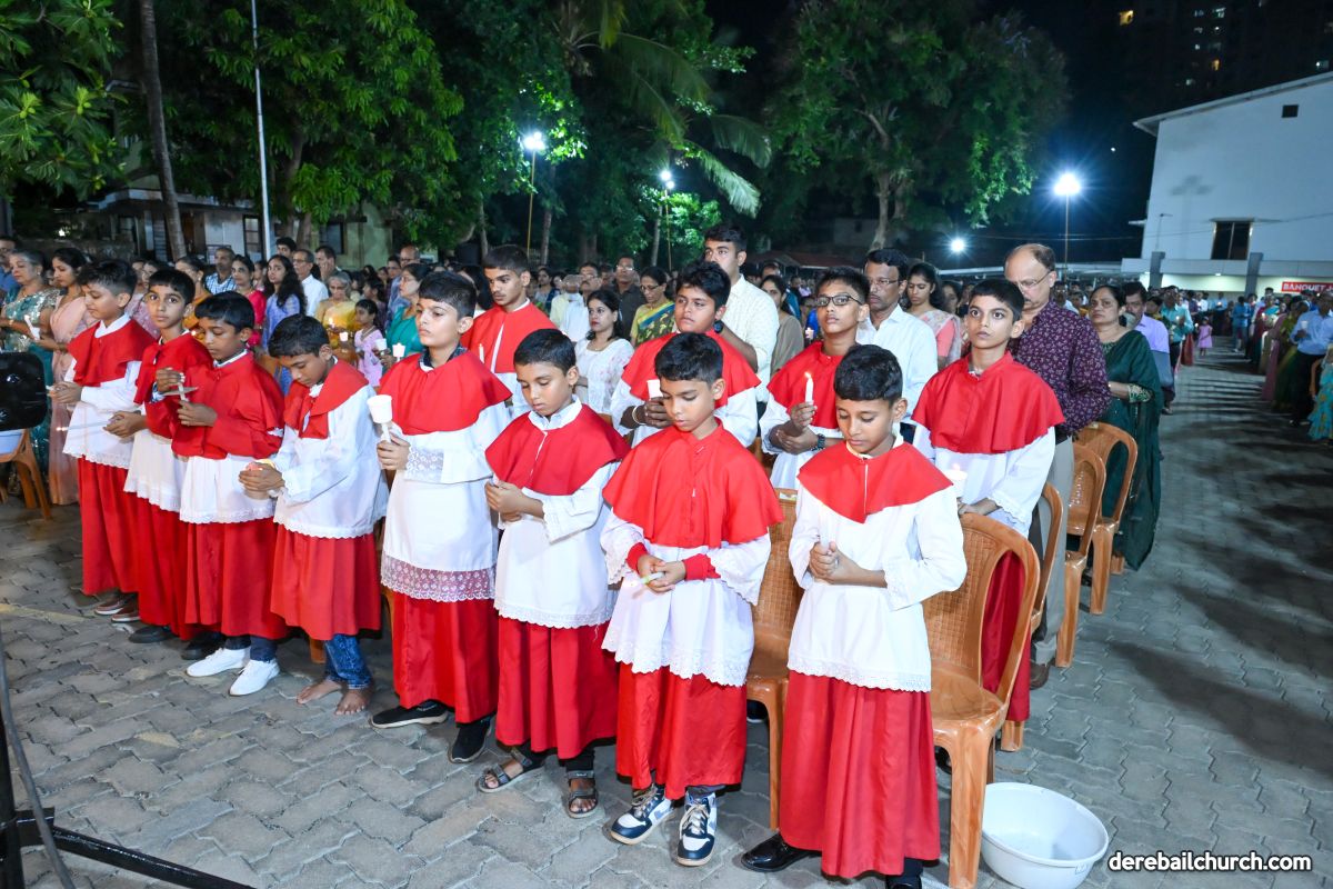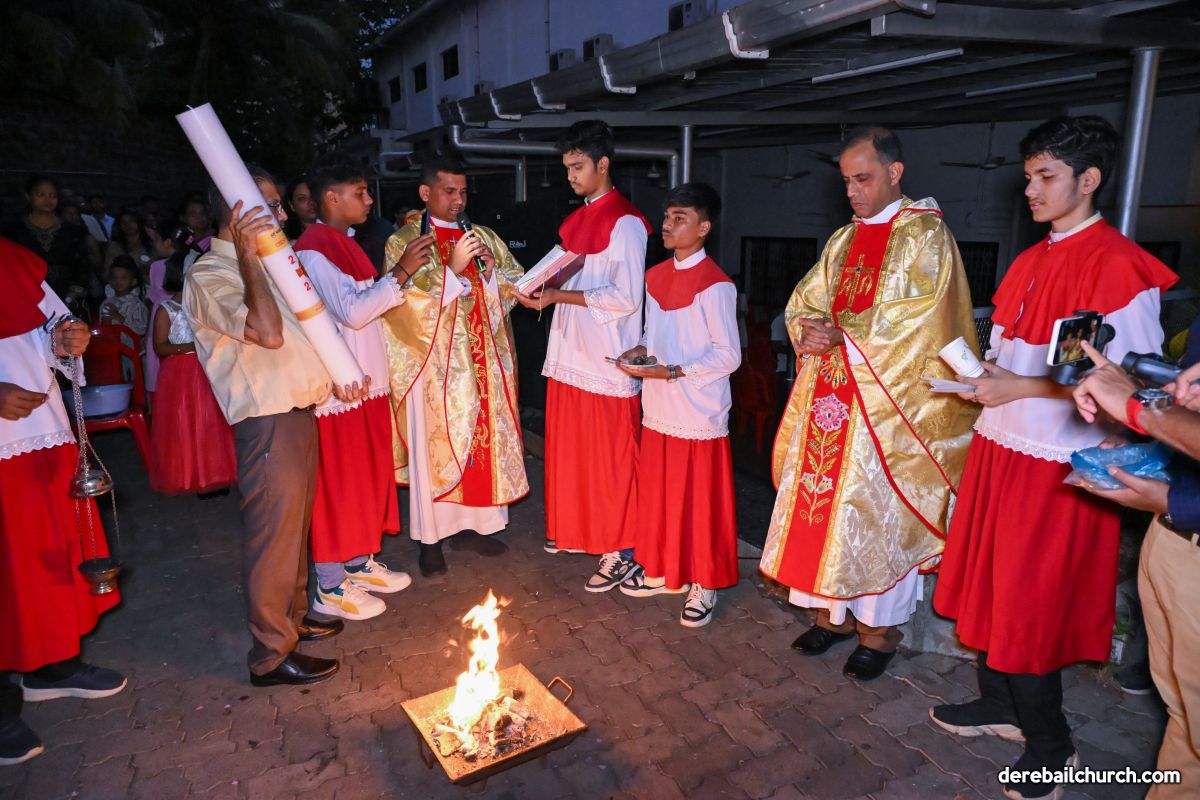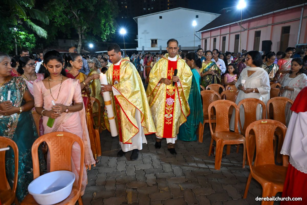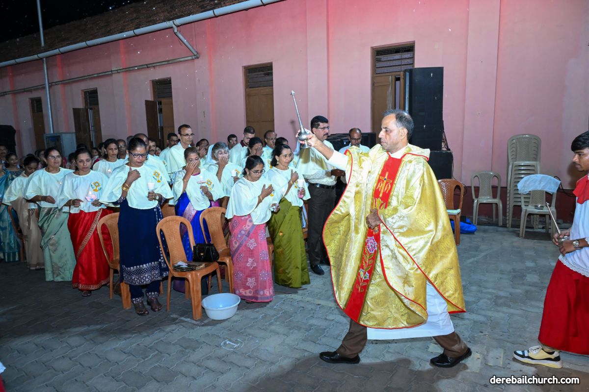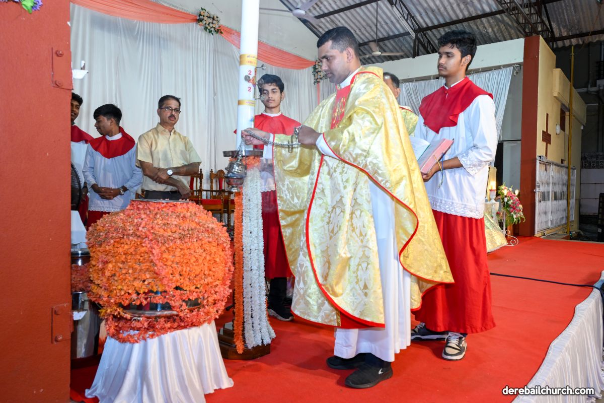 On March 19th, 2024, as twilight gave way to darkness, Most Holy Redeemer Church, Derebail, came alive with the spirit of Easter. At 7 PM, parishioners gathered in large numbers for the solemn Easter Vigil Mass.