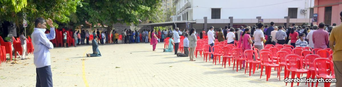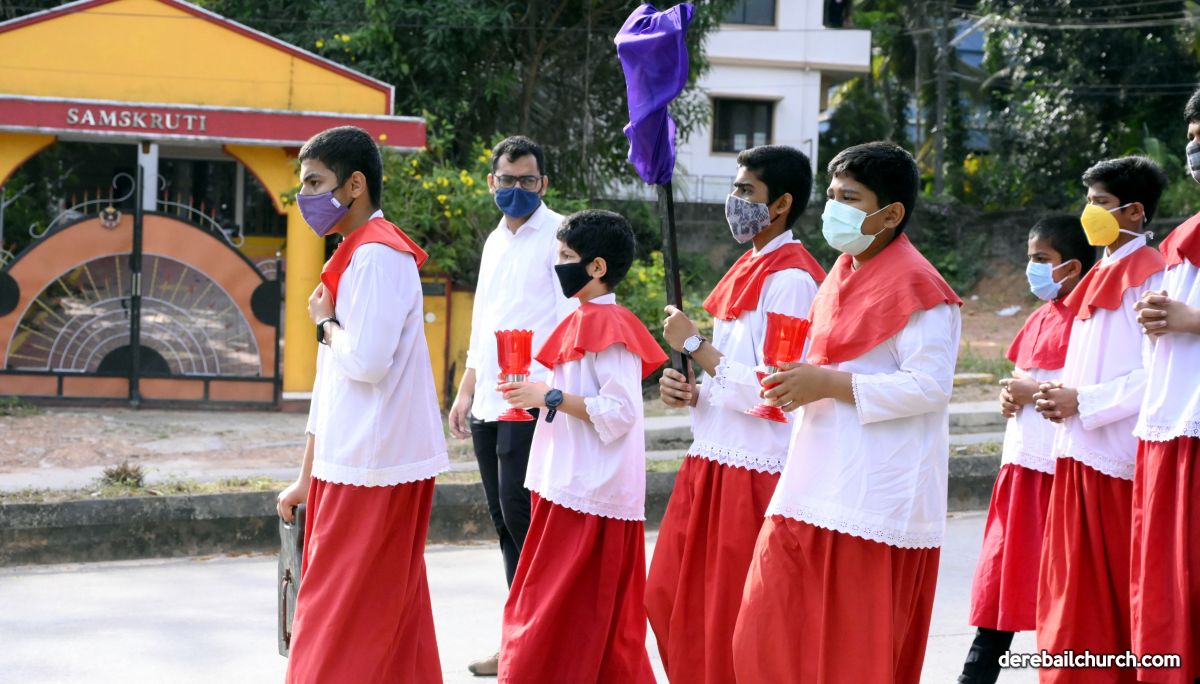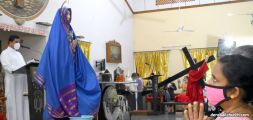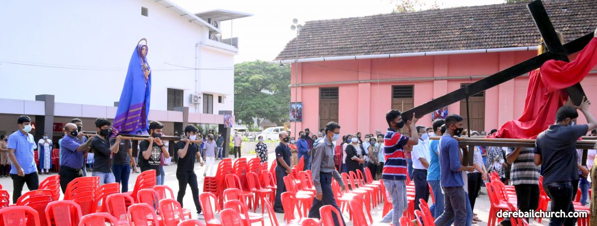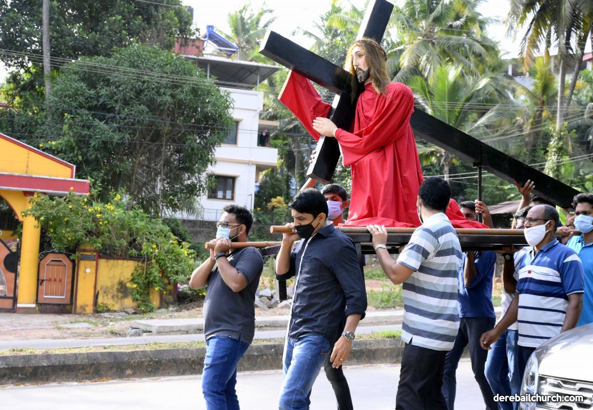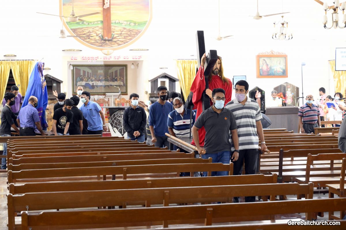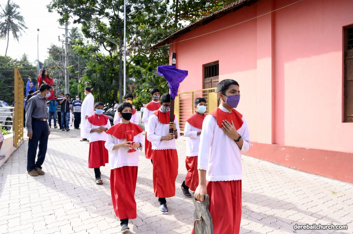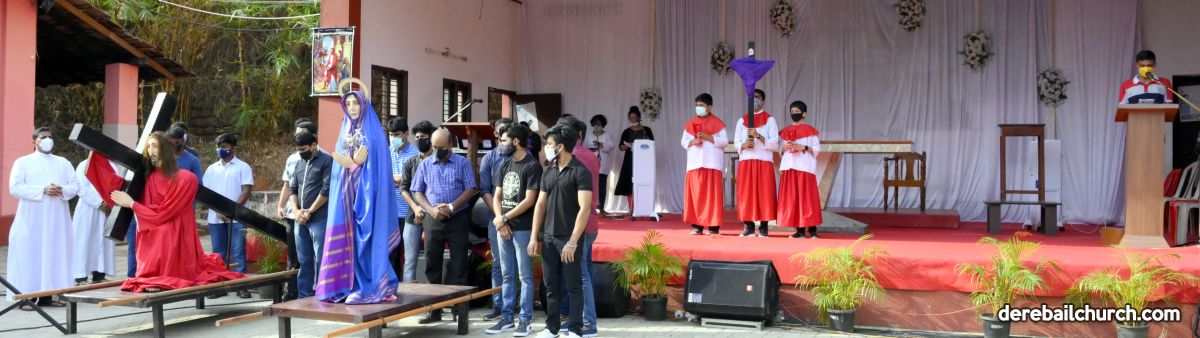 The Good Friday service at Most Holy Redeemer Church Derebail began at 8 AM with a prayer service. Rev. Fr. Austin Peres led the service where the devotees sang in unison Psalms and recited prayers. This was followed by the Way of the Cross at the Holy Family School Grounds. The Youth of the parish led the Way of the Cross. The parishioners took part in the commemoration of the Passion of Jesus with great devotion.